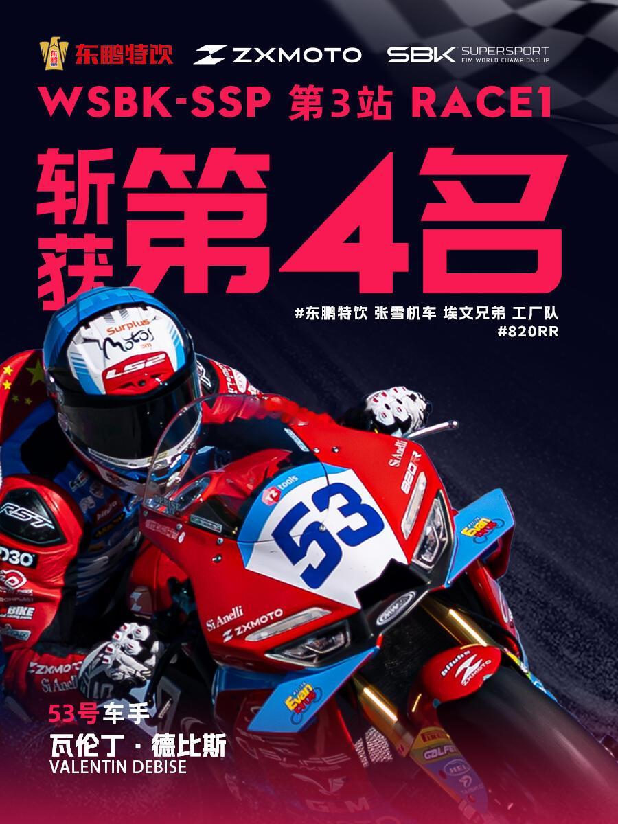 第三冲线!但是被罚到第四了,刚刚被BOP的赛车,这一站的成绩依然有领奖台的能力,张雪机车不是昙花一现,从老板到赛车再到车手,都是最好的状态,下一站加油!汽场全开张雪机车首回合第4