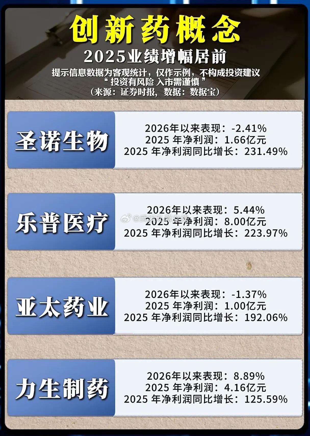 业绩翻倍、政策暖风频吹!创新药的“黄金时代”真的来了?2026年的创新药赛道,正在上演一场属于“长期主义者”的逆袭。从数据宝和证券时报统计的这份业绩榜单来看,16家创新药概念公司在2025年交出了净利润同比增幅超100%的亮眼答卷,其中上海谊众、北陆药业的增速更是突破500%,用实打实的业绩打破了市场对创新药“高投入低回报”的刻板印象。这些企业的爆发并非偶然。2026年4月国务院办公厅发布的《关于健全药品价格形成机制的若干意见》,为创新药行业吹来了久违的政策暖风——明确支持高水平创新药制定与高投入、高风险相符的价格,并享有5-7年的价格稳定期,这意味着“创新不集采”的时代正在加速到来。政策的松绑,让企业的研发投入终于能获得合理回报,三生国健28.99亿元的净利润、药明康德超190亿的利润规模,正是行业价值兑现的缩影。更值得关注的是,AI制药技术的成熟正在重塑行业的底层逻辑。2026年,AI制药从概念走向商业化落地,研发周期从传统的10-12年压缩至5-7年,成本降低超50%,这让中小创新药企也有了参与全球竞争的底气。比如榜单中的键凯科技、上海谊众,正是凭借技术迭代实现了业绩与股价的双向增长,前者2026年以来股价涨幅超24%,后者涨幅也接近20%。当然,行业分化也在加剧。尽管多数企业业绩翻倍,但仍有太极集团、康辰药业等个股今年以来股价出现回调,这也提醒投资者,创新药赛道早已告别“普涨时代”,真正能穿越周期的,是那些手握核心技术、拥有商业化能力的企业。从政策暖风到技术突破,再到业绩兑现,创新药行业正在迎来一次全面的价值重估。那些熬过寒冬、坚持研发的企业,正在用翻倍的业绩证明,中国创新药的黄金时代,或许才刚刚开始。