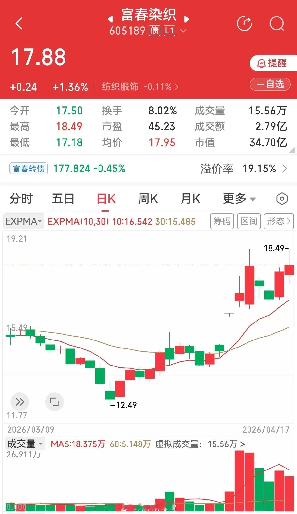 当博云新材因为业绩大增100倍而引发股价大涨的时候,你是不是有点心动。此时不敢追高,就想着寻找类似品种。业绩大涨股价还没狂奔的,也许就是你我的“梦中情人”。富春染织,一季度净利润同比增长1347%——1554%,什么概念,增长十几倍,虽然没有100倍那么夸张,但增长十几倍也不简单了。走势上看,底部上来也有了一定涨幅,目前是一个震荡整理形态,看样子是不是要回靠生命线呢?