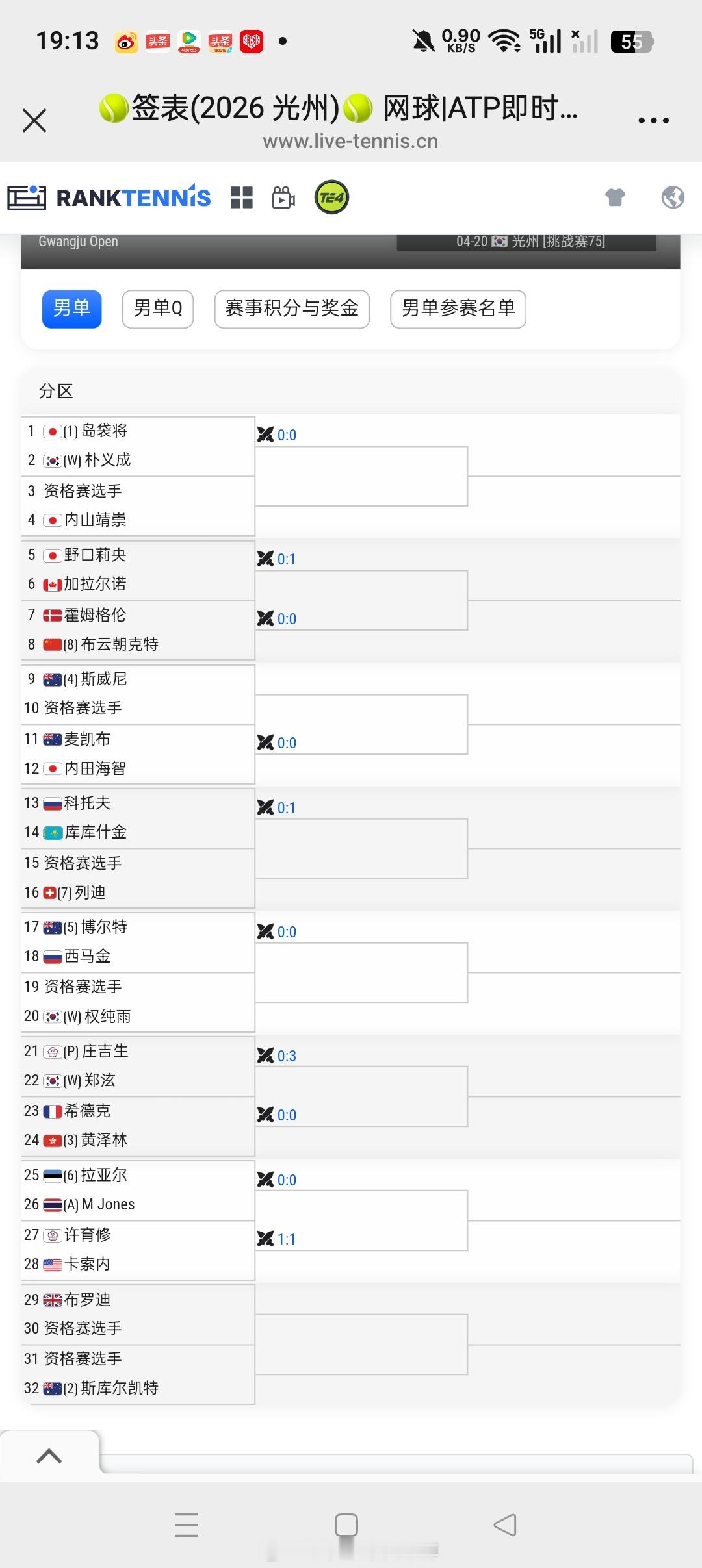 小花小草资讯 【🇰🇷光州挑战赛】男单正赛签表🇨🇳布云朝克特vs🇩🇰霍