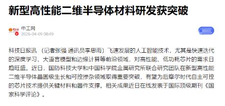 美国彻底坐不住了!西方封锁15年,中国突然宣布突破! 2026年4月9日,北京传来震动全球半导体产业的重磅消息:国防科技大学联合中科院团队,全球首次实现高性能P型二维半导体晶圆级量产。 这条消息一出,不仅瞬间引爆了国内科技圈,更是让远在大洋彼岸的美国半导体行业彻底坐不住了。 没人比美国更清楚,这项突破到底意味着什么。要知道,过去15年里,以美国为首的西方国家,在二维半导体领域对中国筑起了铜墙铁壁般的封锁。从材料配方、制备设备到核心技术,全链条严密封堵,别说核心专利和量产工艺,就连实验室级别的样品都严禁流入中国,甚至连相关领域的学术交流都层层设限。 他们之所以如此忌惮,是因为所有人都清楚,硅基芯片的时代已经走到了尽头。 如今的主流硅基芯片,制程已经逼近2纳米、1纳米的物理极限,再往下突破,就会面临无法解决的漏电、发热问题,摩尔定律早已走到了失效的边缘。 而二维半导体,这种厚度仅有原子级别的新型材料,凭借着超高的电子迁移率、极强的栅控能力和极低的功耗,被全球半导体行业公认为后摩尔时代的终极解决方案,是下一代先进芯片的核心命脉。 可这条通往未来的赛道,有一个困扰了全球科研界十几年的死穴。 芯片里的晶体管,必须要有N型和P型两种半导体配对才能工作,就像汽车的左右轮、电池的正负极,缺一个就彻底无法运转。 过去这些年,N型二维半导体的技术早已成熟,中国也早已实现了自主突破,可高性能P型二维半导体,却成了全行业的世界级难题——要么材料性能不达标,无法满足芯片制造的需求,要么只能在实验室里造出指甲盖大小的碎片,根本无法实现晶圆级量产,更谈不上商业化应用。 美国、日本、欧洲的顶尖实验室和半导体巨头,砸了上千亿美金,耗了整整15年,都没能跨过这道坎。他们甚至放话,没有西方的技术支持,中国想要实现高性能P型二维半导体的晶圆级量产,至少还要再等十年。 可他们万万没想到,自己死死守住的技术壁垒,就这么被中国团队一举击穿了。 这次国防科大与中科院的联合团队,独创了液态金/钨双金属薄膜为衬底的化学气相沉积方法,不仅全球首次实现了单层氮化钨硅这种高性能P型二维半导体的晶圆级可控生长,更把材料的单晶畴区尺寸提升到了亚毫米级别,生长速率比此前全球文献报道的最高值,整整高出了3个数量级,也就是1000倍。 更关键的是,这项技术实现了掺杂浓度的精准可调,能在宽范围内连续调控材料的电学性能,同时还保留了优异的化学稳定性,各项综合性能,都稳居全球同类材料的顶尖水平。 这不是实验室里的PPT成果,是实打实的量产级突破,直接打通了下一代二维半导体芯片从实验室走向产业化的最关键堵点。 消息传到美国,整个半导体行业一片哗然。要知道,美国之所以能掌控全球半导体霸权,靠的就是在核心材料、先进制程上的绝对垄断,靠着一代代的技术代差,收割着全球芯片市场的超额利润,更靠着技术封锁,牢牢卡住其他国家高端制造、人工智能、国防科技等关键领域的脖子。 过去这些年,他们靠着封锁EUV光刻机,在硅基芯片赛道上处处给中国设限,以为这样就能永远把中国锁在半导体产业链的中低端。可他们怎么也没想到,中国根本没有困在他们划定的赛道里死磕,反而直接换道超车,在下一代芯片的核心赛道上,率先冲过了量产的终点线。 这项突破,意味着中国在二维半导体这条未来赛道上,第一次掌握了绝对的主动权。我们再也不用被光刻机、被西方的专利壁垒卡着脖子,完全可以靠着自主可控的材料体系,搭建起一套全新的先进芯片产业链,直接向1纳米以下的制程节点发起冲击。 那些曾经跟着美国一起封锁中国的西方国家,如今也彻底慌了神。他们封锁了15年,不仅没能困住中国,反而逼出了中国的自主创新,让中国在下一代半导体的核心领域,站到了全球的最前列。 这从来都不是运气,而是中国科研人员在重重封锁下,日夜攻关、一步一个脚印闯出来的结果。 美国最不想看到的局面,终究还是发生了。他们以为封锁就能挡住中国科技前进的脚步,却忘了,封锁从来都压不垮中国的创新,只会让我们更坚定地走科技自立自强的道路。 这次P型二维半导体的量产突破,只是一个开始。未来,中国半导体行业,必将在下一代芯片赛道上,创造更多让世界瞩目的奇迹。