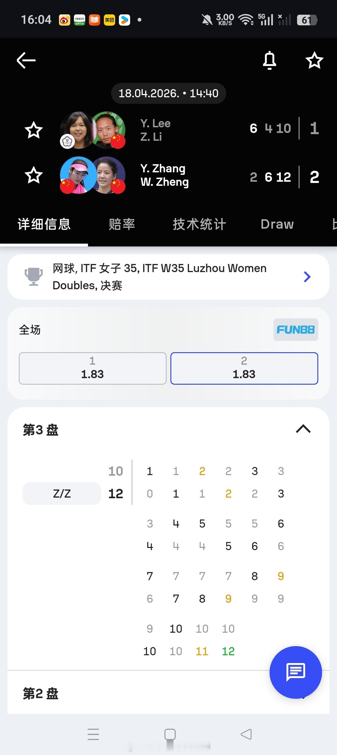 即时排名张莹303(+3)郑妩双169李宗钰216(+2)