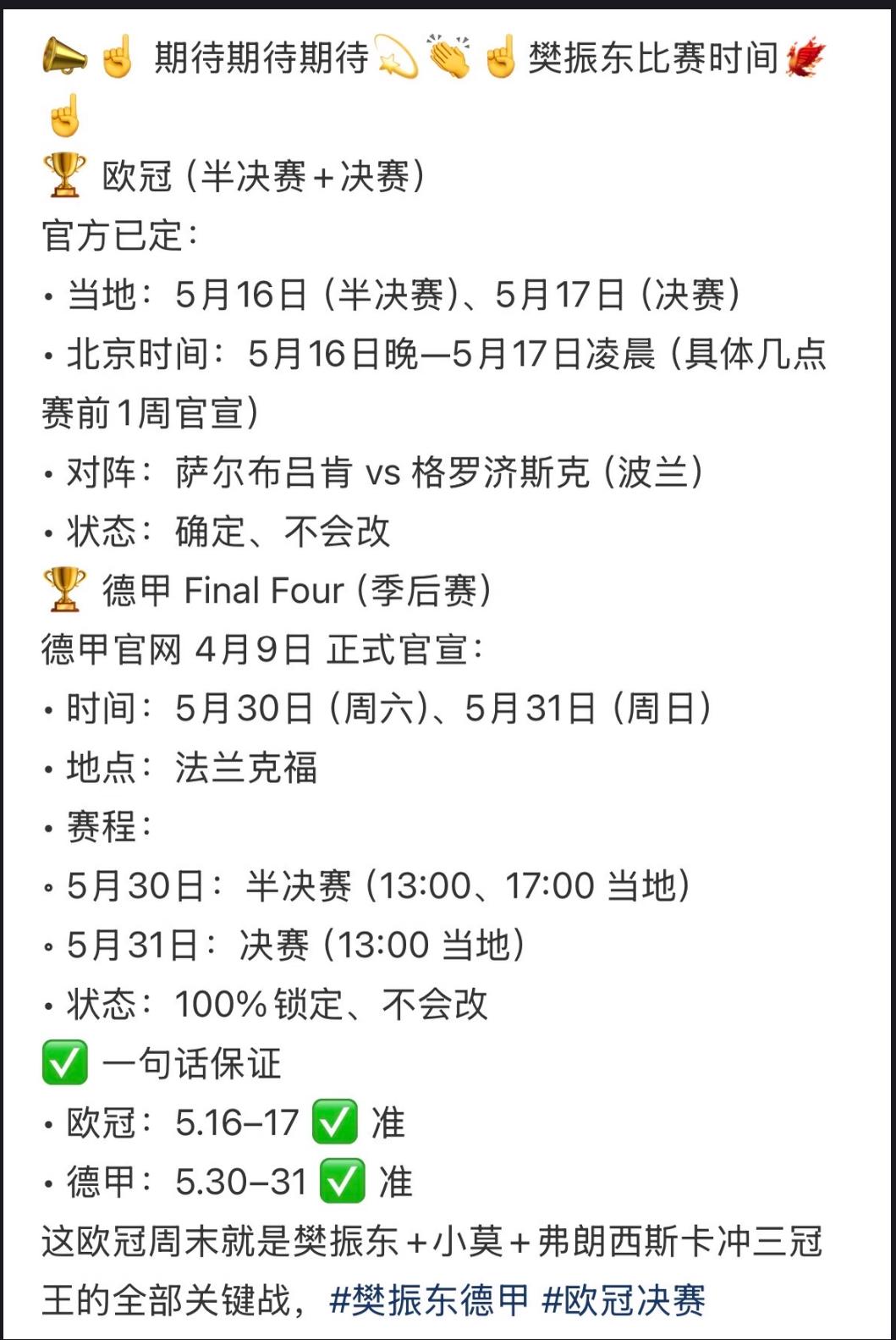 樊振东5月份的德甲及欧冠的赛程安排 樊振东所在的萨尔布吕肯已经打进 德甲季后赛四强, 和欧冠四强。 萨尔布吕肯官方宣布, 欧冠半决赛和决赛将于 5月16日晚至17日凌晨进行, 半决赛萨尔布吕肯VS格罗济斯克 萨尔布吕肯打欧冠一定很精彩, 欧冠莫雷加德与樊振东, 弗朗西斯卡并肩作战, 一定战无不胜! 德甲季后赛已经安排在欧冠比赛 后面,5月30日至31日举行 半决赛和决赛! 樊振东4月18日与老朋友波尔 一起到日内瓦休息调整, 东哥状态不错👍, 尽管国内舆论纷纷, 但看起来樊振东没有受到影响, 其实樊振东尽己所能, 努力打球, 在国外打球也是推广乒乓球运动的积极方式,保持初心,打纯粹的球, 促进中德文化交流, 也做出了自己的贡献…….