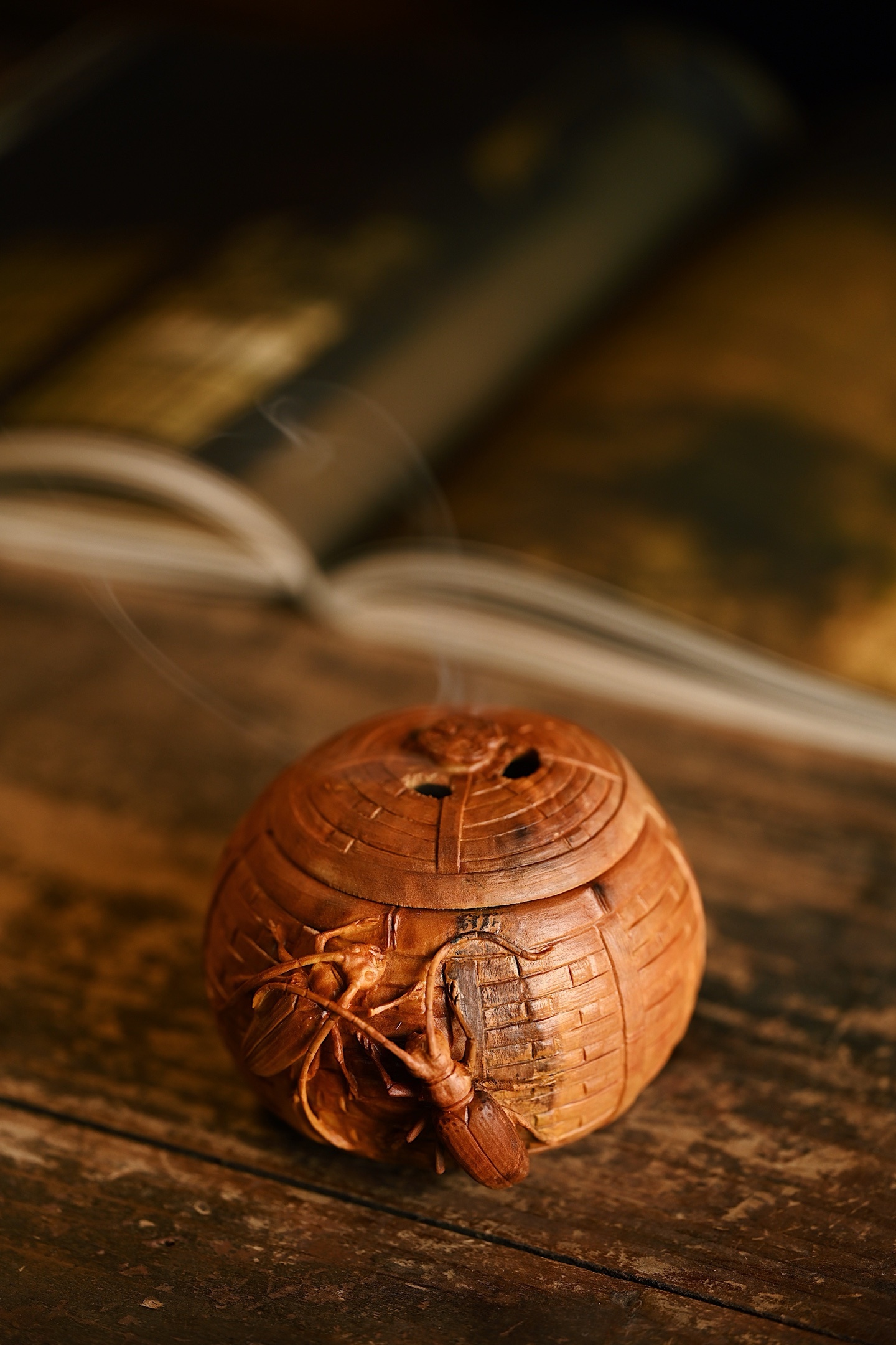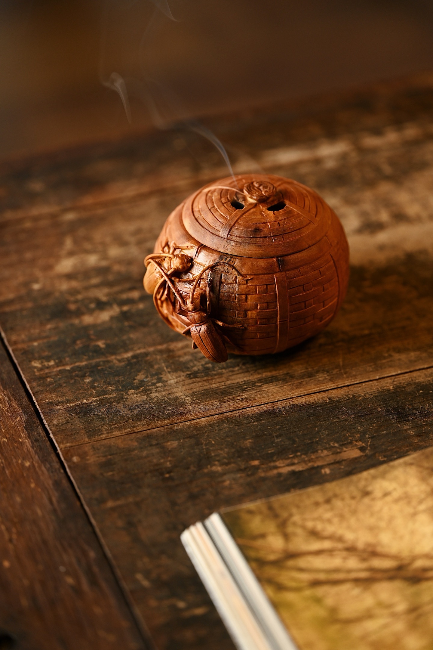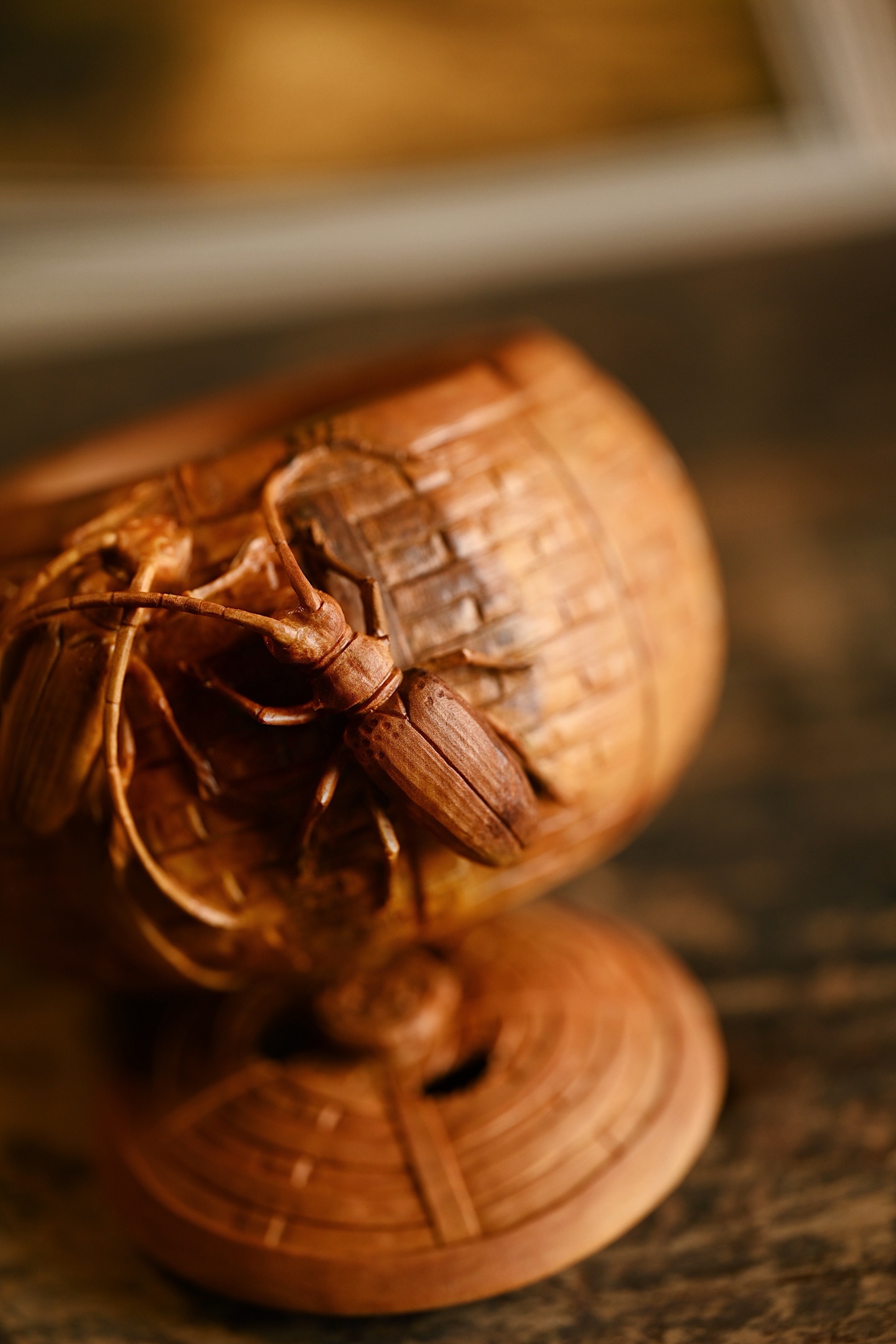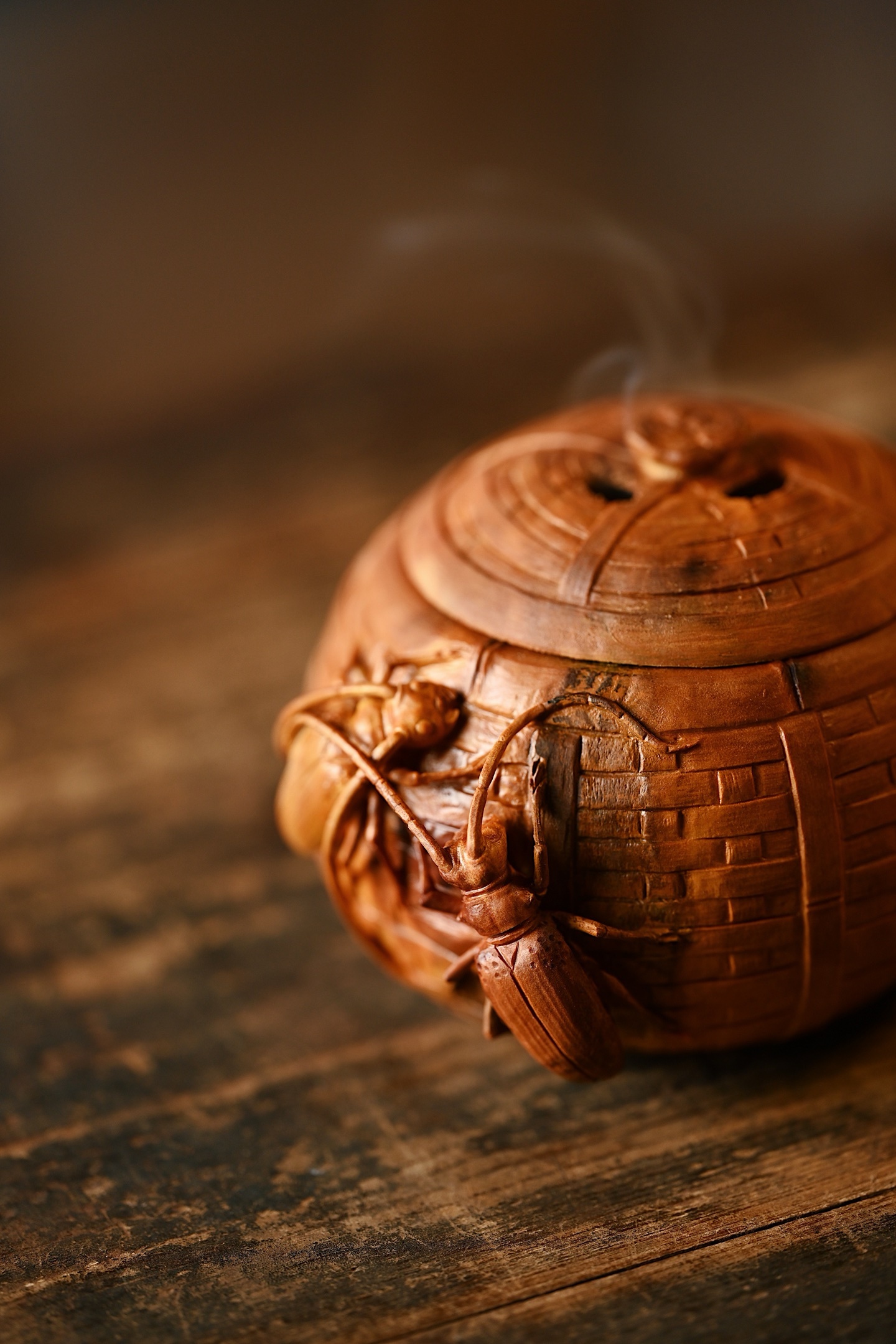 整雕为竹篓之形,器壁仿竹编纹理,一丝不苟,外壁浮雕双天牛,触须舒展,翅甲分明,神态生动传神。天牛有“富甲一方、节节高升”之吉意,竹篓则象征“聚财纳福”,置于案头,焚香清供,雅趣盎然。