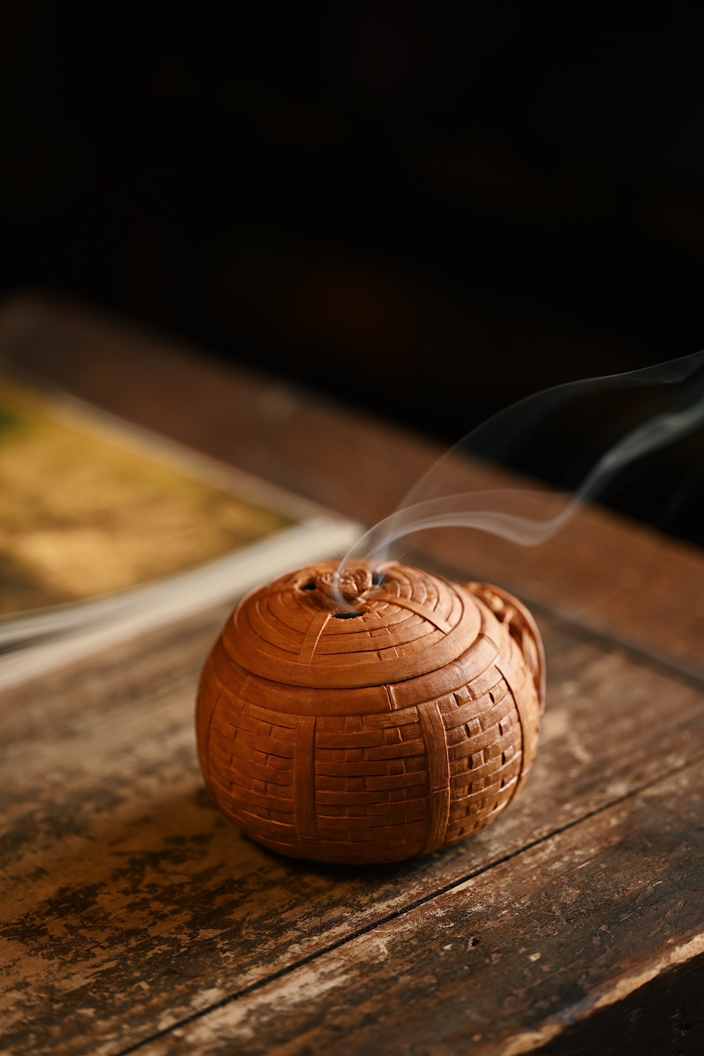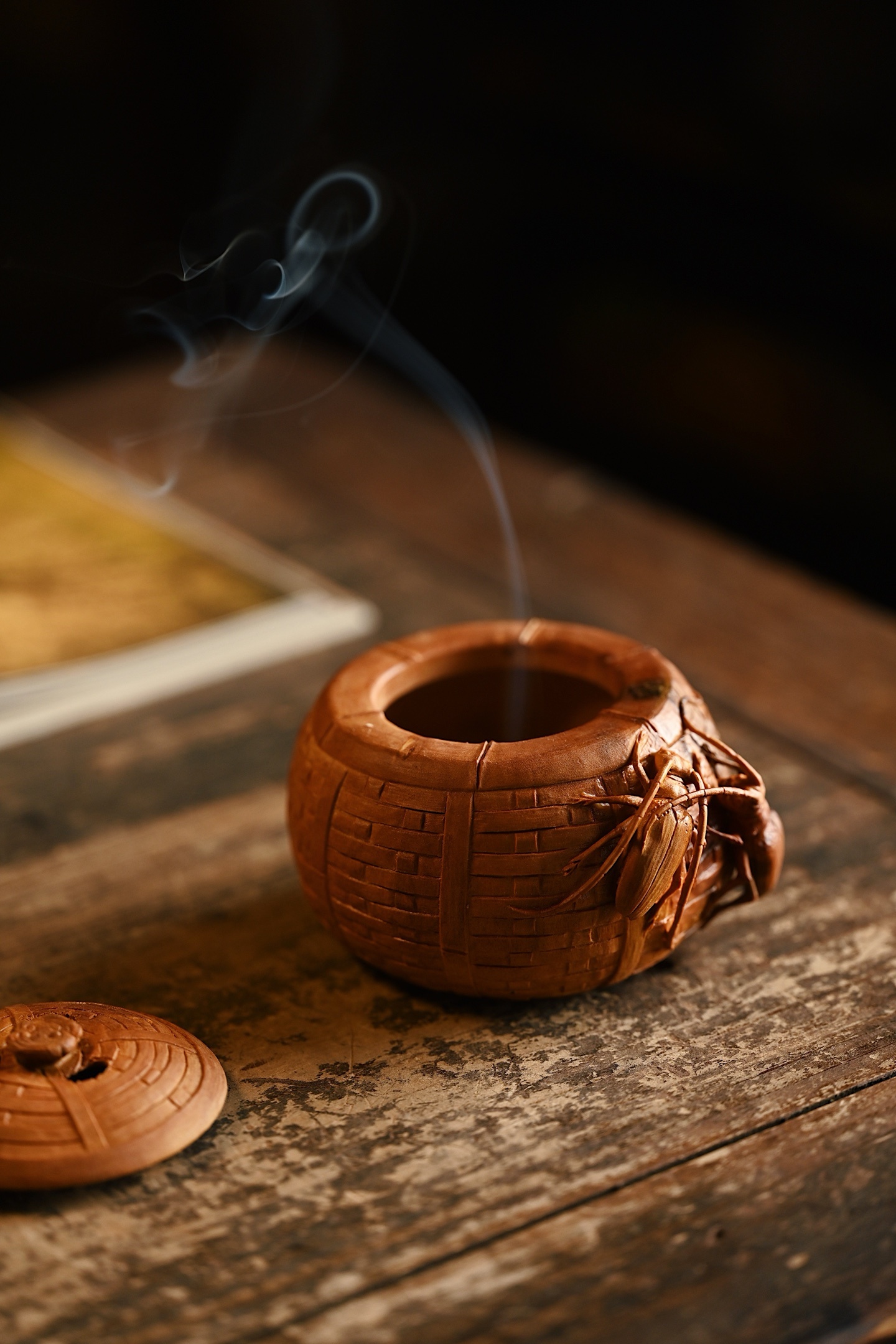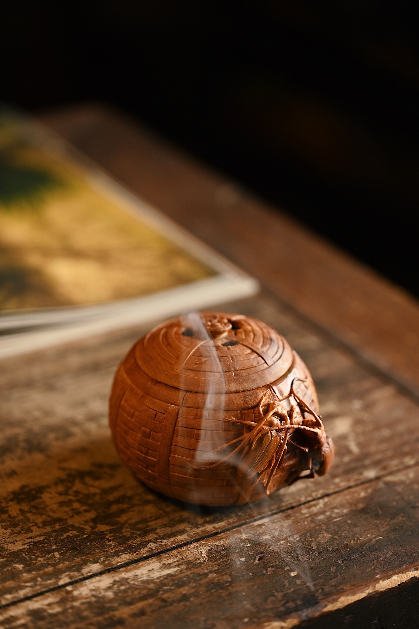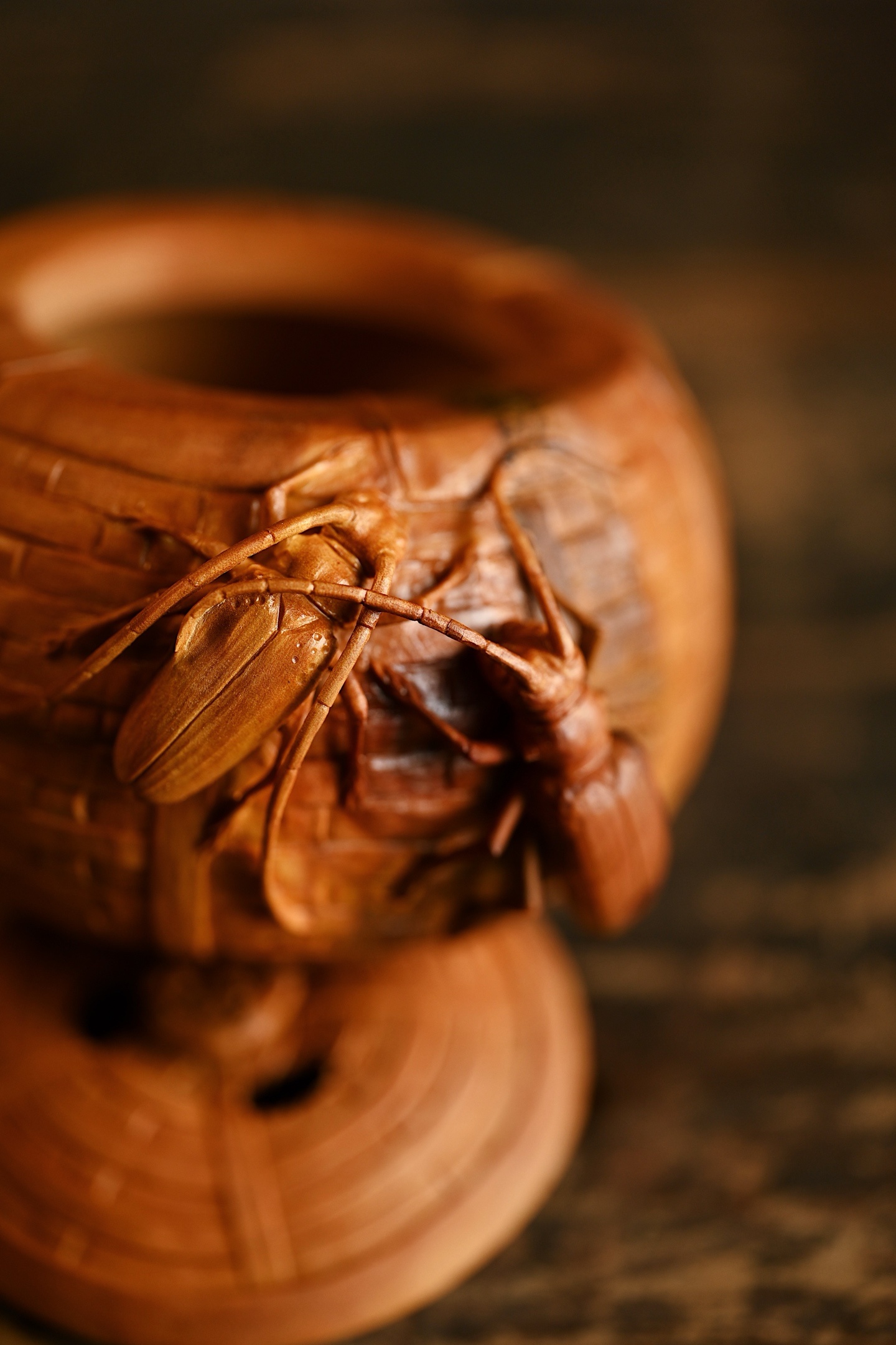 整雕为竹篓之形,器壁仿竹编纹理,一丝不苟,外壁浮雕双天牛,触须舒展,翅甲分明,神态生动传神。天牛有“富甲一方、节节高升”之吉意,竹篓则象征“聚财纳福”,置于案头,焚香清供,雅趣盎然。