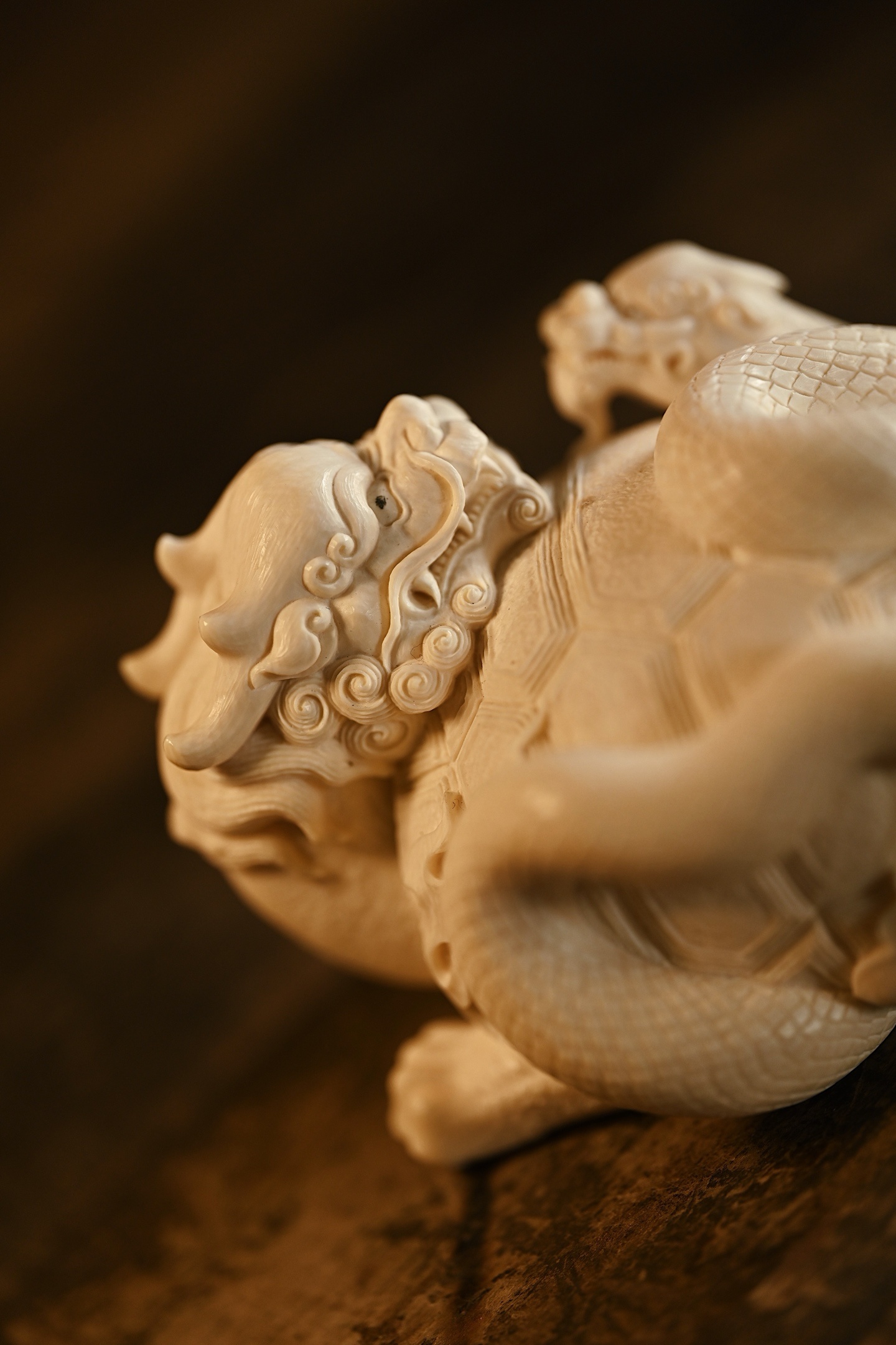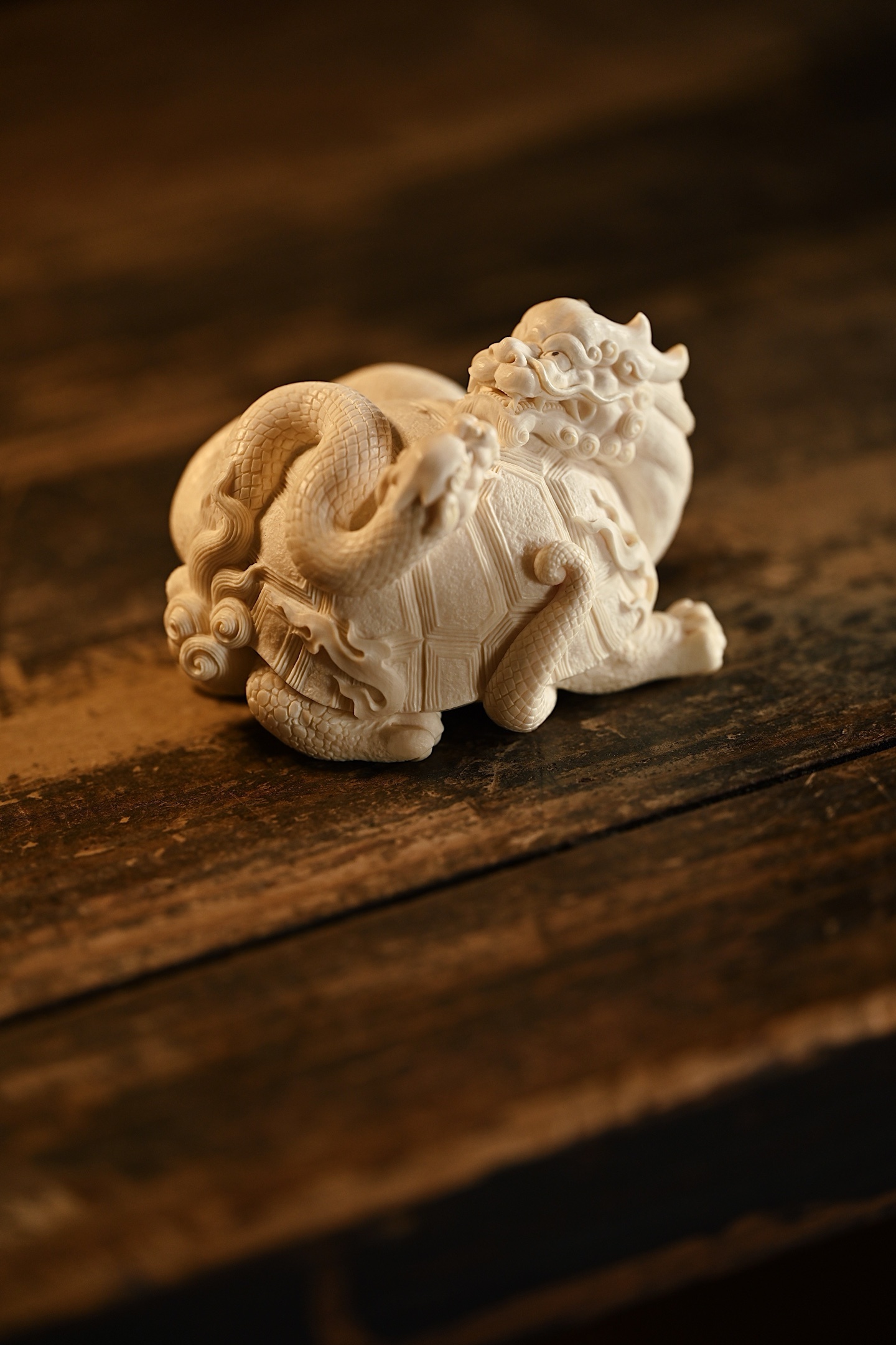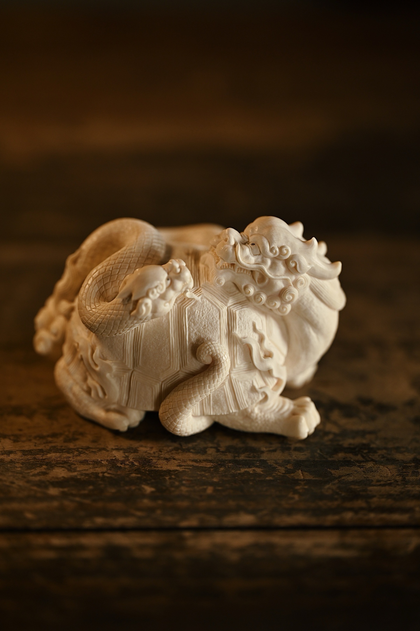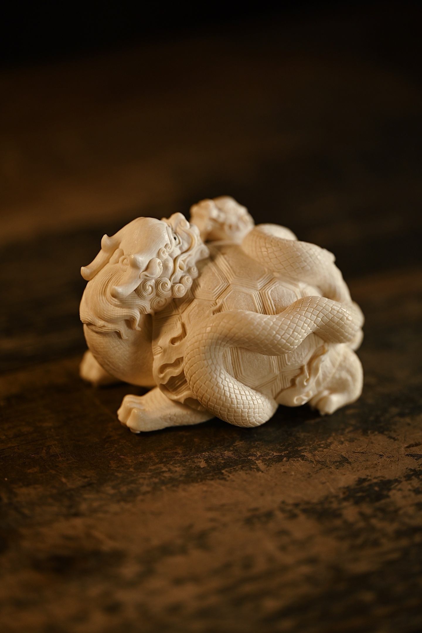 玄武为四象之一,主北方、司水德,象征长寿稳固、镇宅纳福。雕工线条劲挺流畅,龟甲鳞纹排布细密规整,蛇身盘绕灵动自然,龙首威严而不失气韵,四肢遒劲,尽显神兽之威仪。