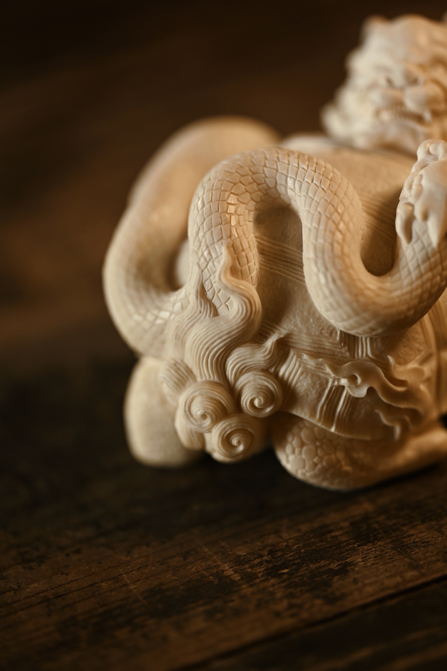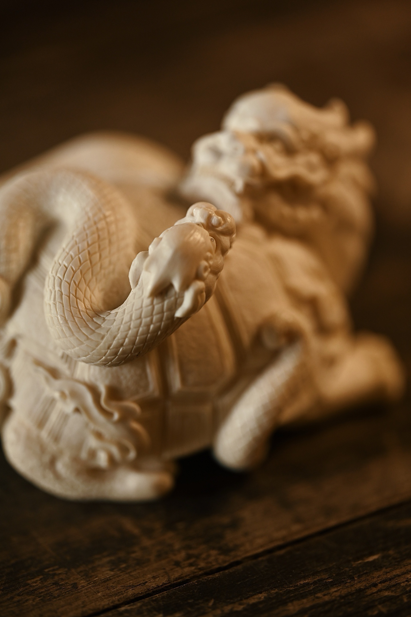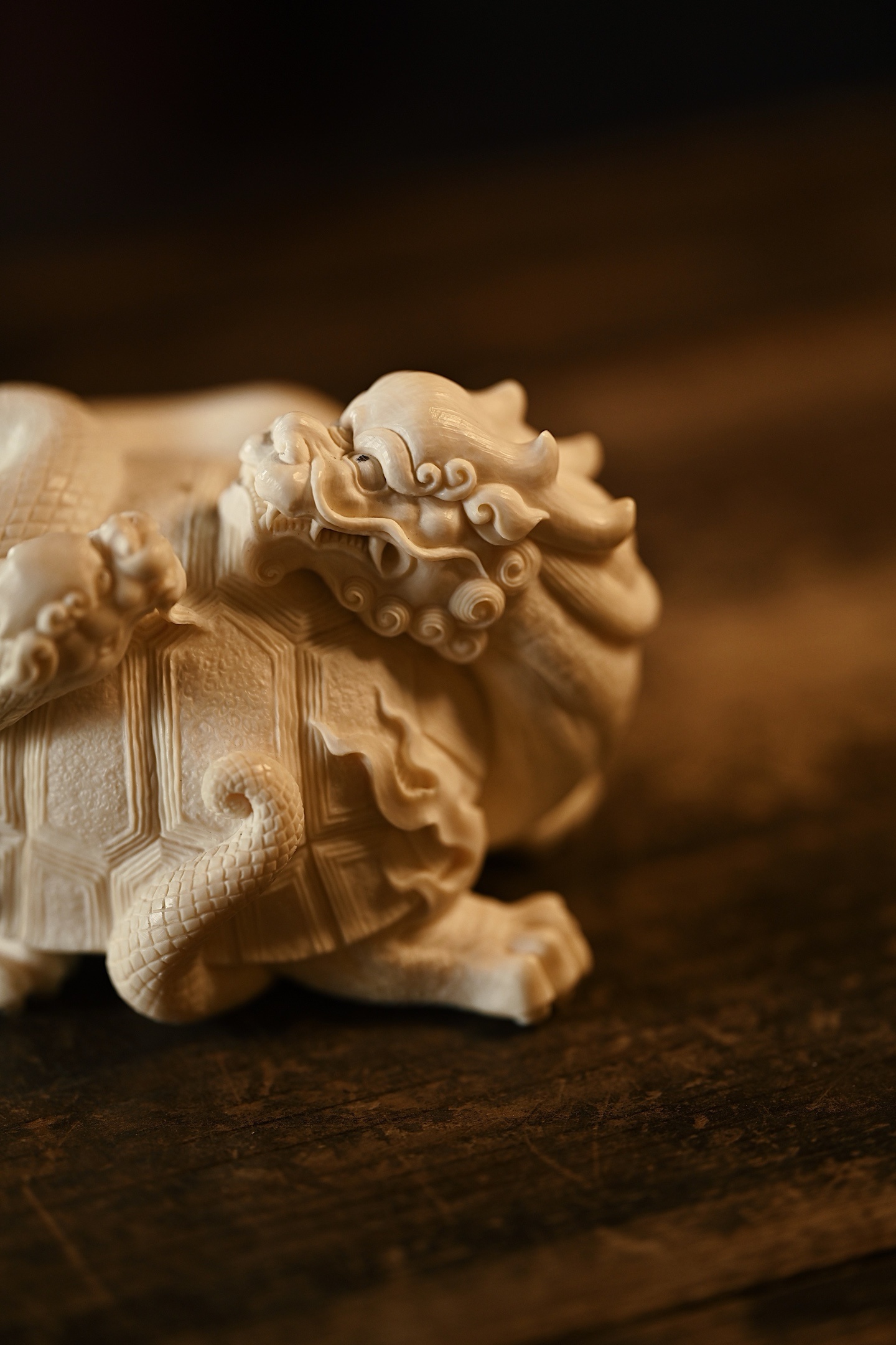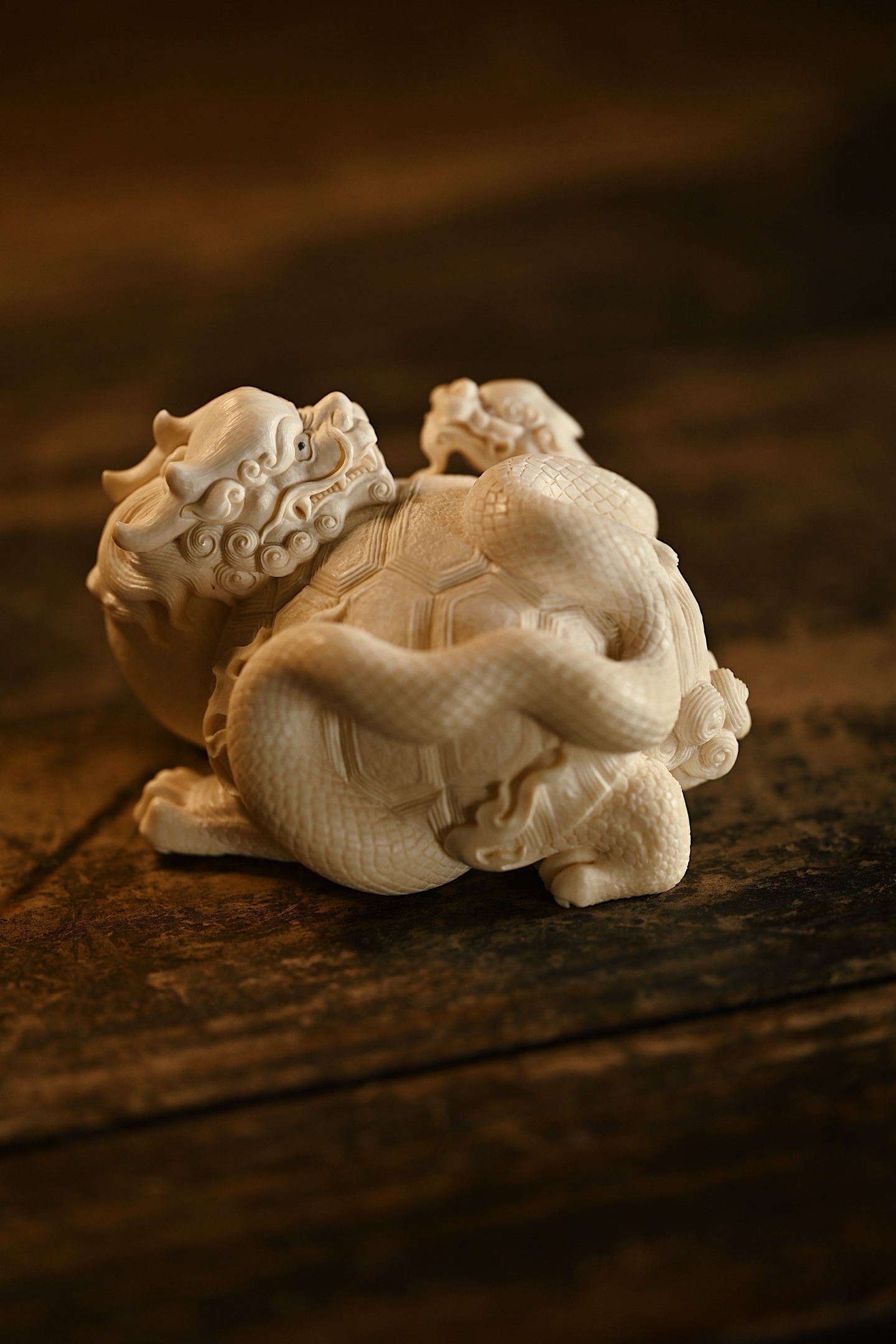 玄武为四象之一,主北方、司水德,象征长寿稳固、镇宅纳福。雕工线条劲挺流畅,龟甲鳞纹排布细密规整,蛇身盘绕灵动自然,龙首威严而不失气韵,四肢遒劲,尽显神兽之威仪。