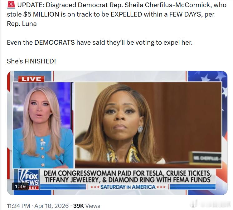 声名狼藉的民左党众议员希拉·切菲卢斯-麦考密克,因窃取500万美元而面临被驱逐的命运。据众议员安娜·保利娜·卢娜透露,她将在几天内被逐出国会。