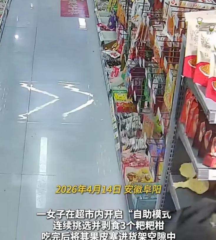 气笑了!女子进超市连吃3个耙耙柑,还把果皮藏在货架后方。店主:试吃没关系,但她临走又带走1个没结账。 事情发生在2026年4月14日,那天一个穿得普普通通的女人,走进了一家开了十几年的超市,看她的样子,大概就是去买些日常蔬菜,谁也没料到,她接下来不到二十分钟的时间里,能做出一连串让人匪夷所思的事,连开了十几年店、见多识广的老板,都直呼“长见识了”。 她一进超市,就径直走到了水果摊前,没有丝毫犹豫,拿起一个耙耙柑,就利落地剥开外皮吃了起来,吃得津津有味,汁水顺着手指往下流,吃相十分豪放,一个吃完还不过瘾,她又拿起第二个、第三个,一口气就炫了三个耙耙柑,全程没有丝毫不好意思,仿佛那些水果本来就是她自己的。 吃了三个耙耙柑,问题就来了,吃完的果皮该往哪儿扔?按理说哪怕是嘴馋想多试吃几口,正常人都会顺手把果皮丢进旁边的垃圾桶,既方便又体面,可这位大姐偏不按常理出牌,仿佛扔垃圾桶是件很麻烦的事。 她左右环顾了一下四周,确认没人注意自己,就弯腰蹲下身,小心翼翼地把那堆剥好的橘子皮,一点点塞进了货架最深处的缝隙里,塞得严严实实,生怕被人发现,那认真的样子,好像在做什么天大的秘密,连老板后来看监控的时候都懵了,说她弯腰藏果皮的时间,比剥橘子吃的时间还要长。 藏完果皮她还若无其事地拍了拍手,整理了一下衣服,跟没做过任何事一样,继续在超市里逛着,仿佛刚才藏果皮的人不是她,其实超市老板本来真没打算计较,开门做生意这么多年,碰上嘴馋、多试吃两口的顾客太正常了,三个耙耙柑,也值不了几个钱,犯不着因为这点小事大动干戈,影响生意。 可接下来发生的事,直接让老板的容忍度降到了零,也彻底改变了这件事的性质,这位大姐在超市里逛了一圈,吃饱喝足之后,路过收银台的时候,眼皮都没抬一下,压根没有要付款的意思,仿佛刚才吃的三个耙耙柑跟她没关系。 就在她快要走出超市门口的时候,又停下了脚步,转头看了看水果摊,趁没人注意顺手从摊上拿起一个耙耙柑,大大方方地揣进了自己的口袋里,然后头也不回地走出了超市,全程没有丝毫遮掩,也没有主动付款,明摆着就是想白拿。 从一口气吃三个,到藏果皮,再到临走顺走一个,这一步步下来,性质就完全不一样了,前头那三个,就算说得委婉点,还能算是过度试吃,顶多是贪嘴,可这第四个,绕过收银台,偷偷揣进兜里带走,没有付一分钱,那就是赤裸裸的偷窃,跟试吃没有半点关系。 老板发现这件事后,心里特别堵得慌,他本来想着,大家都是街里街坊的,低头不见抬头见,给她留点面子,没必要把事情做得太绝,可这位大姐倒好,不仅连吃带拿,还特意藏起果皮,一副想蒙混过关的样子,换做是谁估计都忍不了。 无奈之下老板只好调出超市里的监控,对着镜头说了一句提醒的话,语气看着挺客气,实则是在打脸,意思就是店里的监控看得一清二楚,所有事情他们都知道,希望这位顾客能有点自知之明,学会自重。 后来这段监控视频被发到了网上,很快就引起了网友们的热议,评论区一下子就炸了锅,有人站在老板这边,觉得这位大姐太过分了,贪小便宜也得有个底线,连吃带拿还藏果皮,实在是没素质,也有人觉得试吃一两个水果很正常,老板没必要上纲上线。 但更多网友的注意力,都放在了她藏果皮的操作上,纷纷吐槽,不明白她到底图啥,明明旁边就有垃圾桶,顺手扔了就行,偏偏要花两分钟弯腰藏进货架缝隙,多此一举,更何况超市里到处都是监控,根本藏不住,跟“毁尸灭迹”似的,显得特别荒唐。 其实仔细算算,四个耙耙柑,市场价也就八到十二块钱,不值什么大钱,可这位大姐为了这点小便宜,不仅丢了面子,还被拍成视频发到网上,打上马赛克成了大家茶余饭后的笑谈,以后再逛街买东西,遇上熟人都得躲着走,怎么算都不划算。 现在到处都是监控,不像以前,偷摸拿点东西没人看见就能蒙混过关,现在一举一动都被摄像头记录下来,想要贪小便宜,就得先掂量掂量代价。老板最后那句话已经很克制了,没点名、没曝光她的脸,给足了台阶,可事情传到网上,就由不得人控制了。 这位大姐当时大概觉得自己挺精明,藏起果皮,顺走水果,就能神不知鬼不觉,却忘了抬头看看,超市天花板上的监控红点一直亮着,她的每一个动作,都被清清楚楚地记录了下来,一场为了几块钱的闹剧,最终只落得个被人笑话的下场,实在是得不偿失。