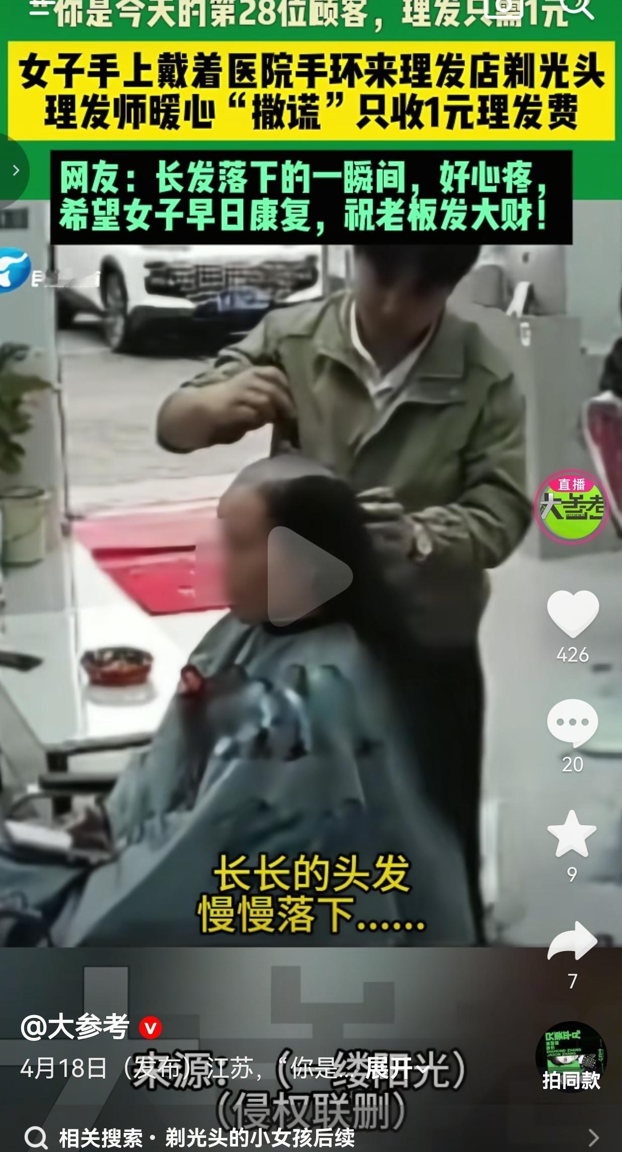 女子戴着医院手环剃光头,理发师撒了个谎,只收1块钱! 这哪里是1块钱的理发费,这是陌生人给的温柔啊。 江苏的一家理发店里,一个戴着医院手环的女子走进来,开口就说“要剃光头”。 理发师抬头看到她手腕上的手环,瞬间就懂了,没多问,默默准备工具,轻轻给她围上围布。 长发一点点被剪落,最后被推成光头的那一刻,女子没哭,可我隔着屏幕鼻子一下就酸了。 结账的时候,理发师笑着说:“你是今天第28位顾客,理发只需1元。” 他撒了个温柔的谎,给她留足了体面,也给了她面对病痛的勇气。 网友评论,全是又暖又心疼: 有的网友说:“看得我眼泪一下就掉下来了!长发落下的那一刻,心都揪紧了,祝她早日康复!” 也有的网友说:“这个理发师太会了!不追问、不怜悯,用最体面的方式帮她,这才是真正的善良啊!” 还有的网友说:“我也是经历过化疗的人,当时去剃光头,理发师不收钱,还跟我说‘以后头发长了再来找我’,陌生人的善意真的能撑住人!” 更有网友表示:“祝老板生意兴隆!这种有温度的店,活该火一辈子!” 说真的,看完这段视频,我心里又酸又暖。 生病剃光头,哪是剪掉头发那么简单,那是剪掉了女人最在意的体面和骄傲,是跟过去的自己告别,是要去面对一场硬仗。 可这个理发师,没戳破她的窘迫,没说一句“加油”,只用一个善意的谎言,给了她最后的体面和尊严。 他知道,比起廉价的同情,她更需要的是不被特殊对待的尊重。 现在太多人打着“善良”的旗号,把别人的伤口扒出来围观,可真正的善良,从来都不是大声喊出来的,是藏在细节里的温柔,是不动声色的保护。 以前总有人说“世态炎凉”,可你看,总有人在偷偷爱着这个世界。 这个理发师用行动告诉我们,善良不是轰轰烈烈的大事,是不追问、不围观,是给人留足体面,是把温柔藏在细节里。 愿你我都能被世界温柔以待,也愿我们都能做别人的那束光。