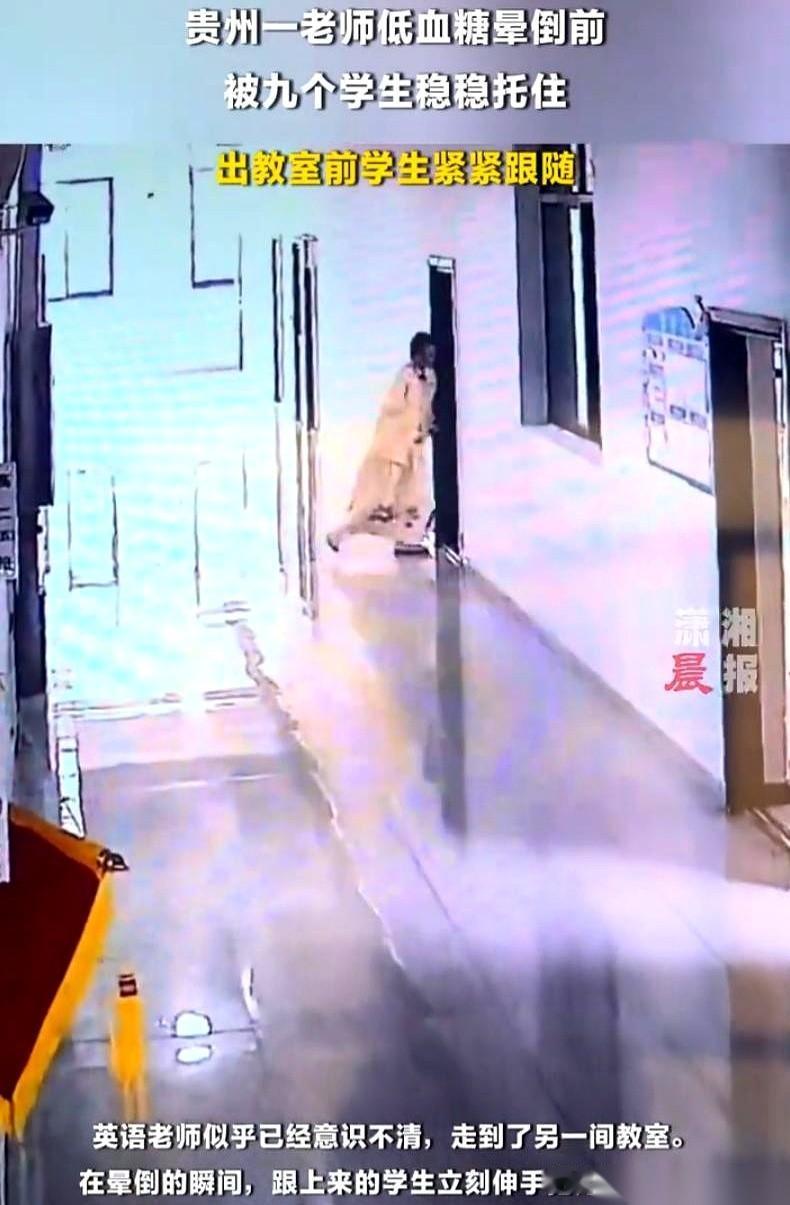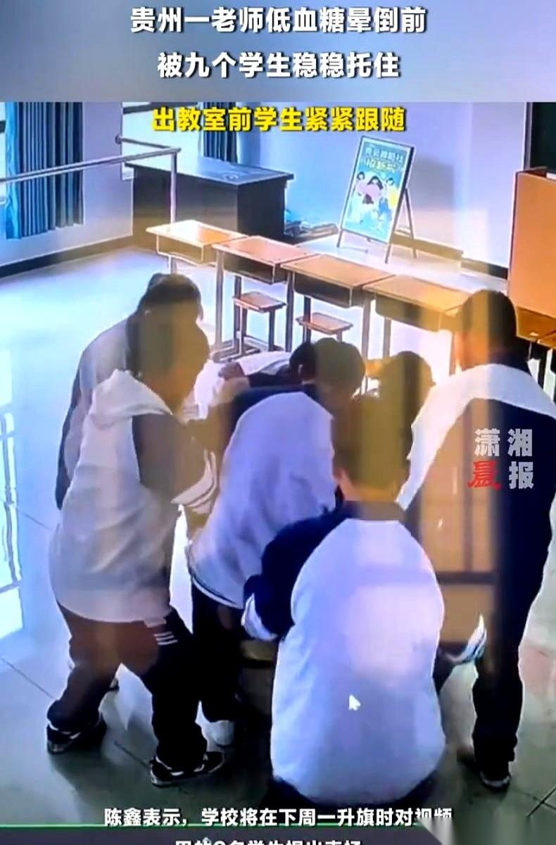 贵州六盘水。监控里的英语老师正讲着课,身体突然晃了一下,手里的教案差点没拿稳。 她穿着一身白裙子,戴着耳麦,整个人突然像踩在棉花上,眼神发直,踉踉跄跄地往教室外挪。 讲台底下的几十个学生全停住了,视线跟着她的白裙子移动。 最先冲出去的,竟然是那几个正在被罚站的学生。 老师刚迈出教室门,身体就彻底失控了。她走了一个歪歪扭扭的S形,整个人猛地往前蹿,眼看脑门就要磕在坚硬的瓷砖地上。 就在这千钧一发的瞬间,两个块头挺大的男生一个箭步冲上去,左右开弓,像两根铁柱子一样稳稳架住了老师的胳膊。 老师的体重全压在他们身上,两个男生咬着牙,硬是一寸都没让老师往下掉。 教室里瞬间炸了锅。 有的学生连滚带爬地搬来一张红色塑料凳,几个孩子七手八脚地扶着老师坐下。 老师坐在凳子上,低着头,手死死按着太阳穴,半天没缓过神来。 这几个平时在课上最调皮、挨训最多的“捣蛋鬼”,这时候没一个看热闹的。有的学生从课桌洞里翻出还没拆封的糖果和饼干,剥开了塞到老师手里。 班主任事后提起这事,声音都在抖:那是急性低血糖,老师当时连自己进错了教室都不知道。 有人问:这几个孩子正被罚站呢,不记恨老师吗? 这真不是什么大道理。 这些孩子心里有一本最清楚的账。老师平时管得严不严、是不是真心为他们好,那点“罚站”的火气,在看到老师要倒下的一瞬间,全变成了救人的本能。 这些孩子可能考不了全校第一,可能在公开课上给不了你完美的答案,甚至天天让你头疼。 但当危险真的降临时,他们会第一个冲出来,用单薄的肩膀死死扛住你。 哪怕正被罚站,他们也绝不会让你摔在地上。 这就是教育最真实、最让人心颤的回响。这种“心腹大患”变成“心腹”的感觉,你经历过吗?