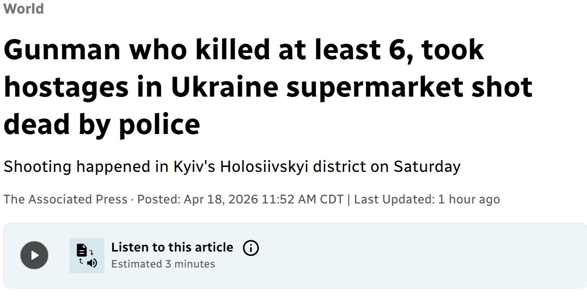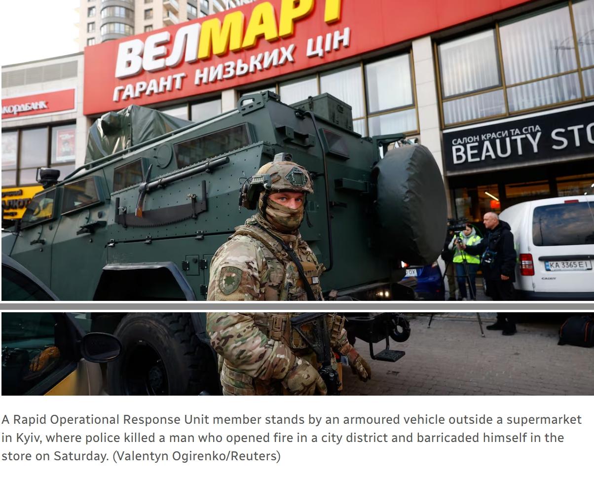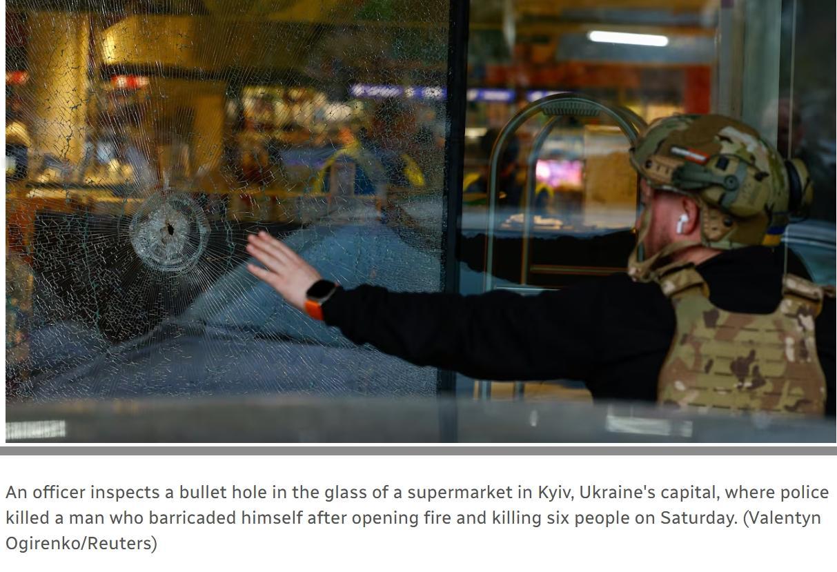 乌克兰一名枪手射杀6人后被击毙 当地时间周六,乌克兰首都基辅的霍洛西伊夫斯基区,一名枪手在街头杀害至少六人,随后劫持人质并将自己关在附近超市内,已被警方击毙。 乌克兰内政部长伊戈尔·克利门科表示,枪手在街上杀害了四名路人,随后进入超市并杀害了第五人,第六名受害者,一名年轻女性,在医院因伤势不治身亡,袭击者是在抵抗逮捕时被击毙的。 乌克兰总统弗拉基米尔·泽连斯基随后证实,已救出四名人质,至少有14人受伤。 克利门科说,枪手出生于1968年,但未透露更多身份细节。枪手被击毙前,一名身穿防弹衣、站在装甲车后方的女警察谈判代表用扩音器呼喊:“这不是人民的错。请放他们走,我们会和你谈谈。” 克莱门科说该男子携带卡宾枪,这支短管突击步枪是合法注册的。去年12月,袭击者“在许可证到期时向许可机构申请试射。他提供了医疗证明。他还提交了续签该武器许可证的申请。他补充说,调查将确定是哪家医疗机构签发了该证明。