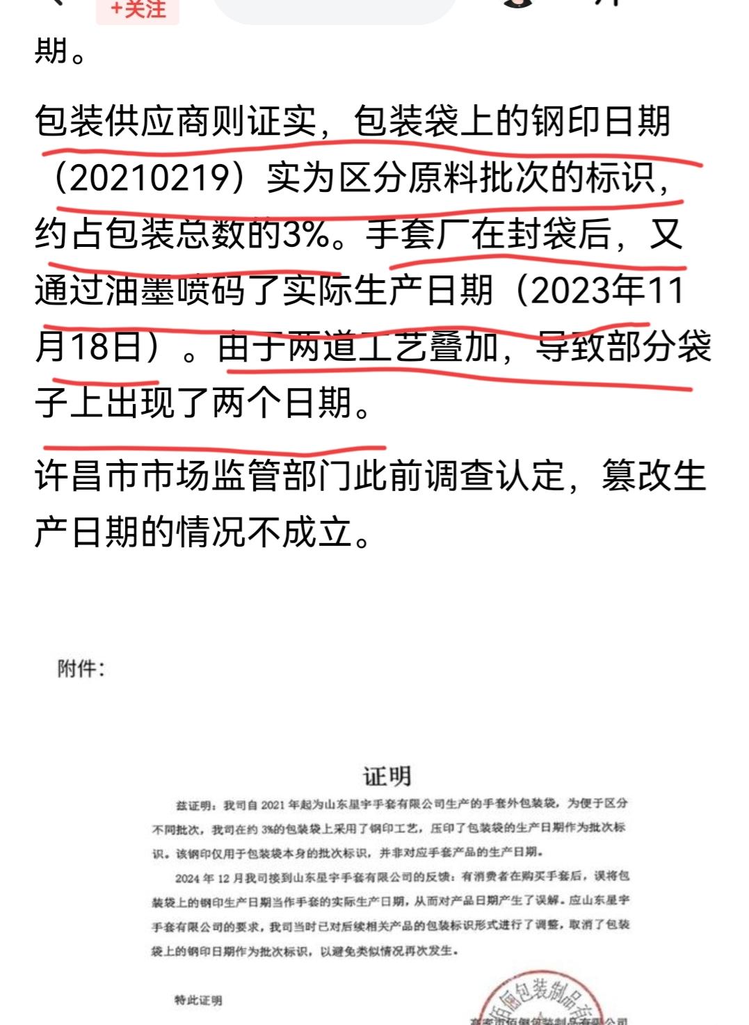 总感觉王海这次打假胖东来,变味了… 47双手套分47次购买,看起来很像冲着包装上的双日期“漏洞”来的! 可不可以这样推断?举报者在之前偶然发现有少数手套的包装袋同时有钢印日期和喷码日期,然后就把消息提供给王海,于是才有了这次购买47次手套的打假? 事件结果是,经胖东来自查和监管部门调查后,篡改生产日期情况不成立(原因见下图)。 不过话又说回来,虽然是手套,不是食品或对生产日期敏感的产品,但是这种包装袋上有双日期的现象也确实是违规的!王海的这次打假,给所有制造商一次提醒:任何情况下,生产作业都应严格遵守《标准化法》的规定,不能有侥幸心理!