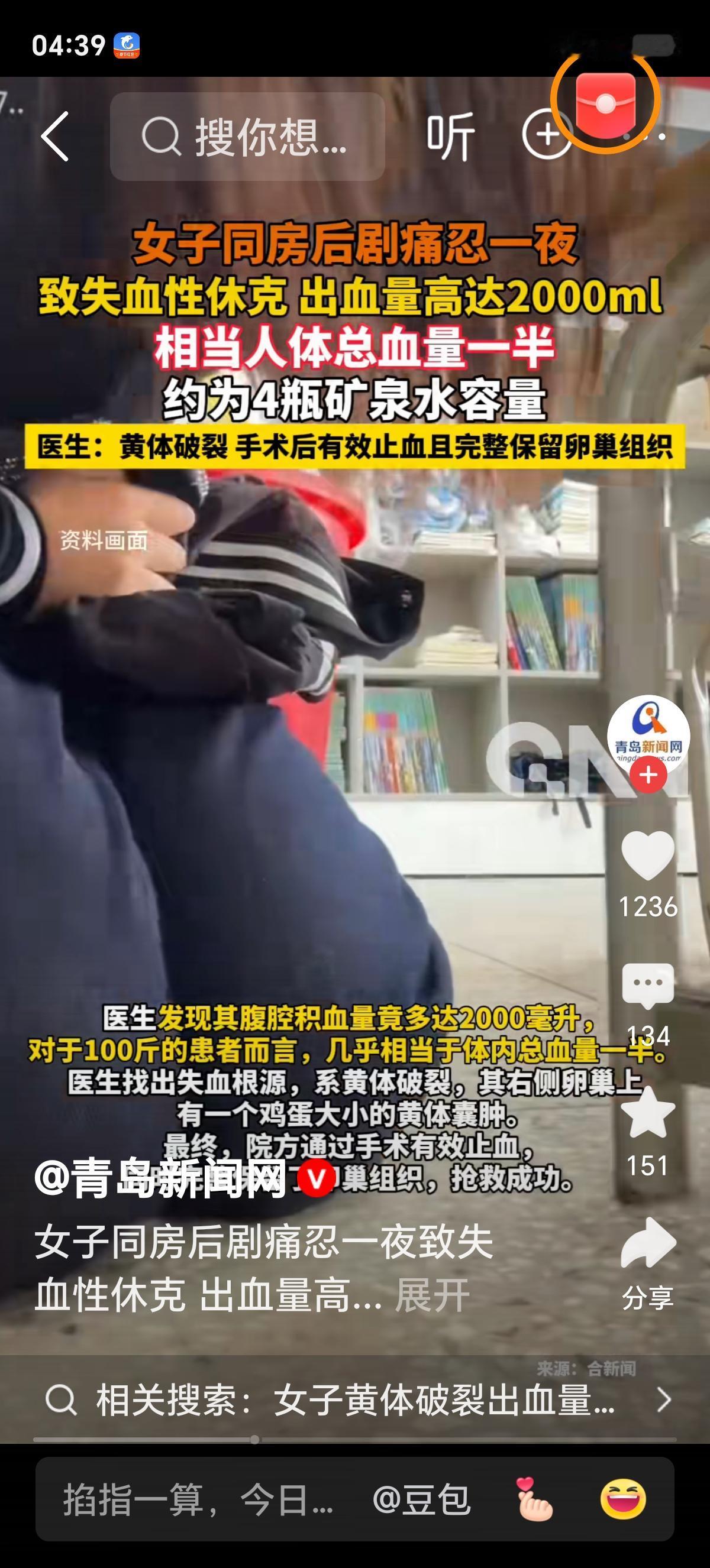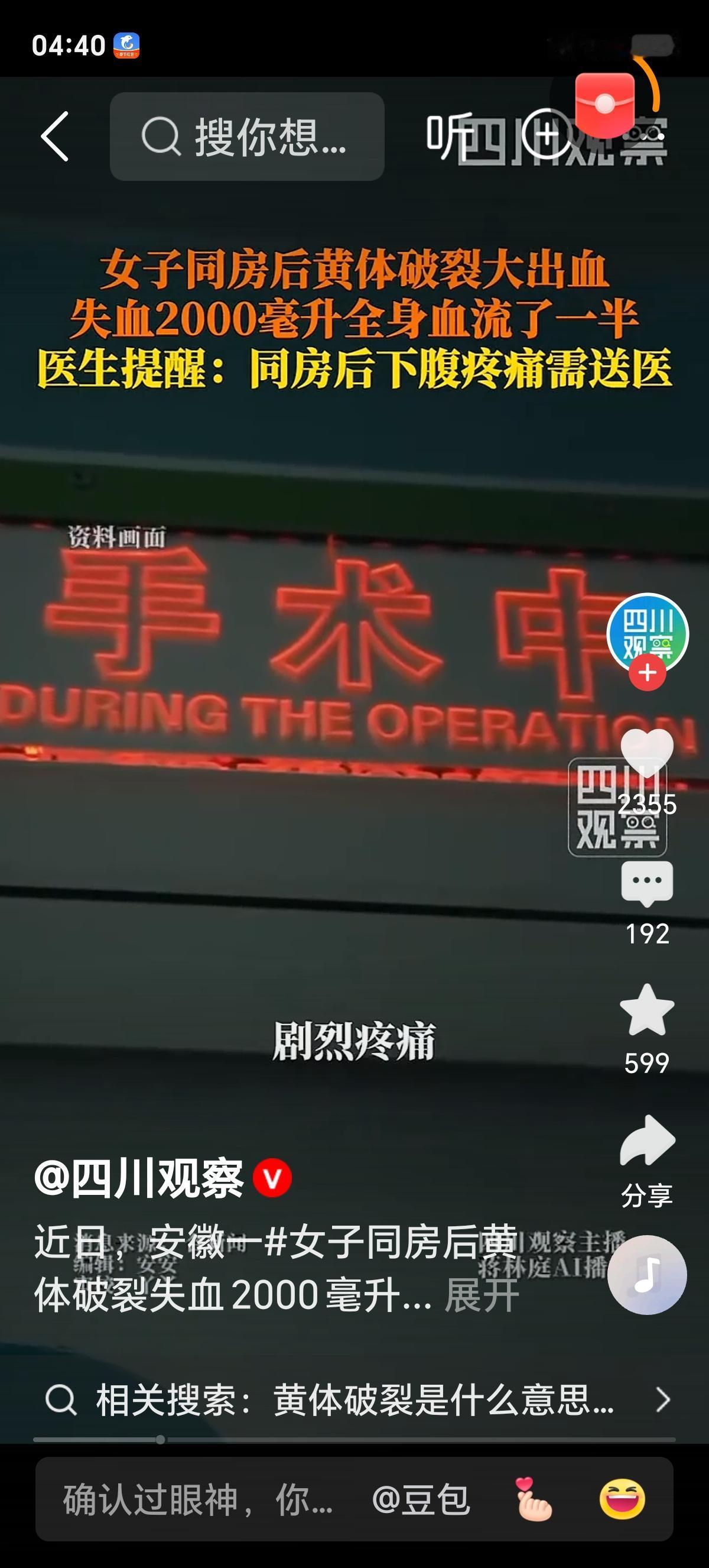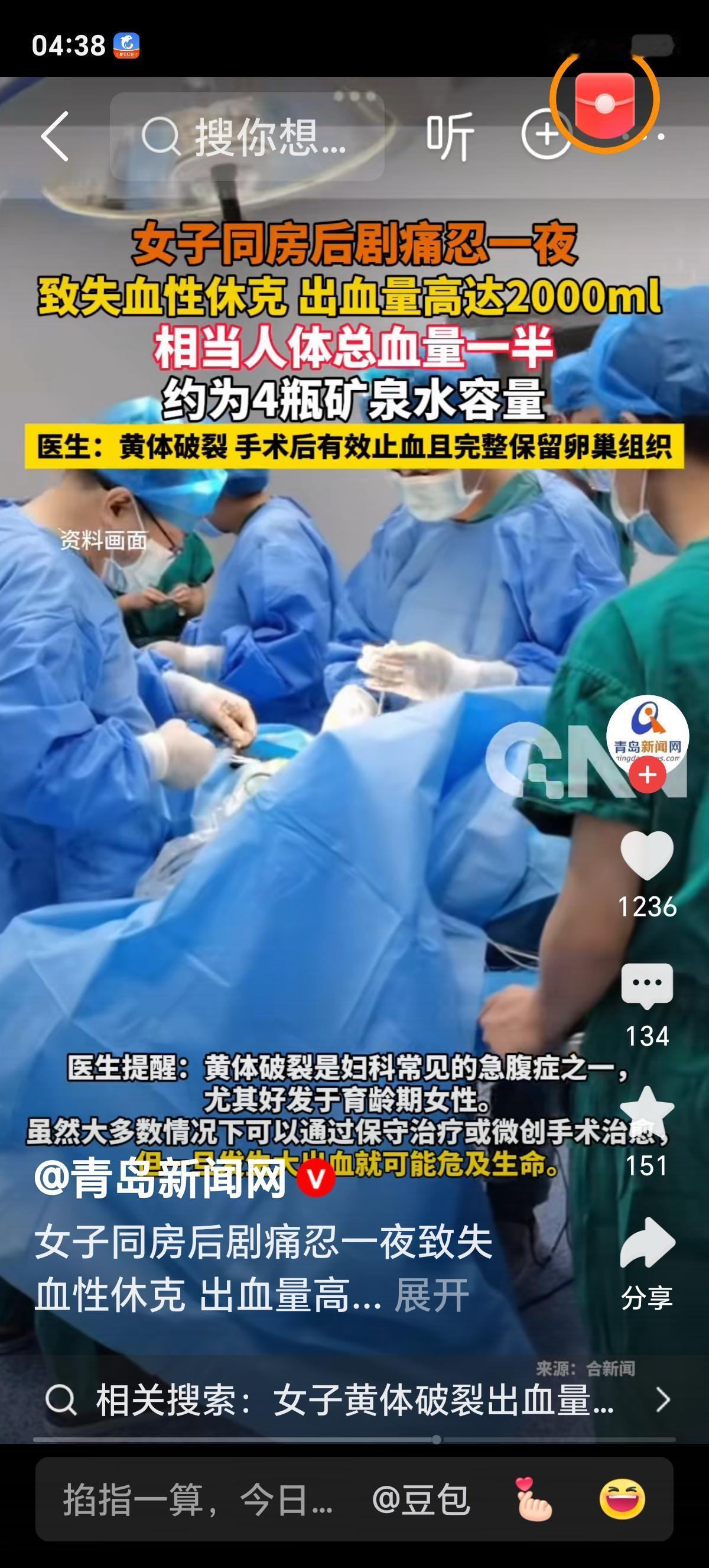 女子同房后黄体破裂,大出血高达2000毫升!很多夫妻都忽略了这件事 生活里很多隐秘的健康隐患,往往就藏在日常亲密相处之中,稍有大意就可能酿成危险。近日一则揪心的新闻刷屏网络:一名女子同房后突发剧烈腹痛,紧急送医检查才发现,竟是黄体破裂,体内出血量足足达到2000毫升,情况一度十分凶险。 很多人对黄体破裂十分陌生,根本不知道这种病症有多可怕。2000毫升出血量是什么概念?相当于人体近一半的血量,一旦抢救不及时,很容易引发休克,甚至危及生命,后果不堪设想。 医生解释,女性排卵期过后会形成黄体,本身质地脆弱、血管丰富。同房时动作幅度太大、用力过猛,或是腹部受到剧烈冲击,都极易造成黄体撕裂出血。偏偏很多当事人一开始只以为是普通肚子疼,硬扛着不愿就医,硬生生错过了最佳救治时间。 更值得警醒的是:这种情况并不是个例,医院每个月都会接诊类似患者,年龄段大多集中在年轻女性身上。说到底,不是意外来得突然,而是大家健康常识太匮乏,总觉得小事无关紧要。 爱惜自己,从来都不是一句空话。无论是女性自身,还是身边的伴侣,都要懂得分寸、懂得呵护。身体没有重来的机会,一次疏忽,就可能付出惨痛代价。 提醒身边的家人朋友,多一份了解,就多一份平安。你身边听过类似的案例吗?评论区留言提醒更多人重视!绝经后异常出血