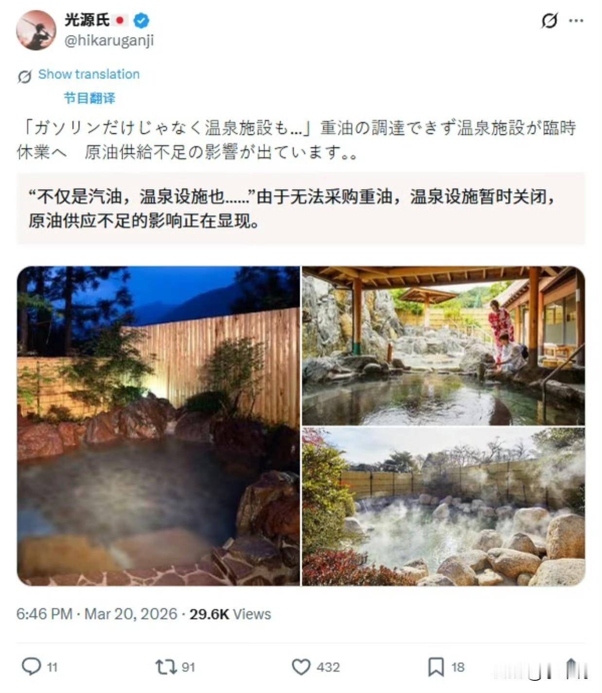 受美伊以战争影响,日本原油进口量不足,作为原油加工副产品的重油供应严重紧张。日本很多温泉需要依靠重油锅炉加热温泉水! 以前我一直还以为小日本的温泉是天然的!原来也是烧锅炉的!就怕是循环的老汤不消毒的军团菌爆表的那种! 想起个郭德纲相声,正洗着温泉呢听见“嘭”一声,过一会大家都从温泉出来了,锅炉炸了