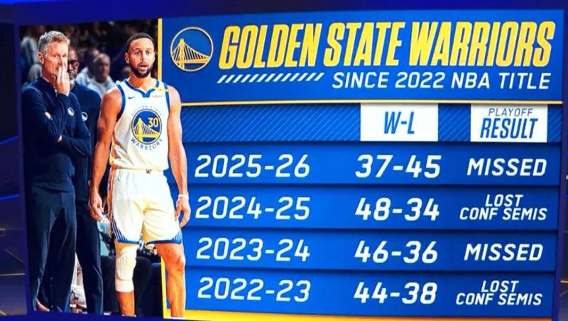 勇士最近4个赛季成绩: 25-26赛季:37胜45负,无缘季后赛 24-25赛季:48胜34负,二轮 23-24赛季:46胜36负,无缘季后赛 22-23赛季:44胜38负,二轮 这几年,勇士在阵容上做出过妥协和调整,尤其是上赛季拿下巴特勒,算是一场豪赌,且成果相当不错,帮助勇士打到了第二轮。 本赛季巴特勒也是早早赛季报销,让勇士陷入了锋线贫攻的状态。 现在随着库里、追梦、巴特勒、霍福德等人的岁数增加,下赛季,就是最后的机会了,勇士也等不起了,尤其是追梦的状态,他的防守端的作用一旦消失,勇士小阵容的打法就成了一条腿走路,再想打出前几年的进攻一波流就很艰难了。 因此,勇士本赛季虽然是征程结束,但管理层的工作会非常繁重,如何给库里的争冠阵容再续一口气,会是个大课题。