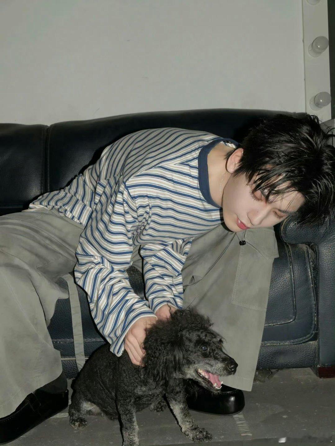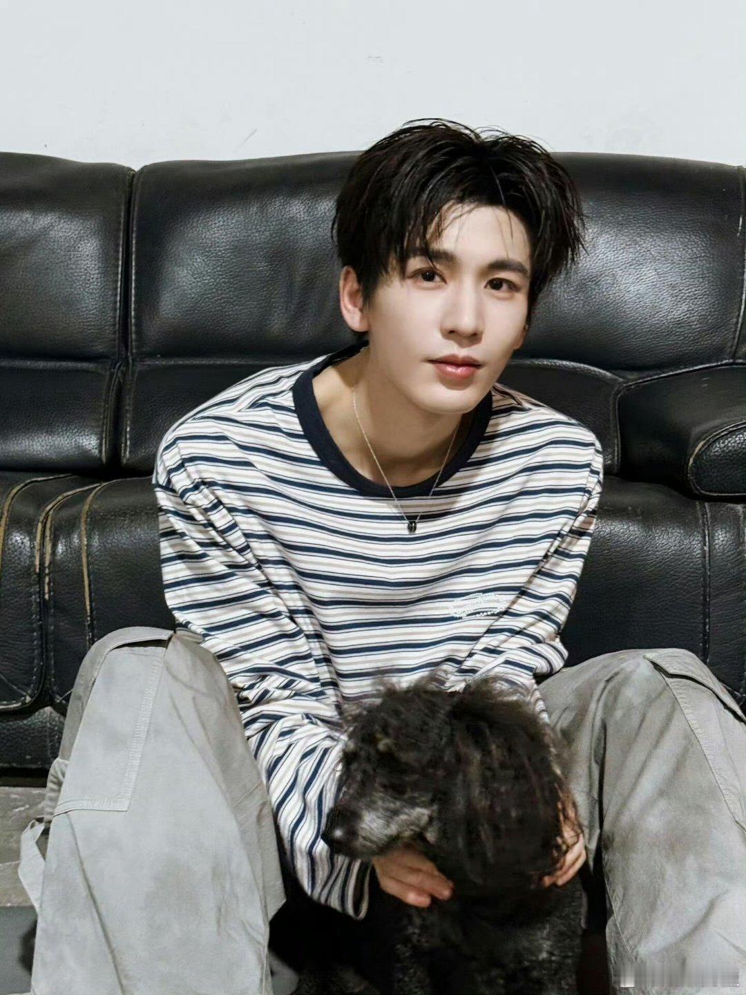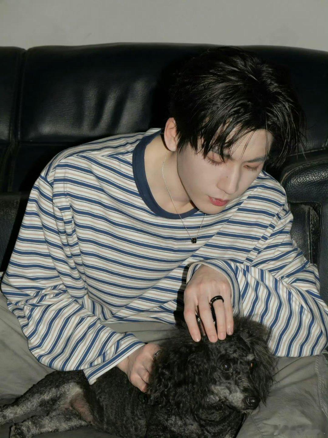 照片中,张凌赫身着简约黑白条纹上衣与休闲灰裤,呈现松弛随性的状态。其顺毛发型与清俊眉眼凸显了少年感,时而俏皮比耶,时而低头浅笑。 最引人注目的是他与一只小狗的互动画面:俯身轻抱、温柔抚摸,眼神宠溺柔和,场景温馨治愈。张凌赫ins更新萌照