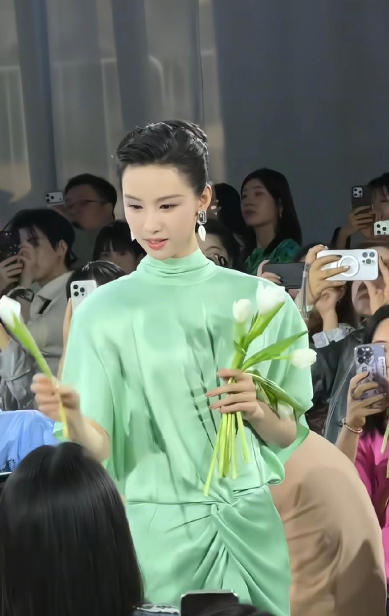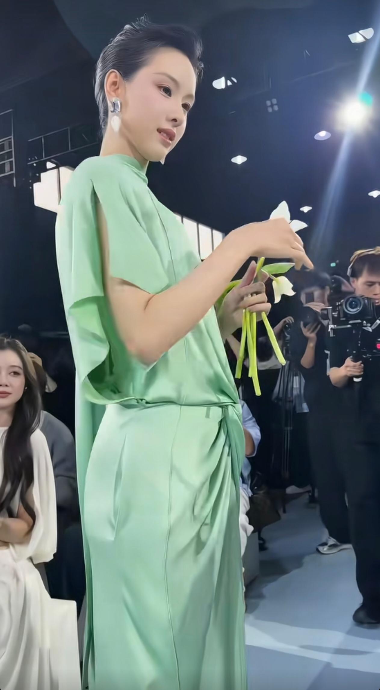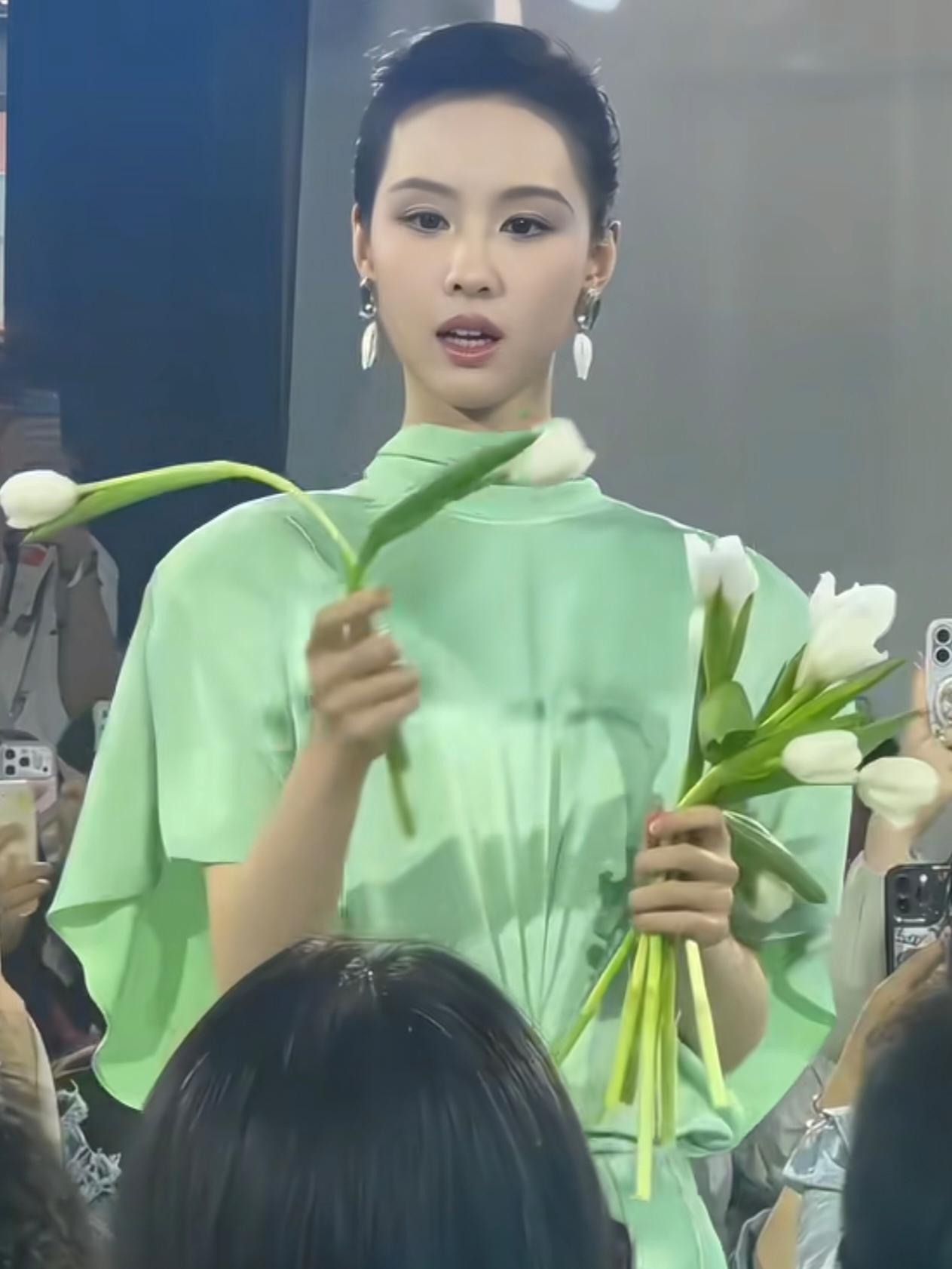 2026年4月18日,陈都灵出席彩棠新品发布会,真的是让人眼前一亮啊! 这次她走的是“青瓷塑骨”路线,一身青绿色缎面长裙,配利落的背头,清爽又大方。 缎面的质感加上这个柔和的绿色,衬得她气质格外干净舒展,有种90年代港星那种端庄优雅的味道。现场她给粉丝递郁金香的样子,也透着温柔从容。 和刚出道时的清纯感比起来,现在的她多了不少贵气和松弛感,整个人的状态越来越舒展,越看越有味道。 这种不刻意、自带的高级感,真的很耐看!