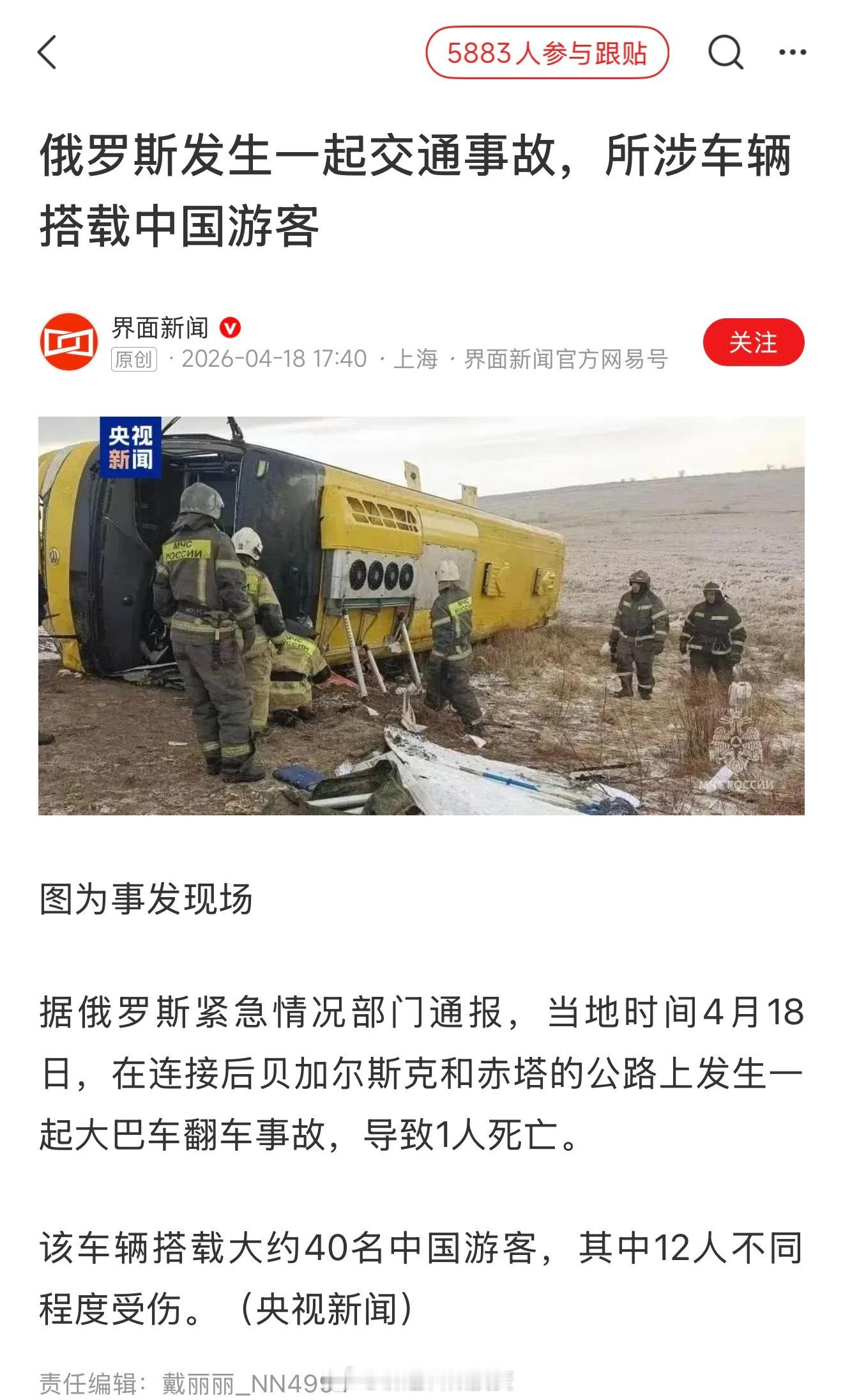 俄罗斯发生一起交通事故,所涉车辆搭载中国游客