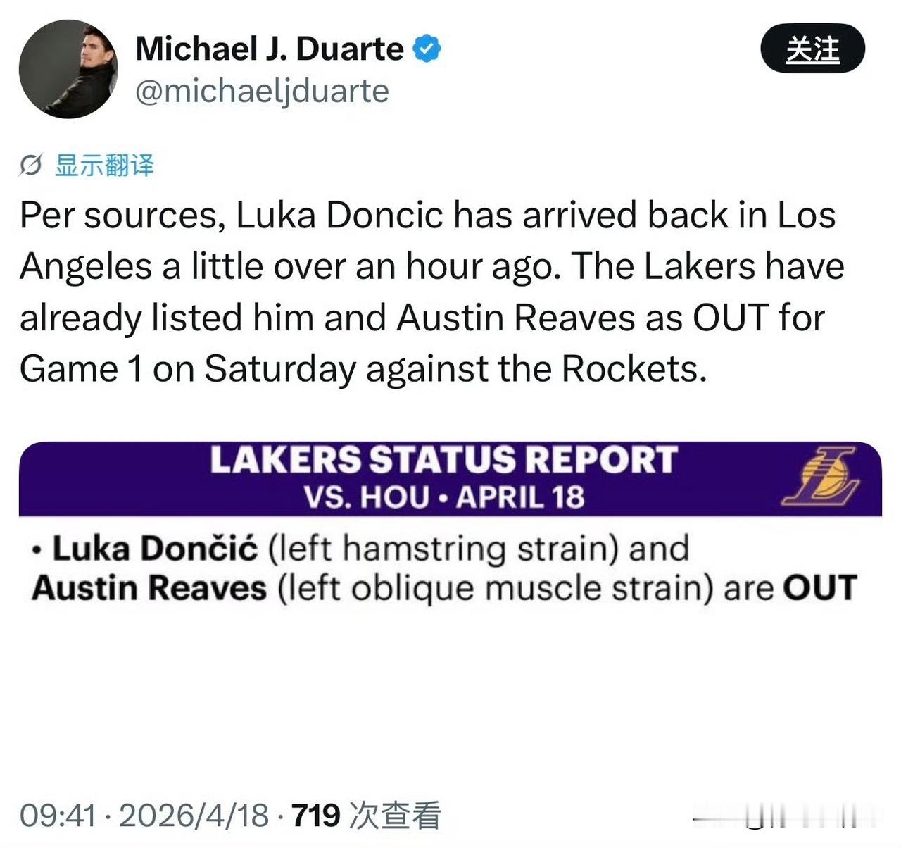 东契奇回到洛杉矶!!!东契奇G1确定不打,洛杉矶街头悠闲骑自行车! 根据洛杉矶相关记者透露,湖人球星东契奇昨天已经抵达洛杉矶,不过他今天的G1确定继续缺阵。 随后纽约邮报也跟进了报道,东契奇回到了洛杉矶,出现在街头骑自行车,很是悠闲。 看来是问题不大,今天我们应该可以在赛场边上看到东契奇,他将现身球场为队友们加油打气,毕竟这可是季后赛的揭幕战,首场比赛至关重要。 湖人目前不被外界所看好,东契奇和里夫斯两个关键后卫的缺阵成了影响比赛走势的最大原因,詹姆斯单核带队,看来今天必须血拼到底,得分、篮板、助攻一把抓,当然角色球员也需要挺身而出,一起期待他们的表现吧!华境S全球首秀标配华为乾崑 湖人