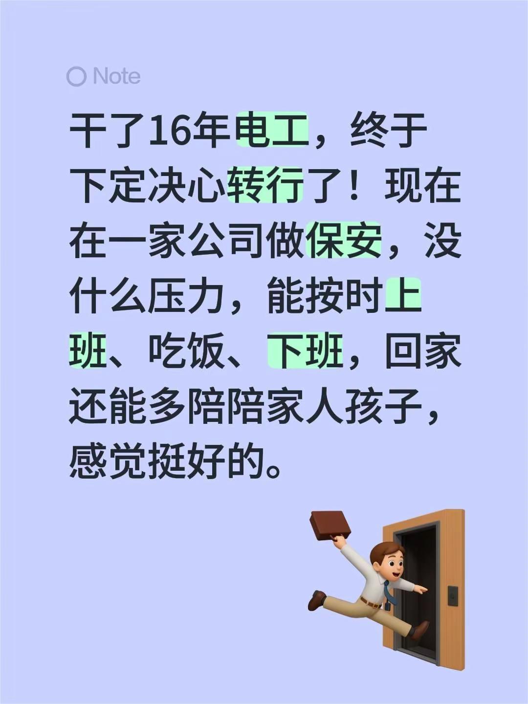 干了16年电工,终于下定决心转行了!现在在一家公司做保安,没什么压力,能按时上班、吃饭、下班,回家还能多陪陪家人孩子,感觉挺好的。