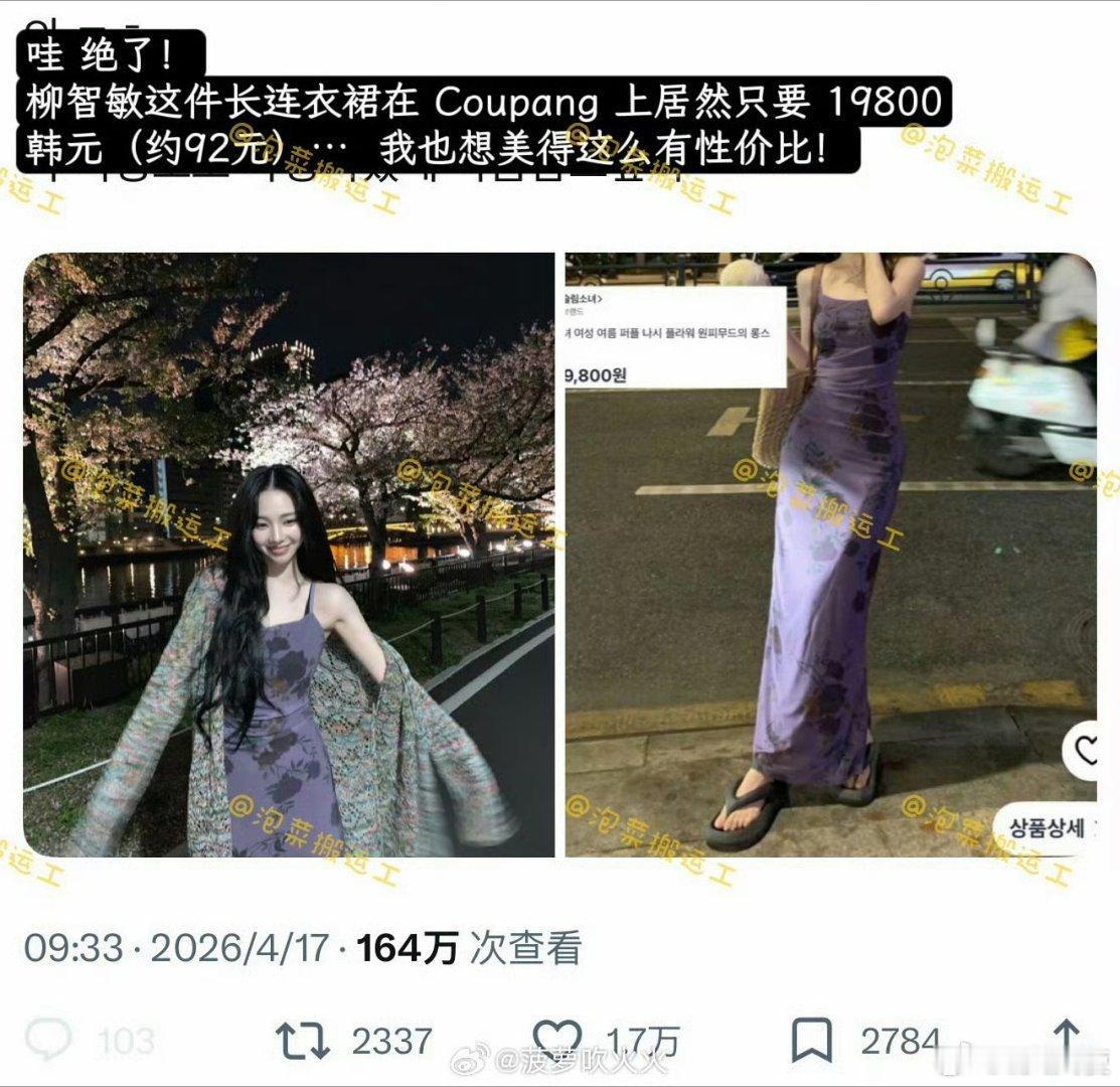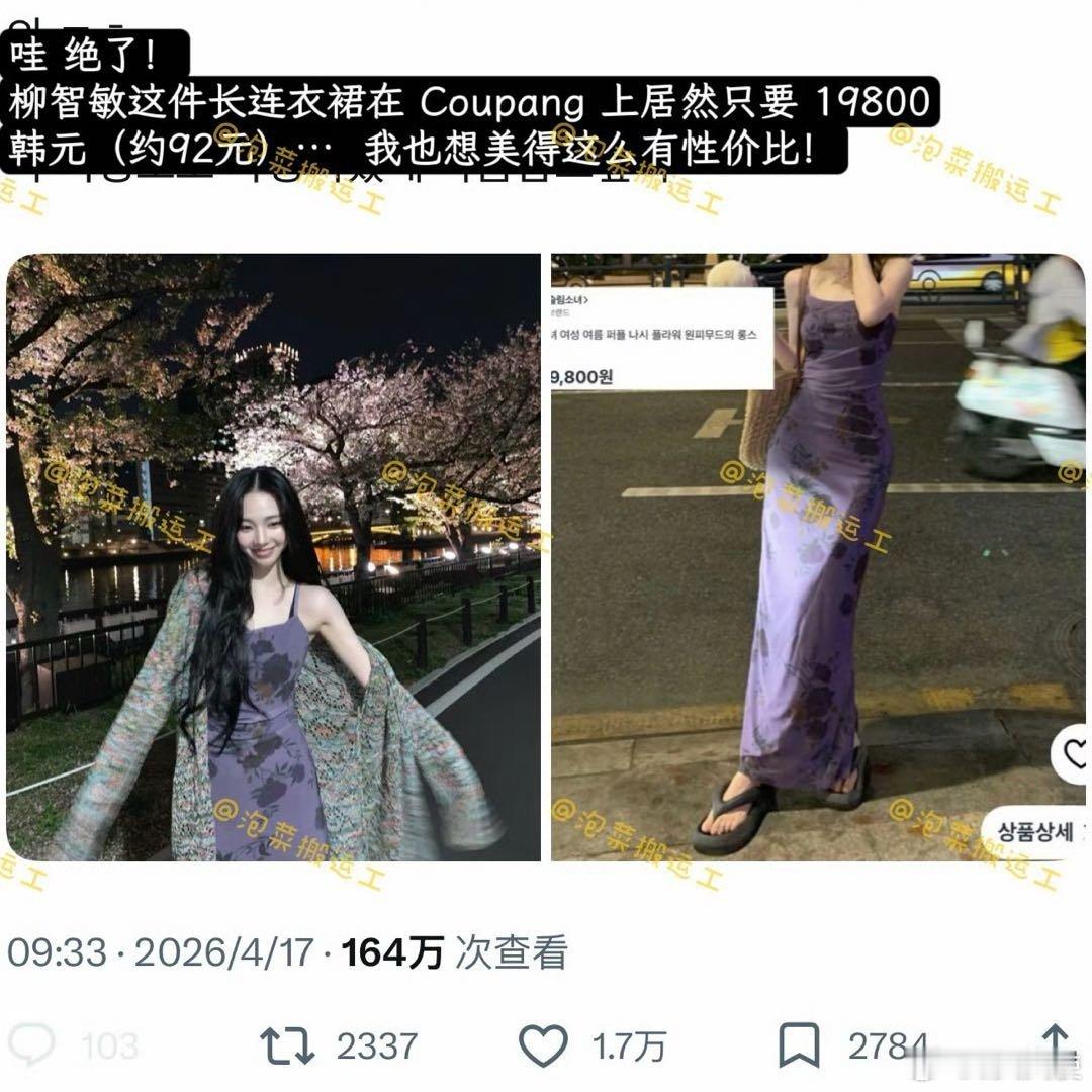 该长裙被网友发现源自韩国电商平台Coupang,售价折合人民币仅92元。这与明星通常穿着的高价奢侈品形成鲜明对比。柳智敏穿的长裙只要92元