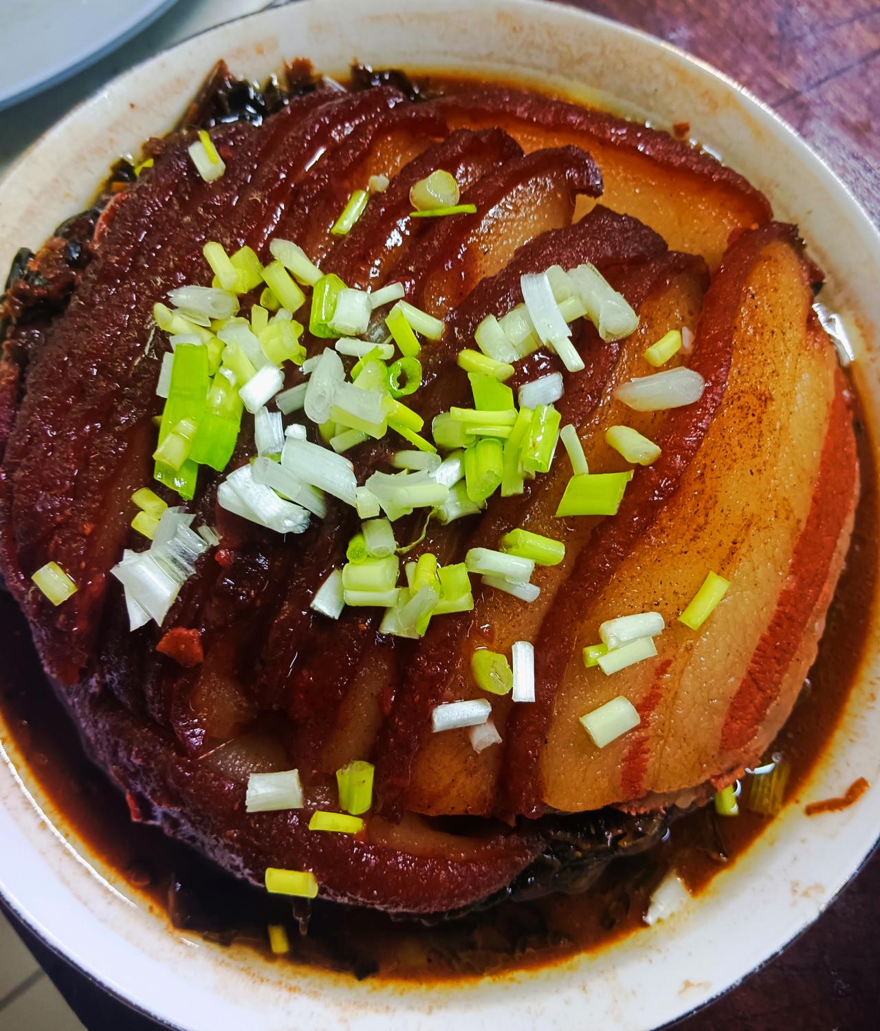 昨晚孙子跟我说,今天中午想吃梅菜扣肉。我应道:“行呀,上次烧的肉还剩一块,正好把它解决了。” 清晨起身,我先把烧肉拿出来解冻,将梅干菜泡上,随后和老伴悄悄出了门。在南城香用过早点,又去公园溜达了一圈,回到家时孩子们刚好起床。 儿子有事出去了,儿媳和孙子去菜市场采购,回来时又是满满一车,把冰箱塞得严严实实。 我一边把备好的梅菜扣肉上锅蒸,一边准备午饭食材。等他们再次进门,午饭已然备好。有梅菜扣肉、糖醋排骨、红焖大虾、辣子白菜、番茄炒蛋、冰菜,还有西葫芦辣椒炒鸡蛋,荤素搭配,满足所有人的口味。 看着他们吃的香甜,我心里也美滋滋的。
