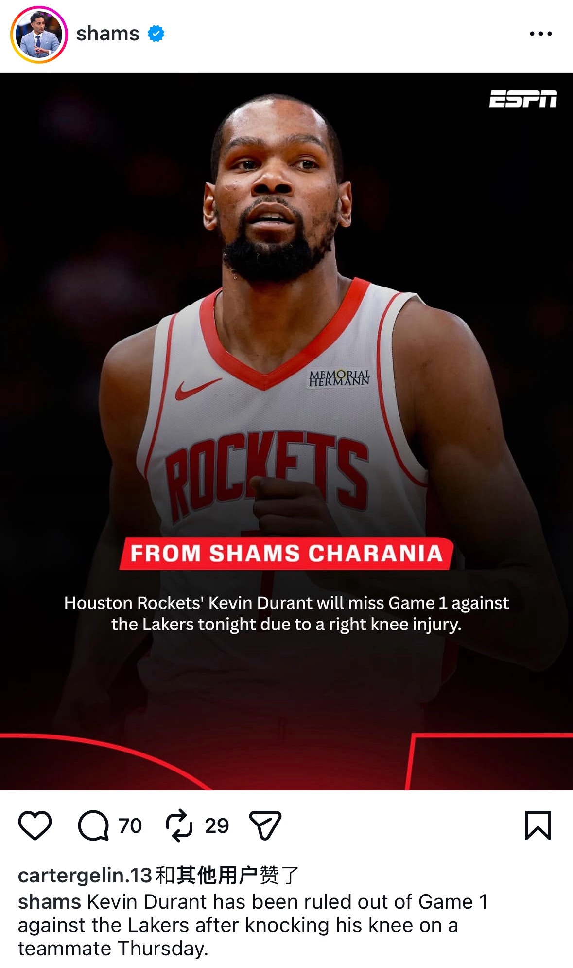 不是烟雾弹,Shams:杜兰特缺席比赛!右膝盖受伤! 火箭vs湖人