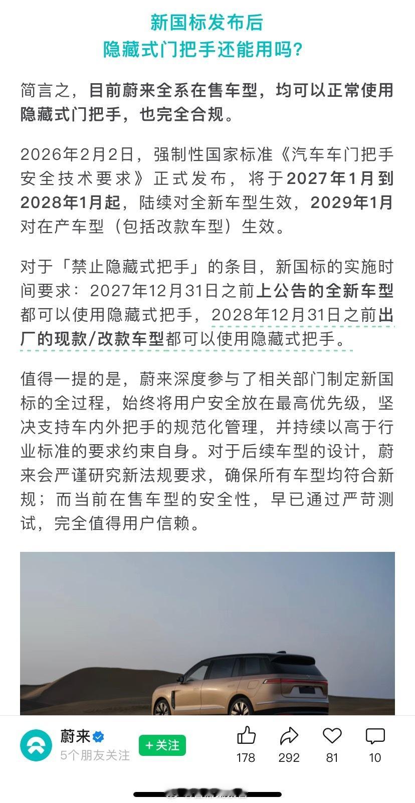 新国标对隐藏把手的限制,是 2027 年 12 月 31 日后公告的新车才会生效,现在的 ES9 完全不受影响。