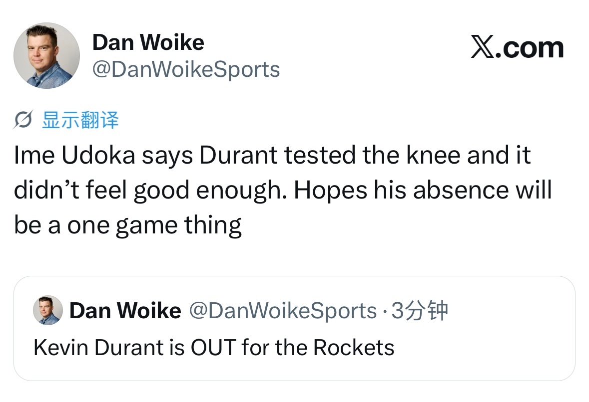 乌度卡表示,杜兰特对膝盖进行了测试,但感觉状态还不够好。是髌腱部位的问题。球队希望他这次缺阵只是缺席一场比赛。