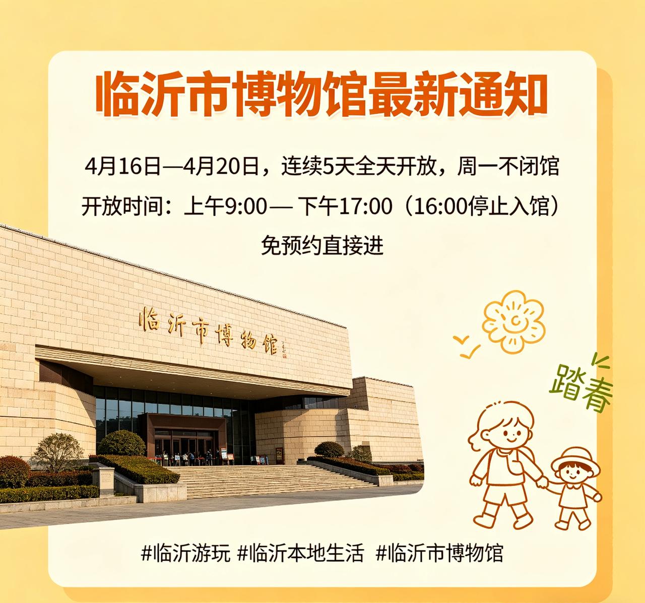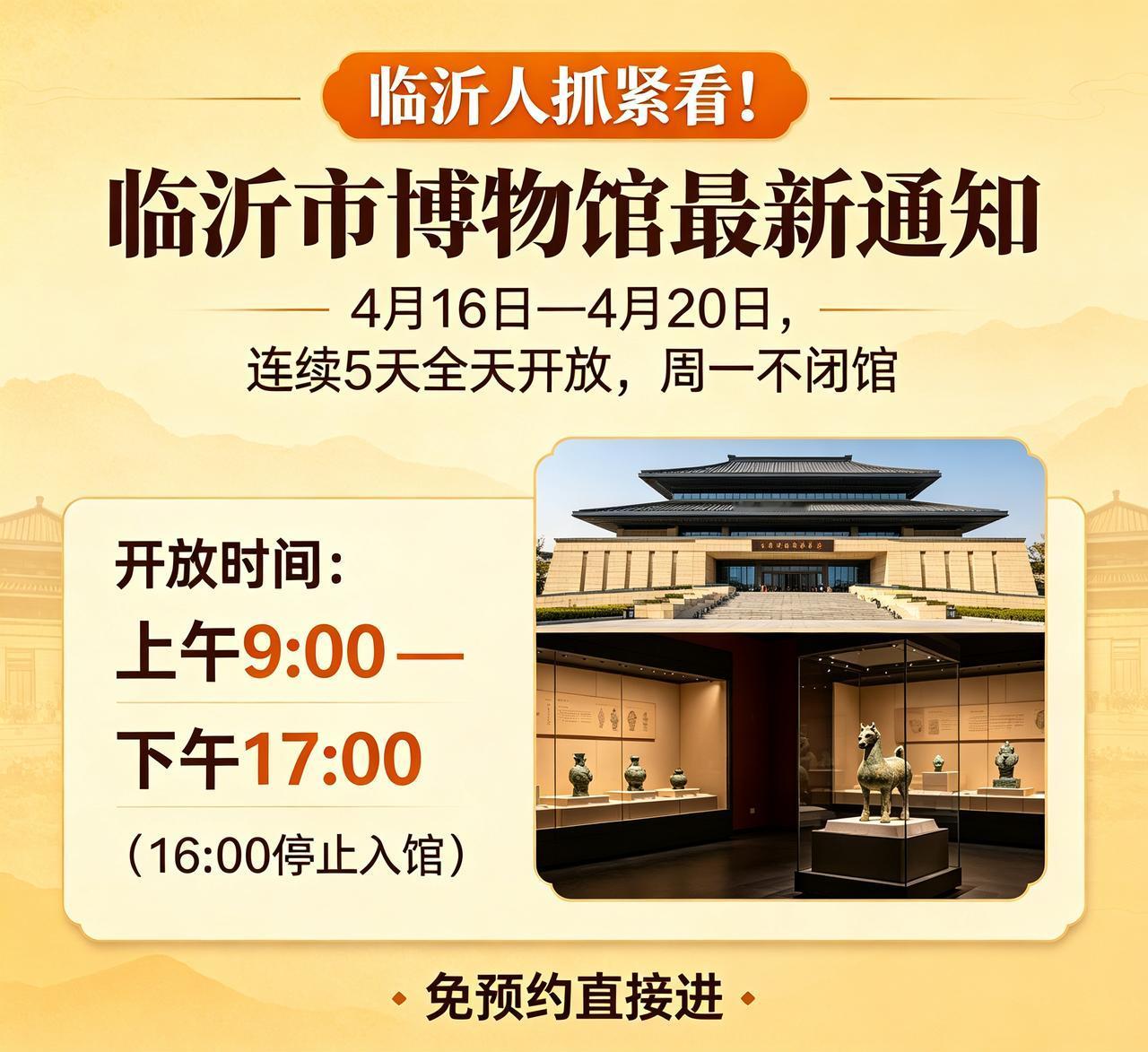 临沂人抓紧看!市博物馆最新通知!连开5天不闭馆,免预约直接进 临沂游玩 临沂本地生活 临沂市博物馆 临沂放假遛娃、踏青看展的注意了! 临沂市博物馆重磅安排出炉,4月16日到4月20日,三大馆区全部正常开放,就连周一也不休息! 开放时间: 早上9:00—下午17:00,16:00停止入馆 重要福利: 不用预约!不用预约! 带上身份证直接安检就能进,未成年人由家长陪同即可,省心又方便! 三大馆区通通开放: ✅北城馆区 ✅银雀山汉墓竹简博物馆 ✅临沂孔庙 场内二十多个精品展览全面上线, VR沉浸式体验、海昏侯国文物展、长城文物、陶瓷联展…… 还有公益讲解、研学活动,内容特别丰富,大人小孩都能看尽兴! 提醒大家: 4月21日(周二)开始恢复正常闭馆,想逛展的这几天抓紧安排! 趁着假期带上家人孩子,免费涨知识、遛娃好去处,赶紧收藏转发!