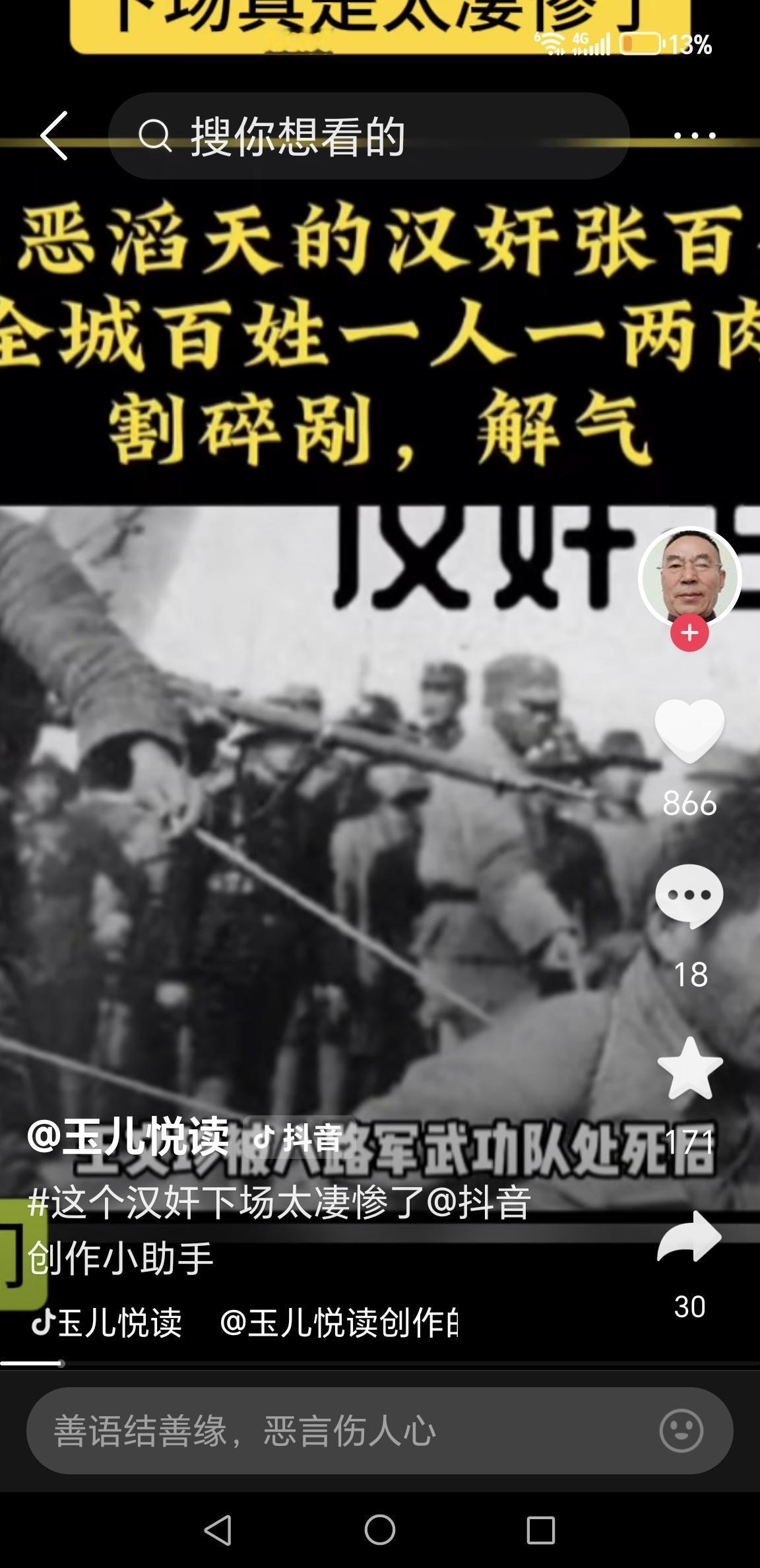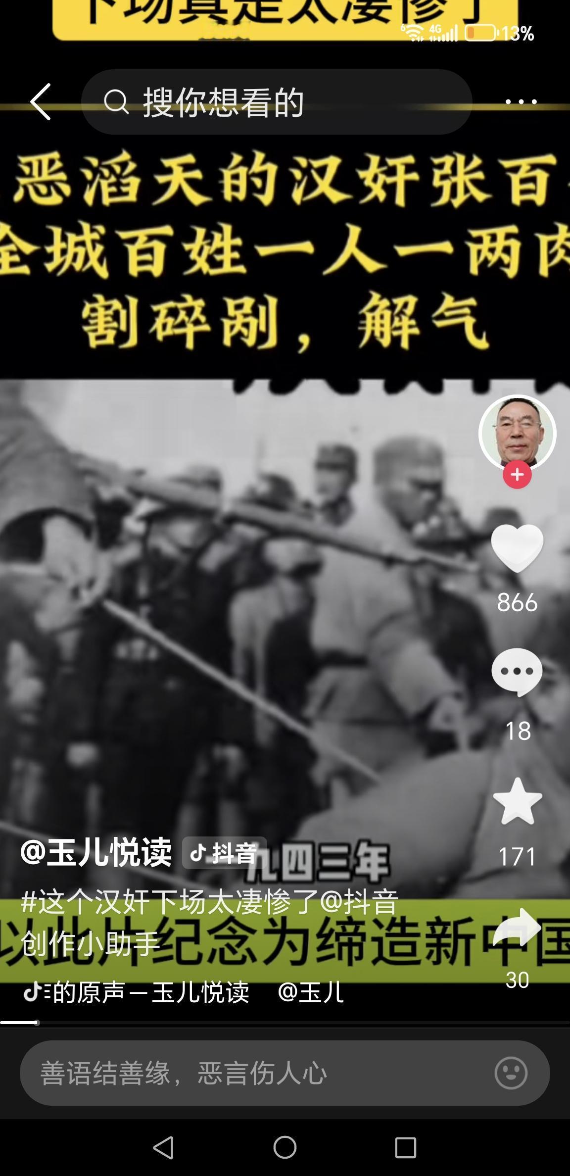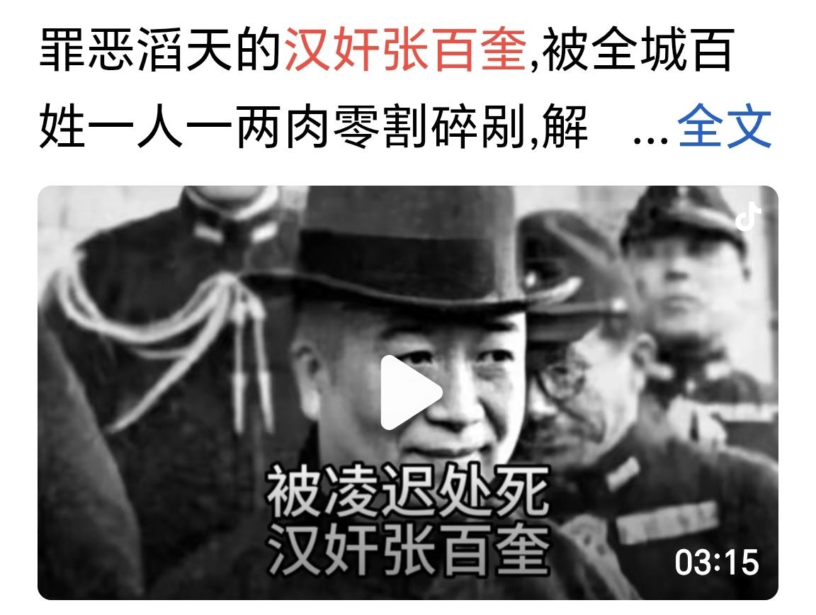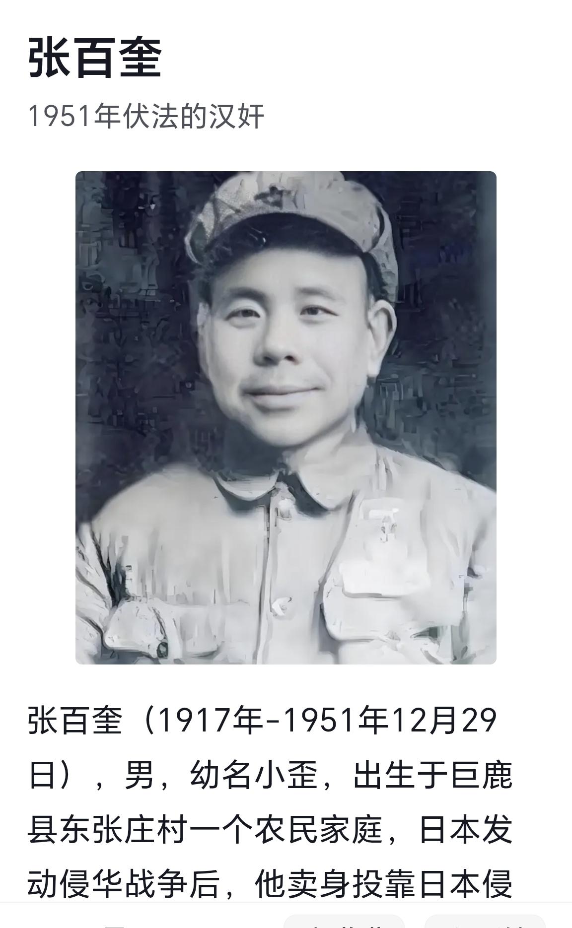 汉奸张百奎:罄竹难书的血债,遗臭万年的下场 在中华民族抵御外侮的烽火岁月里,总有一些败类背叛民族、残害同胞,汉奸张百奎就是冀南大地上最令人发指的恶魔。他用双手沾满同胞的鲜血,用酷刑践踏人性底线,最终在万人唾骂中被千刀万剐,用最耻辱的方式终结了罪恶的一生。 一、从顽劣之徒到汉奸走狗,背叛民族的无耻败类 张百奎,1917年生于河北巨鹿县东张庄村,自幼横行乡里、顽劣凶狠,是远近闻名的“混世魔王”。1935年,他当上巨鹿县国民党巡警;1936年加入国民党五十三军当兵;1938年,八路军将巨鹿县保安队改编为冀南区游击队,张百奎被任命为排长。可他骨子里的反动本性从未改变,在日军占领巨鹿县城后,他竟率残部公开投敌,死心塌地为侵略者卖命,历任伪警备队分队长、保安大队长、保安联队长,成了日军屠刀下最凶残的帮凶。 为了讨好日军,张百奎对同胞的残忍远超侵略者。他不仅多次带领日伪军扫荡抗日根据地,烧杀抢掠、血洗村庄,更亲手制造了无数惨绝人寰的血案。据《巨鹿县志》记载,他亲手下令杀害共产党干部28人、党员7人、抗日战士27人、无辜群众74人,死在他手里的百姓更是不计其数,巨鹿当地流传的民谣“巨鹿人民倒了霉,出了个汉奸张百奎,杀人一千八,不分你我他”,正是他罪行的真实写照。 二、三十余种酷刑,灭绝人性的恶魔暴行 张百奎的凶残,早已超出了人类的底线。他独创三十余种酷刑,手段之残忍,连日军都骂他“畜生不如”。 他用铡刀铡死抗日干部,用刺刀挑杀无辜百姓,活埋、剥皮、挖心、点天灯、灌辣椒水、放蝎子咬……每一种酷刑都带着令人发指的恶意。地委书记李忠被他亲手杀害,通讯员张国存被他砍头剖腹挖心,妇女干部杨秀峰被他割去双乳、揪掉头发,受尽酷刑后惨死;区长胡平鄂被他用铡刀铡成三截,村干部段福合的头被他放在门槛上活活挤死。 更令人发指的是,他杀人的理由荒唐至极:澡堂老板闲聊时说吕布是“三姓家奴”,他误以为影射自己,就将老板活埋;看到孕妇,他和汉奸打赌胎儿性别,竟一刀划开孕妇肚子取出婴儿验证;为了“试新刀”,他在隆尧刘庄将青壮年集中到村外用机枪屠杀,借“想吃人肉咸菜”之名,将20多名群众头朝下扔进大水缸淹死,甚至用活人的皮做成皮带随身携带,炫耀自己的“战功”。他在县城设立“鬼王台”杀人场,和日军比赛杀人,让部下对着活人练枪法、练刺杀,将同胞的生命当作玩物。 三、亡命逃窜,难逃人民法网的终极审判 日本投降后,张百奎又投靠国民党傅作义部,继续为非作歹。解放前夕,他知道自己罪大恶极,便用香火把脸烫成麻子,伪装成商人,从绥远一路潜逃到上海,妄图逃脱惩罚。可他低估了人民群众的力量,1951年10月,巨鹿县侦察员顺藤摸瓜,在上海一家杂货店将这个沾满鲜血的大汉奸抓获,押回巨鹿受审。 1951年12月29日,巨鹿县召开万人公审大会,积压在百姓心中十几年的怒火彻底爆发。按照当时法律,只能对张百奎执行枪决,但行刑人员见民愤滔天,故意打偏子弹,让他没有立刻毙命。围观群众见状,再也按捺不住满腔怒火,蜂拥而上,用自带的小刀、剪刀,对着他的身体乱砍乱割。排着队要割他一块肉泄愤的队伍,从刑场一直排到一公里外,有人割他的耳朵,有人剜他的肉,现场的哭喊声、怒骂声交织在一起,是被他残害的同胞们迟来的正义。最终,张百奎因失血过多痛苦死去,他的人皮还被做成皮带,永远钉在历史的耻辱柱上,警示后人汉奸绝无好下场。 四、恶有恶报,汉奸的下场是历史的必然 张百奎的一生,是背叛民族、残害同胞的一生,他用滔天罪行换来了万人唾弃的结局。他的死,是人民对汉奸最严厉的审判,是正义对邪恶最彻底的清算。 历史告诉我们:任何背叛国家、残害人民的败类,终将被钉在耻辱柱上,遗臭万年。张百奎的下场,就是对“汉奸”二字最沉重的注解。他的暴行,让我们看清了汉奸的无耻与凶残;他的结局,让我们明白“恶有恶报”从来不是一句空话。铭记这段历史,不是为了延续仇恨,而是为了守护民族气节,永远记住:背叛民族者,终将被人民唾弃,被历史审判!
