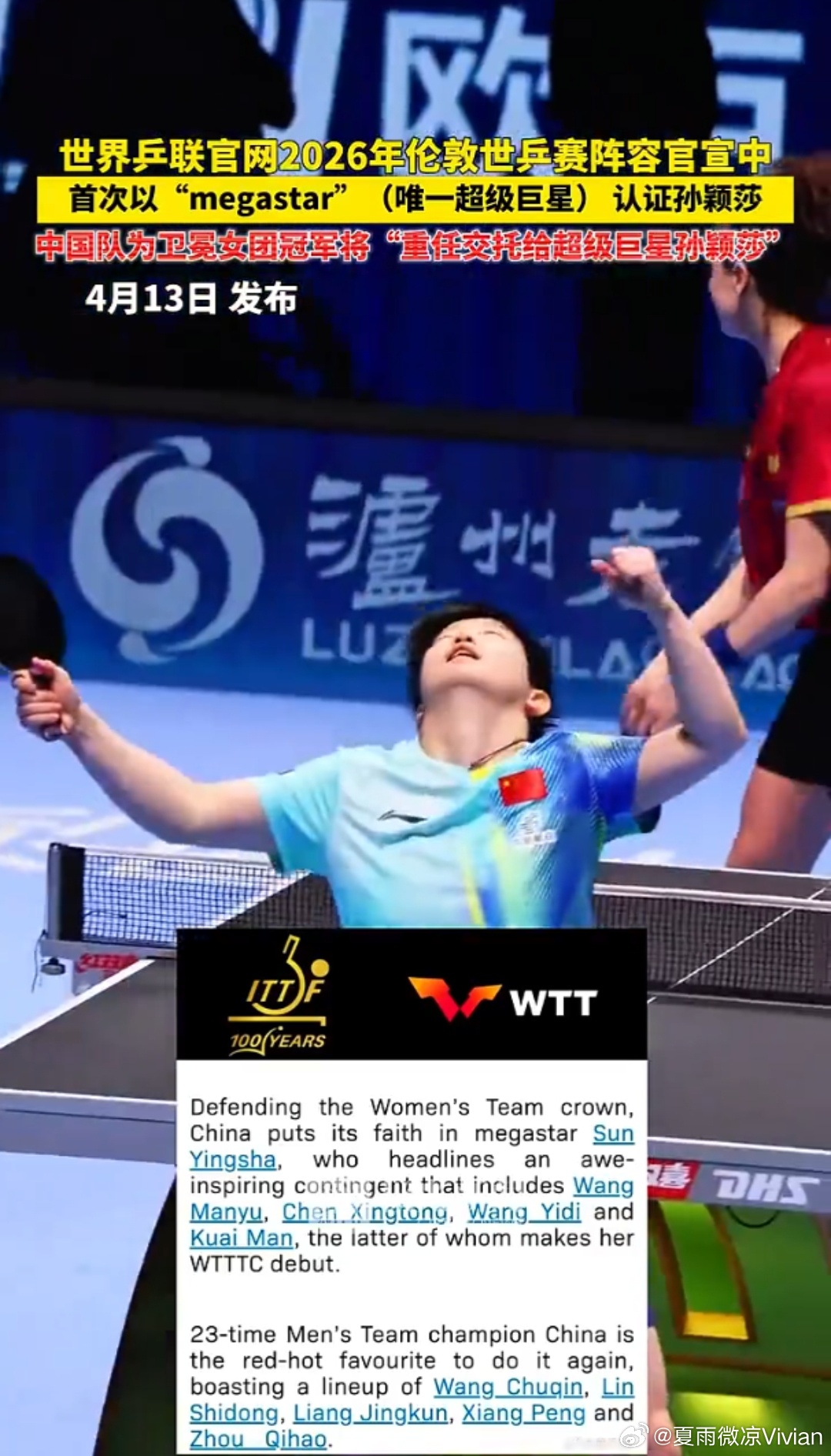 截至2026年4月,全球体育界共有4位运动员被官方认证为“megastar”(顶级巨星),具体名单如下:迈克尔·乔丹(篮球-NBA)(90年代) 利昂内尔·梅西(足球-FIFA)(2015年) 罗杰·费德勒(网球-ATP)(2006年) 孙颖莎(乒乓球-ITTF国际乒联/WTT世界乒联)(2026年4月) “megastar”在国际体育官方语境中代表运动员的最高荣誉级别,需具备持久统治力、跨领域影响力及对运动发展的革命性贡献等严苛标准,是体坛传奇、时代标杆与全球顶流影响力的结合体。