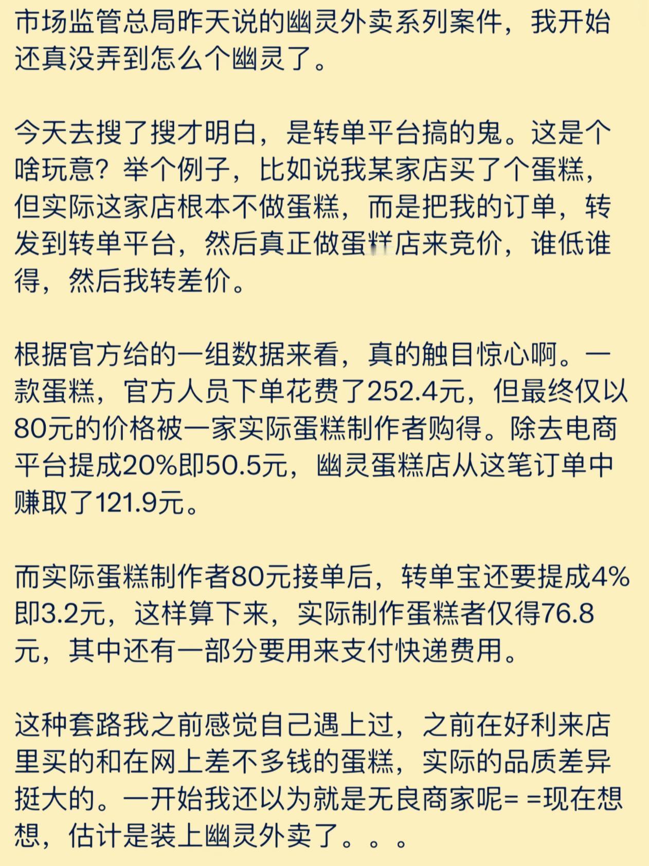 “幽灵外卖”太不地道了,消费者花了大钱,品质还没有保障,以后还是在实体店购买放心! ( “幽灵外卖”是线上店铺通过转单平台倒卖订单赚差价的灰色套路,层层抽成后,制作方利润微薄,只能压缩成本导致品质下降!)