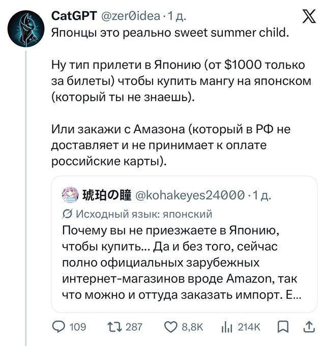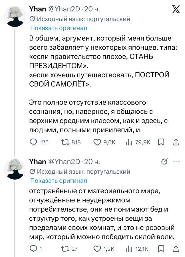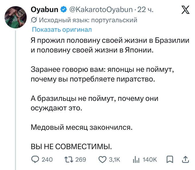 这几天日本和俄罗斯-巴西网友“关于数字巴比伦”的争吵升级。 如果说之前的交流还带着点猎奇和误解的趣味,那么这次围绕版权和盗版的争论,则直接演变成了一场涉及经济、文化和阶级的全球性大论战。这场被戏称为“巴比伦推特第一次国际混战”的事件,其核心是日本网友与俄罗斯-巴西联盟之间关于内容盗版(特别是动漫和漫画)的激烈冲突。 俄罗斯和巴西的网友利用新的自动翻译功能,向日本网友表达对日本作品的喜爱。然而,当日本网友得知这些喜爱很大程度上建立在盗版基础上时,矛盾瞬间爆发。 日本网友的反应被其他国家的网友形容为“天真”,其核心论点体现了某种基于经济特权的理想主义: “来日本买啊”:部分日本网友提出了一个在外界看来极不现实的建议,“如果你们国家没有官方渠道,那就花1000美元机票钱飞来日本买原版漫画吧,哪怕你根本不懂日语。” “用爱发电”:他们倾向于认为,如果政府不好,那就自己去当总统;如果想旅行,那就自己造飞机。这种观点被批评为完全缺乏阶级意识,是生活在特权泡泡里的上层中产阶级的想法,与现实世界严重脱节。 道德绝对主义:他们认为盗版就是偷窃,与去面包店偷面包无异。对于那些因贫困而接触盗版的孩子,他们认为“这些孩子是小偷,根本就不该玩游戏”。 面对日本网友的指责,俄罗斯和巴西网友则从现实出发,进行了有理有据的反击和辛辣的讽刺: 渠道封锁:他们指出,日本网友的建议完全不切实际。例如,亚马逊在日本以外的地区(如俄罗斯)不配送,也不接受当地的银行卡支付。 阶级讽刺:巴西网友一针见血地指出,日本网友的言论是完全缺乏阶级意识的表现。他们生活在物质世界之外,被消费主义异化,无法理解现实世界的贫困和结构性问题,以为仅靠意志力就能解决一切。 文化反讽:有网友讽刺道,向日本人解释盗版是徒劳的,因为他们的逻辑是“这些孩子是小偷”。更有甚者,用日本作品中的情节来反讽现实:“日本动漫和游戏里,英雄总是在打败压迫人民的邪恶Boss,但现实中的日本人却如此憎恨穷人或弱者威胁到大公司的利润,这简直无法理解。” 这场争论完美地诠释了“数字巴比伦”的含义,语言的障碍虽然被技术打破,但更深层的文化、经济和阶级鸿沟却因此暴露无遗。 日本希望其文化产品在全球获得尊重和合法收益,但其官方发行渠道和支付体系的闭塞,却将大量海外粉丝拒之门外。日本网友站在版权保护的道德高地上,而俄罗斯和巴西网友则从“获取渠道”的现实出发,认为盗版是在官方渠道缺失情况下的无奈之举,甚至是让贫困儿童接触到文化产品的唯一途径。 尽管双方都有理性的声音,但这场混战无疑揭示了在全球化的互联网时代,不同世界之间的理解和共存,远比我们想象的要复杂和困难。