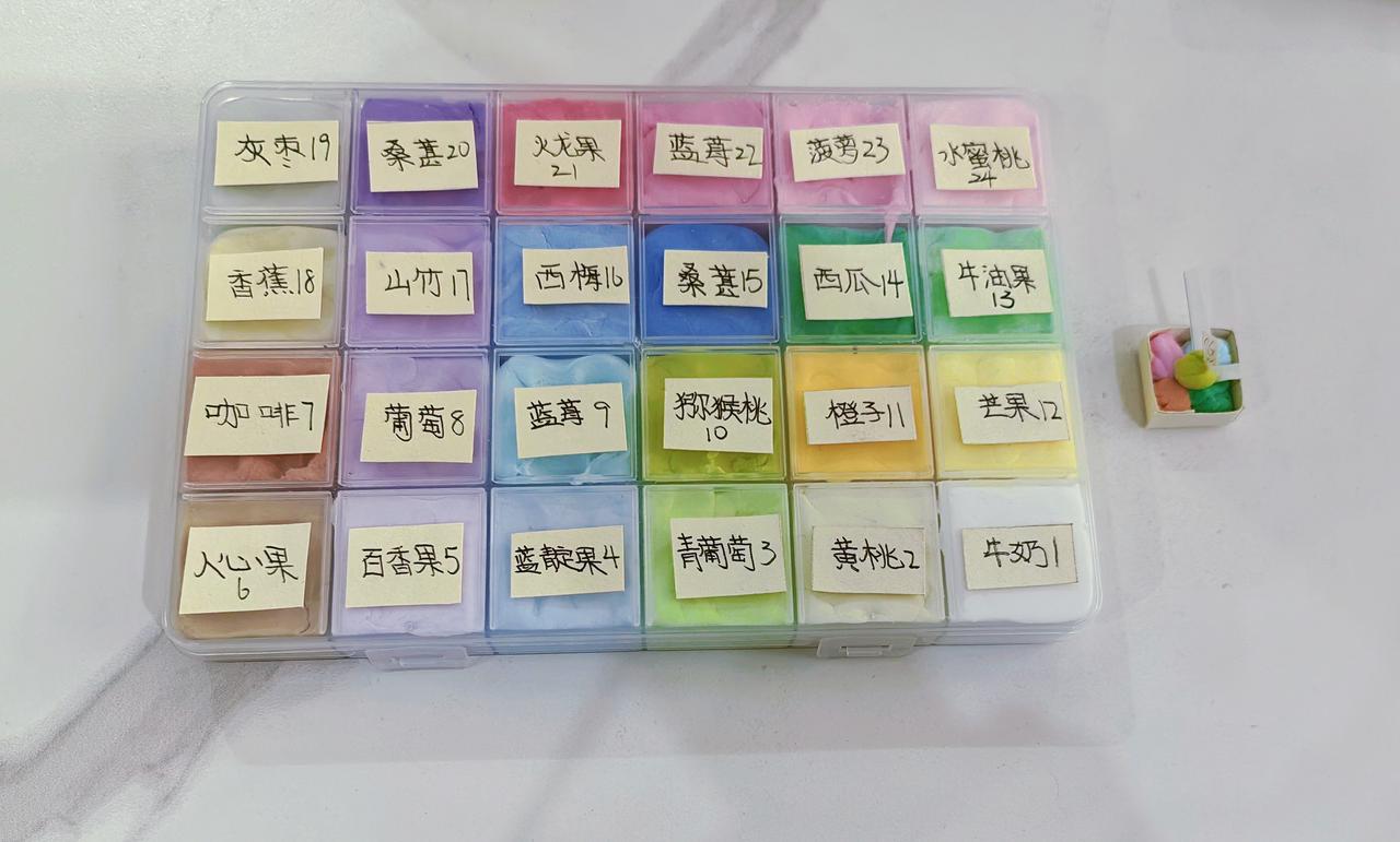 琪同学是真有耐心~ 一堆粘土,拼色多款水果, 说是可以跟我做游戏用。 我点餐,她负责做美味。 好想知道那个6号, “人心果”是个什么果?! 单看颜色和名称,有点吓人~