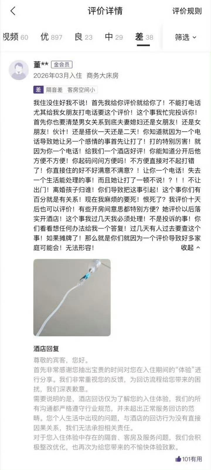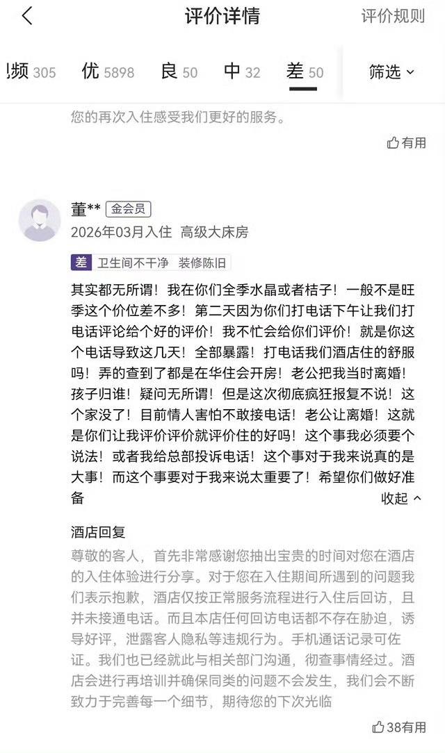 这件事不复杂,一女和情人开房,酒店打了回访电话,导致被老公发现,被老公打了一顿,要离婚,家庭破裂。于是她大骂酒店作恶,给酒店打差评。 从内容来看,第一条差评是她情人发的,第二条差评是她自己发的。 酒店回复说电话并没有接通,那是怎么暴露的呢?难道她老公仅凭电话号码就发现是酒店打来的? 不过,即使出轨被发现,她老公打她也是家暴,财产分割时算老公的重大过错,可以判她老公少分甚至不分财产。 话说回来,商家的回访电话、推销电话确实很烦。