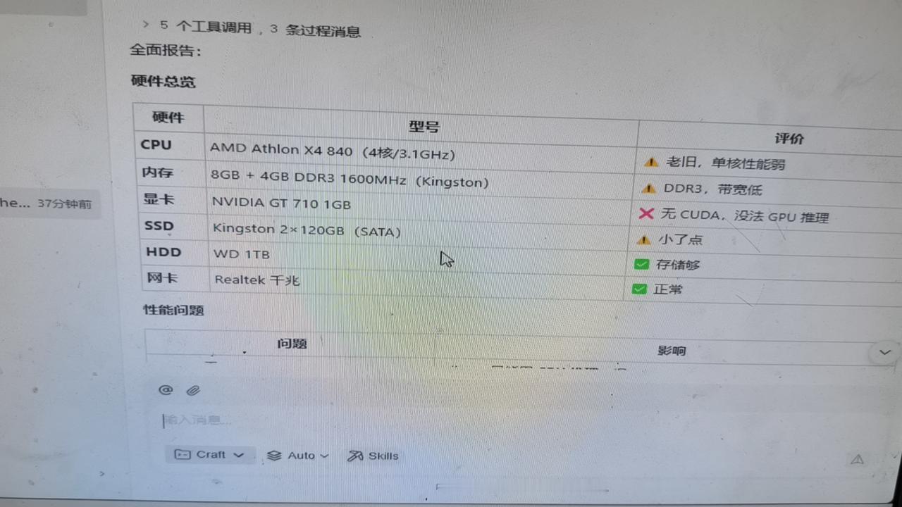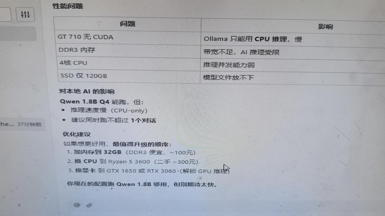 沈阳老电脑安装本地模型太不容易了最近在南方朋友几乎都安装了openclaw或hermes,提高了工作效能,但是在沈阳,很多朋友还没尝试,属于起步阶段,而用了后的直接产生的效果就是: 当地的小程序多了起来了,我们看到的很对APP开发,直接让openclaw就给你开发了,自然在个商业平台使用,这一次东北就落后了,人家每天10000个APP在生产,而沈阳没有APP产出,这是很困惑的事情。 另外就是工作应用,有自动化工具,大家一边喝茶电脑一边干活,节约了时间,提升了生产关系,推动生产力大发展,沈阳不去努力又落后了。 所以,要鼓励都用起来,感受到快捷,与时俱进,这是东北不在落后的关键,千万不能作茧自缚,用满清落后的思想看待先进技术的蓬勃发展,沈阳和东北要加油了!