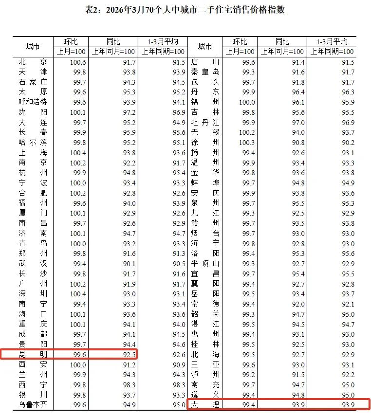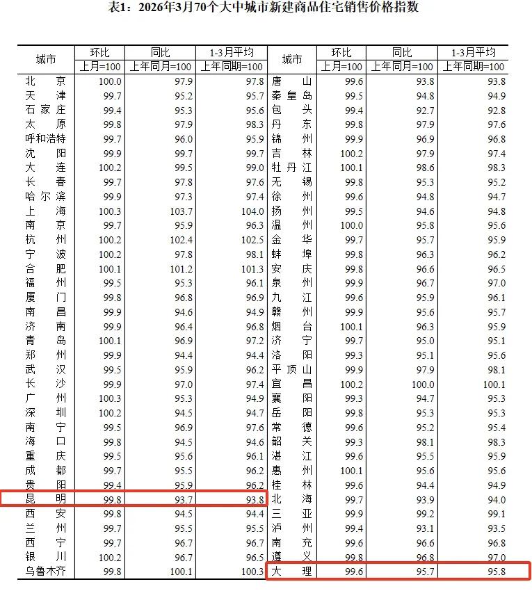 国家统计局4月16日公布的2026年3月房价数据很值得关注。70个大中城市里,一线城市商品住宅销售价格环比上涨,二三线城市环比降幅收窄或持平。新建和二手住宅销售价格环比上涨城市个数都比上月多。 具体来看,3月一线城市新建商品住宅销售价格环比从持平转为涨0.2%,像上海、广州和深圳分别涨0.3%、0.3%和0.2%;二手住宅销售价格环比从降0.1%转为涨0.4%,北京、上海、广州和深圳分别涨0.6%、0.4%、0.2%和0.4%。 二三线城市二手住宅销售价格虽仍下降,但降幅收窄。看来房地产市场复苏动能在持续积聚。至于大理房价如何,还得等更详细数据。 房价企稳回升 全国房价指数 房价周期分析