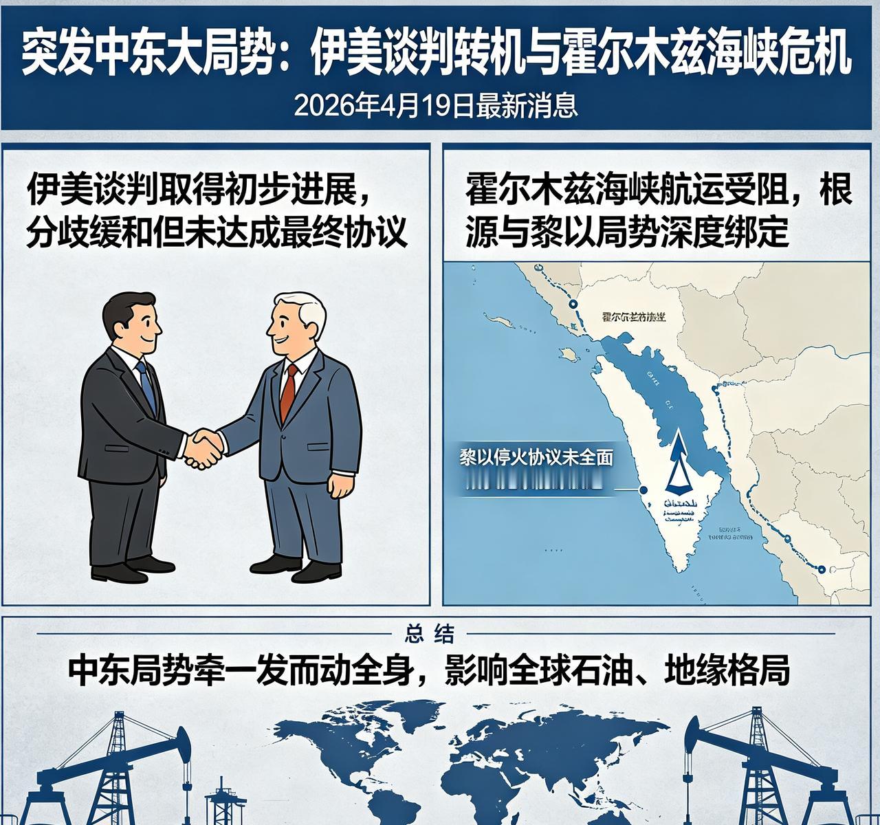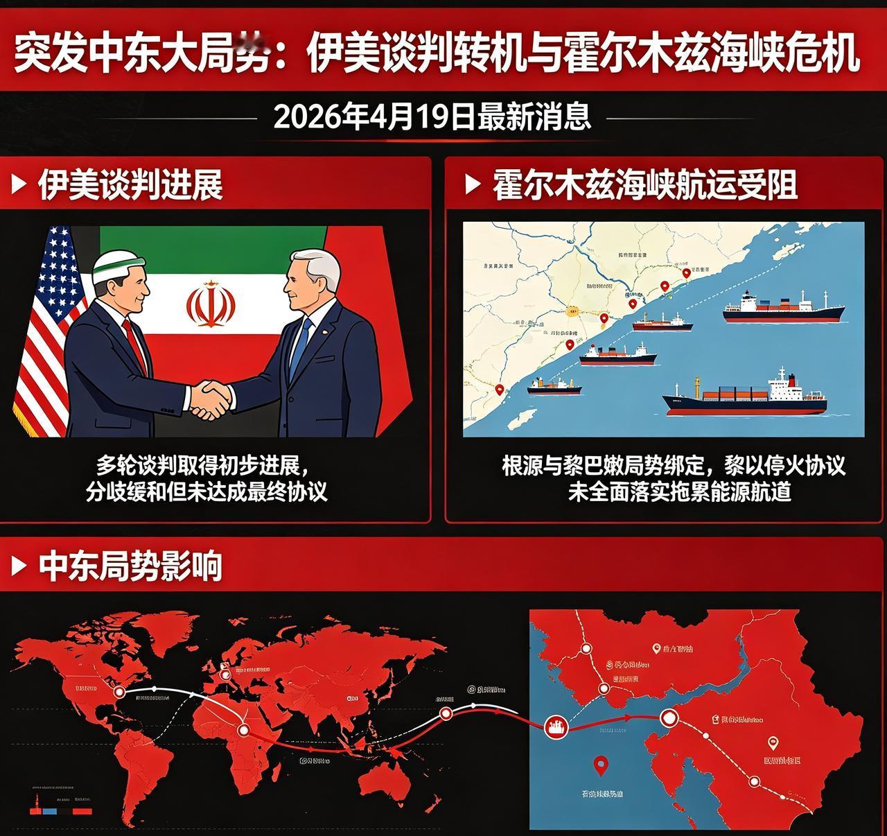 突发中东大局势!伊美谈判迎来转机,霍尔木兹海峡受阻,和黎以局势深度绑定 中东局势 伊朗美国 霍尔木兹海峡 国际热点 2026年4月19日最新消息! 伊朗官方正式官宣:伊美多轮谈判已经取得初步进展,双方分歧有所缓和,不过目前还未达成最终落地协议。 更关键的一点来了! 伊朗方面直言:当下霍尔木兹海峡航运通行受阻,根源和黎巴嫩局势息息相关,黎以停火协议没能全面落实,直接拖累整个中东能源航道稳定。 一边是伊美关系出现破冰苗头, 一边是黎凡特地带战火外溢、航道承压。 中东牵一发而动全身,后续走势或将影响全球石油、地缘格局,持续关注!