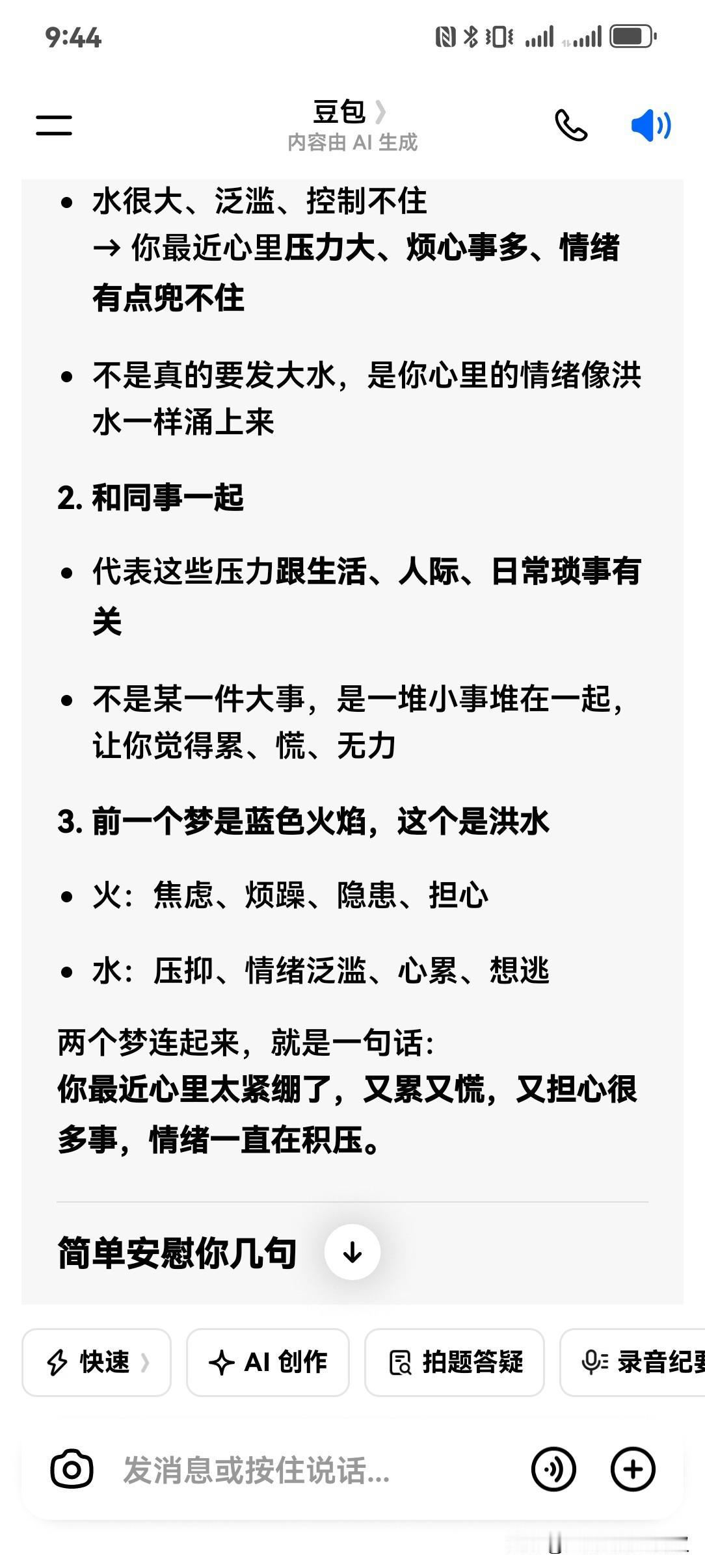 我昨天中午做了一个梦,梦回自己回娘家之后,看见80多岁的外婆一个人站在屋里,我发现房子的墙壁里有蓝色的火焰冒出来。 我就跟外婆说,这是管道漏气了,我就去关闸门,结果又发现屋里很多的地方都有蓝色的火焰,这时候我妈回来了,我就告诉她这管道漏气了,要打119啊! 晚上,我又梦见很多洪水,还有同事和我在一起,我们准备逃离。 我问了豆包,让她帮我分析梦境。 豆包说, 你最近心里压力大、有隐藏的焦虑/不安在悄悄累积,你很想控制但有点无力;同时你很想念外婆和妈妈,潜意识在借她们的形象,给自己找安全感、提醒自己要重视内心的“隐患”,好好照顾自己。 最近,小柚子脖子受伤住院,我真的着急焦虑,看来豆包分析的有道理。 5大焦虑 中年压力焦虑 生活里的小焦虑 焦虑状态异常 遇到焦虑