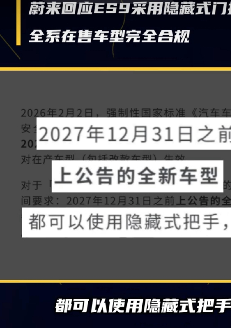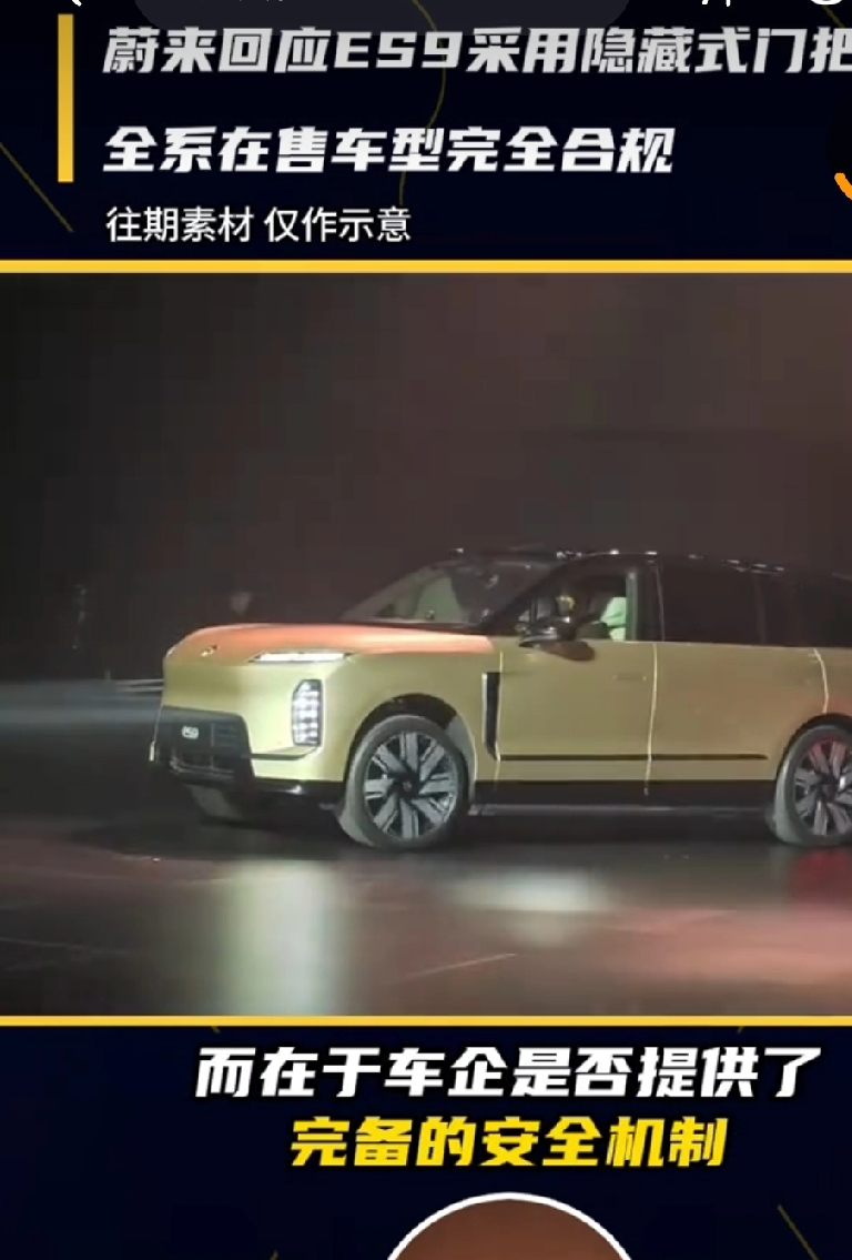 蔚来这回应说白了就是“既要又要”,既想迎合大众需求,又不想打自己之前的脸嘛! 之前蔚来多少年死磕隐藏式门把手,说啥风阻低、颜值高,是高端车标配,结果现在用户吐槽得多了:冬天冻住拉不开、撞车了门把手弹不出来影响逃生,连好多新势力都改回传统门把手了,蔚来这次ES9终于松口用隐藏+可应急开启的设计,还嘴硬说“兼顾美观和安全”,这不就是变相认了之前的设计有漏洞? 其实用户也不是非要揪着之前的问题不放,只要你肯改、真的把安全放在第一位,大家肯定买账。毕竟买车是拿来用的,花几十万总不能为了那点好看的面子,冒关键时刻打不开门的风险对吧?这波蔚来也算听人劝,只要后续实测真的能解决冻住、卡壳的问题,还是挺实在的。