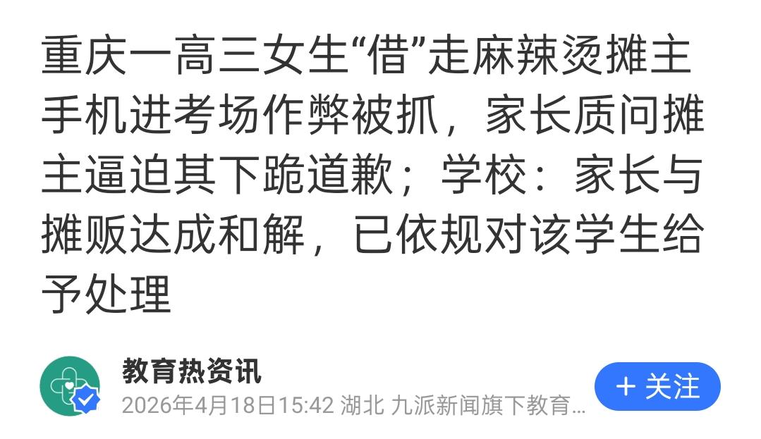 “这一跪,我受不起。”听听,这话说得有多扎心。 一个卖麻辣烫的阿姨,被逼得在自家摊子前跪下,膝盖磕在地上,一遍遍说“我错了”。旁边站着的家长,不但没扶,还来了这么一句。 凭什么?就因为阿姨好心借了个手机。 一个高三女生,天天来吃麻辣烫,跟摊主混熟了。某天说“我要网考”“借个手机打个电话”,阿姨想都没想就递过去了。 结果呢?这姑娘转头就把手机带进考场,作弊。 被抓现行之后,她不反思自己怎么干出这种事,反而回家闹、以死相逼,把锅全甩给那个啥都不知道的麻辣烫阿姨。 更离谱的来了——家长听完女儿的“版本”,不是先问问“你到底做没作弊”,而是直接冲到摊位上,指着阿姨一顿输出: “我女儿要10万,你也给吗?”逼人下跪,还要嘲讽。我就想问一句:你女儿作弊,关人家卖麻辣烫的什么事? 手机是你女儿骗走的,试是你女儿自己考的,作弊是你女儿自己干的。摊主招谁惹谁了? 说白了,这就是典型的“我孩子没错,错的是全世界”。 作弊被抓,正常家长第一反应是什么?是脸红、是道歉、是回去好好教育孩子。 可这位家长倒好,第一时间冲到外面找人背锅。这是什么三观? 更让人心寒的是后续,学校发通报说“双方已自行达成和解”。和解?谁跟谁和解? 是家长跟摊主道过歉了,还是阿姨下跪这事就这么翻篇了?通报里一个字没提。 倒是阿姨后来跟记者说了句话,听完心里特别不是滋味:“以后再也不随便借东西给学生了。” 你看,一个本来好心的人,被逼得把善意收回来了。 这损失的,不是一个摊主的信任,而是整个社会里,人与人之间那点最后的温度。 高考在即,这个女生马上要走进更大的考场。但比分数更重要的,是一个人敢不敢为自己做的事负责。 如果连作弊都能理直气壮甩锅给别人,那以后走上社会,还能指望她扛什么? 最后说句实在的:那位家长,你女儿要的不是10万块钱,而是一个能教会她“错了就要认”的家长。 可惜,你给她的,是另一堂课,只要够凶,就能把错推给别人。”这堂课,可比作弊严重多了。