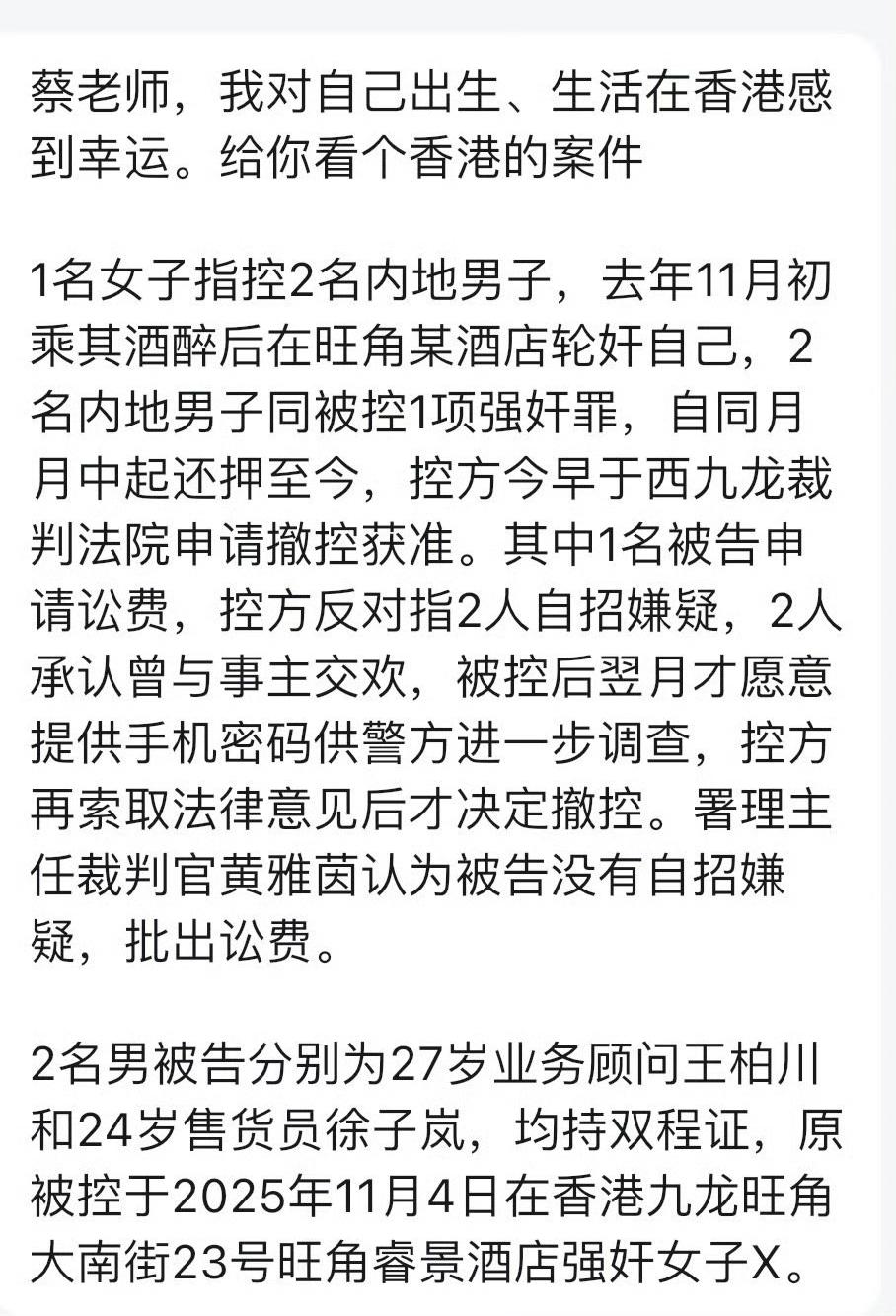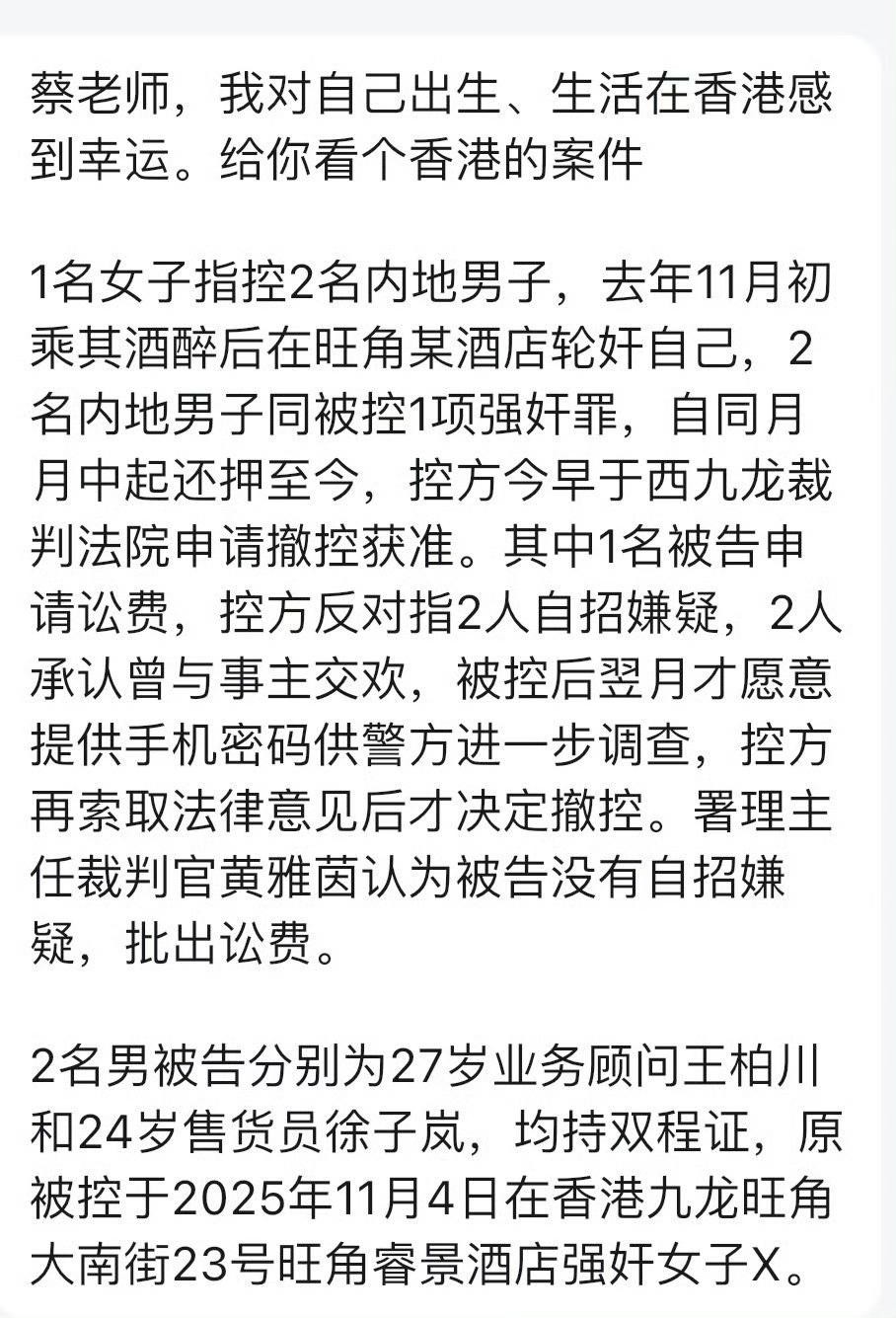 一香港女子报警称醉酒后遭两名内地男子强奸、拍裸照。只要女生醉酒报警,类似的案例在内地只怕两个男生要牢底坐穿了,可是香港警方经过两个多月的调查,最终让两名男生无罪释放了。 两名男生被抓后都喊冤枉,说和男女方发生性关系是自愿的。11月4日他们入住香港旺角睿景酒店,在一间房内其实是两男两女,从监控看受害女子行动自若,并没有表现出任何异常。在房间内,当事另一女子的证言,也证实女子并没有被暴力胁迫,双方发生关系系自愿。 他们是币圈同行,在香港聚会是相互交流币圈投资心得,事后开房也是双方同意的。警方在女子身上未找到任何伤痕,在查找两方的手机聊天记录,证实系利益纠纷问题,所有证据都指向双方无强奸事实,最终本着疑罪从无,无罪推定的原则,释放了两名男生。