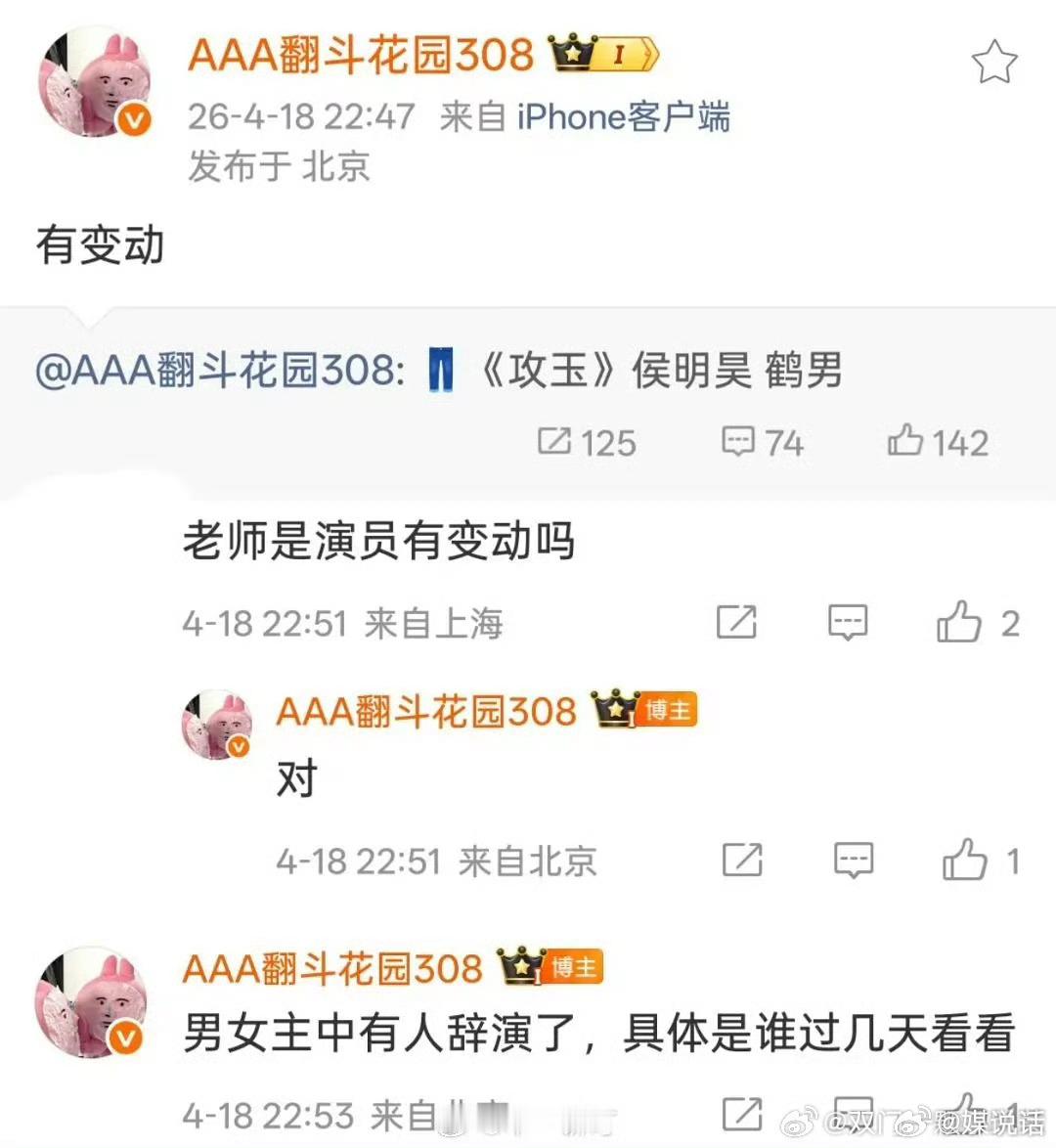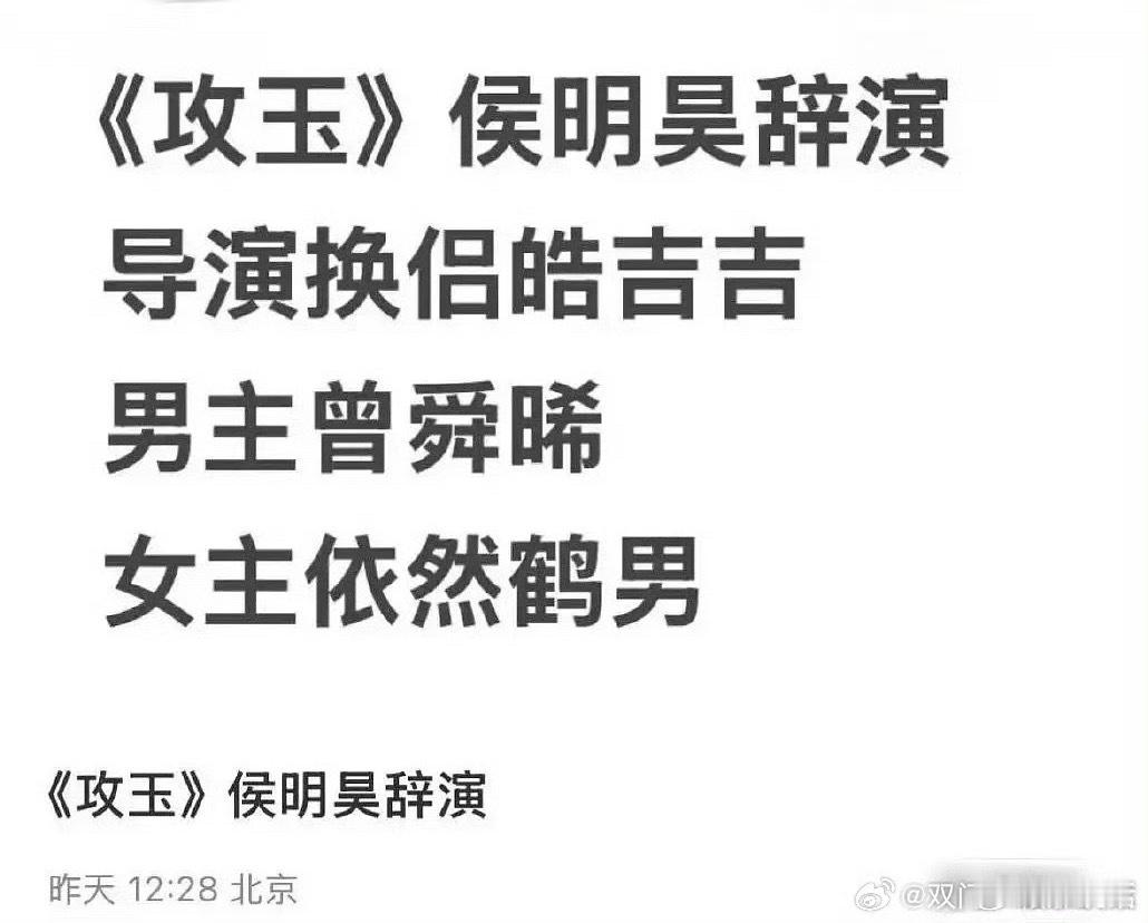 攻玉 辞演 侯明昊粉丝因为女主是鹤男吵了几个月,现在男主换成曾舜晞了?导演如果换侣皓吉吉,他最近三部作品评分🈶《子夜归》6.6《江湖夜雨十年灯》5.5《冰湖重生》3.2