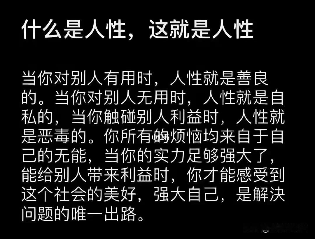 真正厉害的人,都是在反着人性做事:1、人性的丑陋,就是专在善良人身上挑毛病。 这世间的人心,常常是偏着长的。你越是善良、越是心软、越是好说话,旁人越爱在你身上挑刺、找毛病、蹬鼻子上脸;反倒是那些厉害、强硬、不好惹的人,大家反而客客气气、小心翼翼。社会就是这么现实,没有实力的善良,一文不值,没人会为你的心软买单,人人都在见人下菜碟。你想在这世上安安稳稳站住脚,第一条,就是先收起廉价的同情心。在你不够强、不够有底气之前,别随便伸手拉人,别轻易心疼谁、可怜谁,不然最后被拖下水的,只会是你自己。 2、永远记住别人最坏的样子,那才是真面孔。 平日里客客气气、说说笑笑,你好我好大家好,那都不算数,不过是成年人之间体面的表演。真正能看清一个人,要看他发火时的模样,要看利益冲突时的选择,要看他走投无路时的嘴脸。那些暴躁、自私、冷漠、算计的样子,虽然难看,却是他最真实的底色。把这一幕牢牢记在心里,别被平时的温柔蒙蔽,你才不会在关键时刻看错人、信错人、被人狠狠捅一刀。 3、认知的边界,就是你赚钱的边界 人这辈子,能挣到多少钱,从来不是看运气,而是看认知。你的眼光能看多远,格局能撑多大,对世事的理解有多深,你才能接住多大的财富。很多人总说自己错过机会,房价没赶上,黄金没上车,机会来了不敢动,风口来了看不懂,看似是运气不好,实则是认知没到。脑子没到那个层次,就算钱送到手边,你也抓不住;认知提上去了,财富自然会顺着你的思路流过来。 4、一定要小心,那些突然升温的友情。 这世上没有无缘无故的亲近,也没有平白无故的热情。一个人原本平平淡淡,忽然对你热情似火、嘘寒问暖,一口一个朋友,一口一个兄弟,你千万要当心。他多半不是真心欣赏你、喜欢你,而是在你身上看到了可利用的价值,想从你这里捞点好处。别傻乎乎一头扎进去,最后被人卖了还帮着数钱,变成别人向上爬的垫脚石。 5、别人发来的信息,永远不要秒回。 秒回信息,看似热情,实则容易掉价。别人会觉得你整天无所事事,很闲、很空、很卑微,连带着你说的话、你表的态,都会被人看轻,不被当真。哪怕你第一时间就看到了,也稍微沉一沉、等一等,不慌不忙再回复。这样一来,你的话反而更有分量,更让人重视,也更显得你稳重、有底气。 6、真诚,才是最高级的套路。 耍心机、玩套路、藏心眼,也许能赢一时,却赢不了一世。真正能打动人、能稳住人心的,说到底还是真诚。但这份真诚不是傻实在,不是全盘托出,而是让人摸不透你的手段,却能实实在在感受到你的真心。最高级的处世方式,就是让人看不透你,却又愿意相信你;猜不准你的下一步,却敢放心跟你打交道。真诚到极致,便无人能敌。 7、落井下石最狠的,往往都是身边人。 陌生人根本不在乎你过得好不好,你高升也好,落魄也罢,跟他们毫无关系。反倒是身边的熟人、朋友、亲戚,最见不得你好。你一倒霉,最先笑话你、踩你一脚、往你身上扔石头的,多半是这些人。所以对陌生人,你反而可以稍稍放松一点;对身边人,一定要多留个心眼,别完全信任,别掏心掏肺。最后出卖你、伤害你、让你痛不欲生的,往往就是你最亲近的人。 8、对待任何人,都要保持距离,守住边界。 不管面对谁,都别一下子把自己全盘亮出来,喜怒哀乐、心思盘算,全摆在脸上。成年人最体面的相处,是看破不说破,是懂分寸、知进退,是不远不近、不冷不热。保持好边界感,不轻易戳破别人,也不轻易暴露自己,既是给别人留面子,也是在保护自己不受伤。靠得太近,都是灾难;保持距离,才是长久。 9、真正厉害的人,都是在反着人性做事 人性本就贪图舒服、喜欢即时满足,想立刻看到结果,想马上得到回报。而真正的高手,偏偏逆着人性来。欲望越强,越懂得克制;目标越大,越能沉住气;越想成大事,越愿意延迟满足。他们不追求一朝一夕的效果,不眼红小恩小惠,而是以年为单位沉下心做事,默默扎根,让时间一点点产生复利。熬得住寂寞,扛得住诱惑,最后才能站得最高。 10、人和人之间,从来没有真空地带。 别幻想什么和睦相处、彼此体谅、你敬我一尺我敬你一丈,那都是理想中的场面。现实里的人际关系,从来都是不断试探、不断挤压、不断博弈。你退一步,别人就进一步;你让一分,别人就会再逼一分,不断压缩你的空间,不断试探你的底线。人与人之间,本就是一场持续的较量,你弱他就强,你软他就硬,不斗争、不坚守,最后只会被人吃得干干净净。看懂人性少纠结 九句看透人性 更能懂人性 人性显恶 这就是人性铁律 莫深究人性 九条人性识人术 反人性法则 人性本质的丑恶 人性善论 看懂人性不吃亏 人性极端的背后 人性黑暗法则 人性善恶规律 高手人性