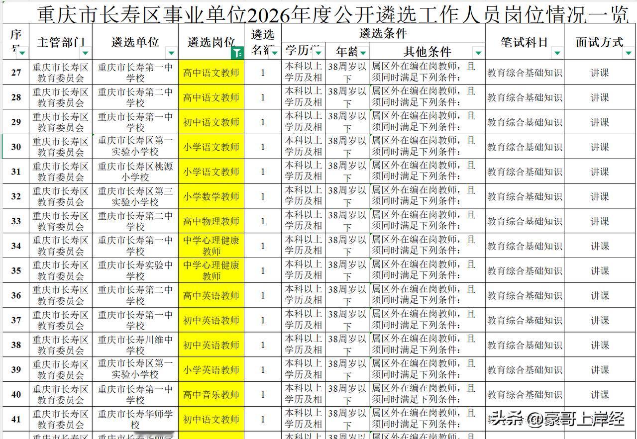 本科就行了,长寿遴选教师的要求也没有想象中的那么高,而且考上就可以转事业编成功调动… 长寿区事业单位公开遴选 43 人,其中教师岗17人。只有机关 / 事业单位在编在岗的公务员、参公、事业编(非工勤)能报,本科学历就行,5 月 6 日 —5 月 10 日 报名、考笔试 + 面试,考上转事业编调动 笔试:只考《教育综合基础知识》面试:全部采用 讲课形式,想要参加这次长寿教师遴选的老师注意,报考的时候可以优先选 限制多的岗位:比如华师学校的岗位(区外 + 荣誉要求),符合条件的人少,竞争更小