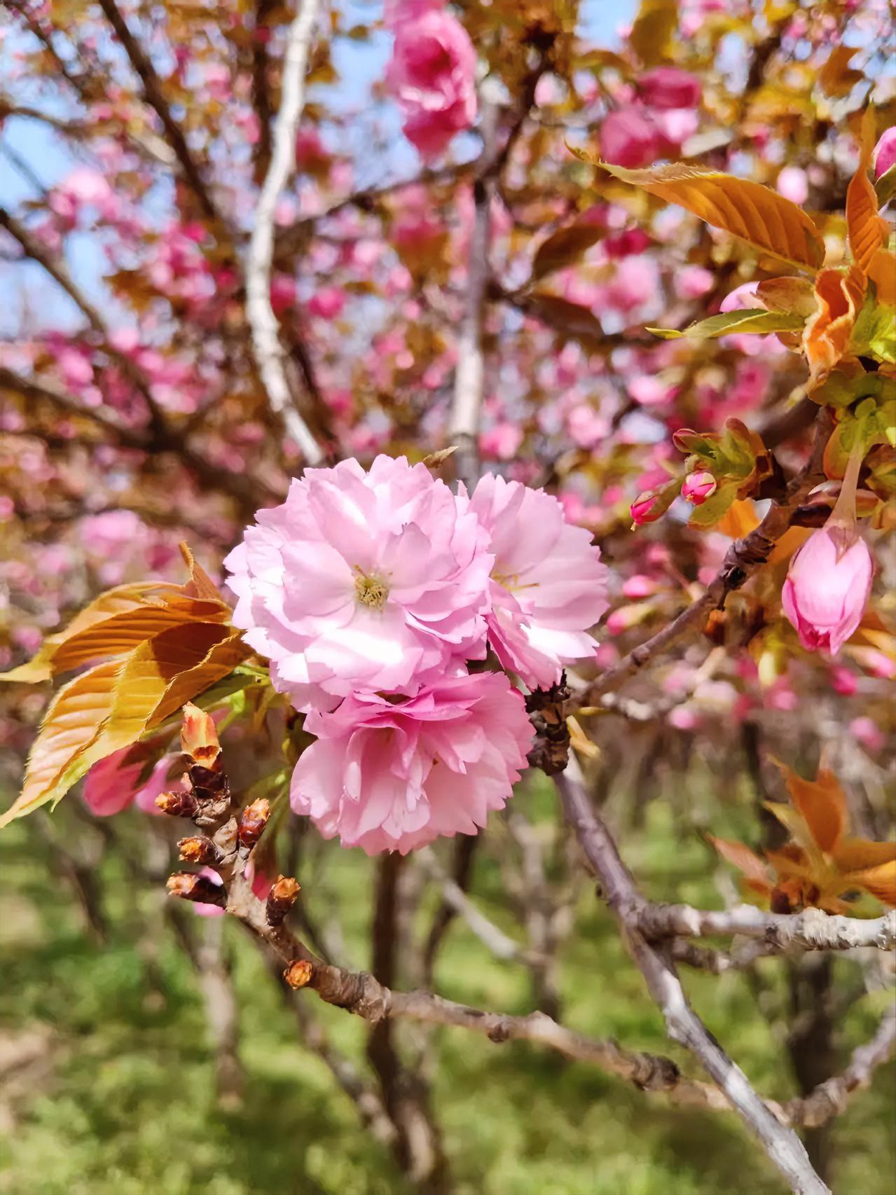 走在公园偶遇这片晚樱,一下子就被戳中了!和春天里常见的单瓣早樱不一样,这种重瓣晚樱花瓣层层叠叠的,粉得软乎乎的,看着就特别温柔。 最妙的是花和新叶一起长,粉花配着带点红褐的嫩叶,层次一下子就出来了。抬头是蓝天,低头是草地,满树繁花看着就让人心情变好,这才是春天该有的样子啊! 你觉得这种花叶同放的晚樱,和光秃秃的早樱比,哪个更戳你?