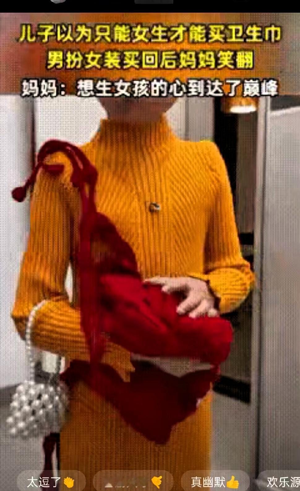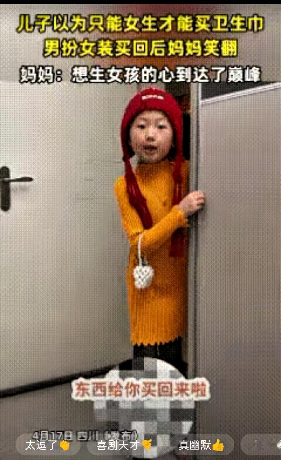 “简直了!”女子来大姨妈,家里却没有卫生巾了,她让儿子去给自己买一包回来,儿子以为卫生巾只卖给女性,担心自己去买不合适,就悄悄穿上了家里女性的衣服,把自己打扮好才出门。 回到家时,孩子戴着红帽子,穿着女式毛衣、丝袜和鞋子,怯生生地把东西递给妈妈。妈妈看到这一身装扮又好笑又疑惑,问清楚之后才明白,孩子是出于顾虑才这样做,于是耐心跟他解释,男生帮家人买卫生巾很正常,并没有性别限制。 很多人看到这段视频,第一反应都是觉得可爱又有趣。但在好笑之余,更让人心里一暖的,是孩子这份朴实的孝心。他没有嫌麻烦,也没有找借口推脱,只是单纯想帮妈妈解决难题,哪怕用了一种略显幼稚的方式,也足够真诚。 这件小事也让人感受到,孩子的善良往往很直接。他们不会想太多复杂的眼光和议论,只知道家人需要帮助,就愿意主动站出来。同时也提醒家长,对孩子进行正常的生理知识普及很有必要,不必让孩子对日常用品产生不必要的顾虑。 懂得体贴父母、愿意主动分担的孩子,本身就很有教养。生活中的温暖,常常藏在这些不起眼的小事里。没有刻意煽情,也没有夸张情节,却最能打动人心。这样朴实又懂事的孩子,也让不少人想起了自己成长中的暖心瞬间。