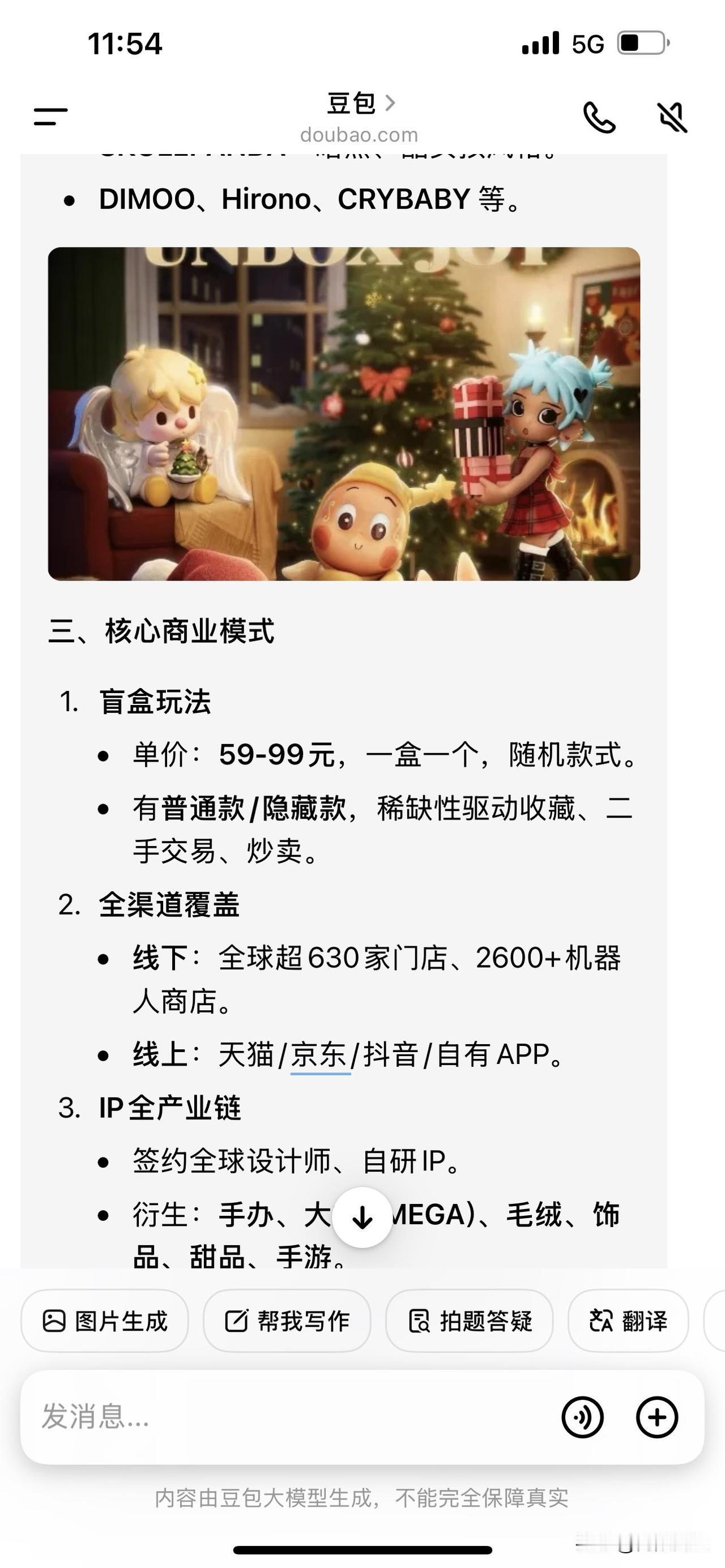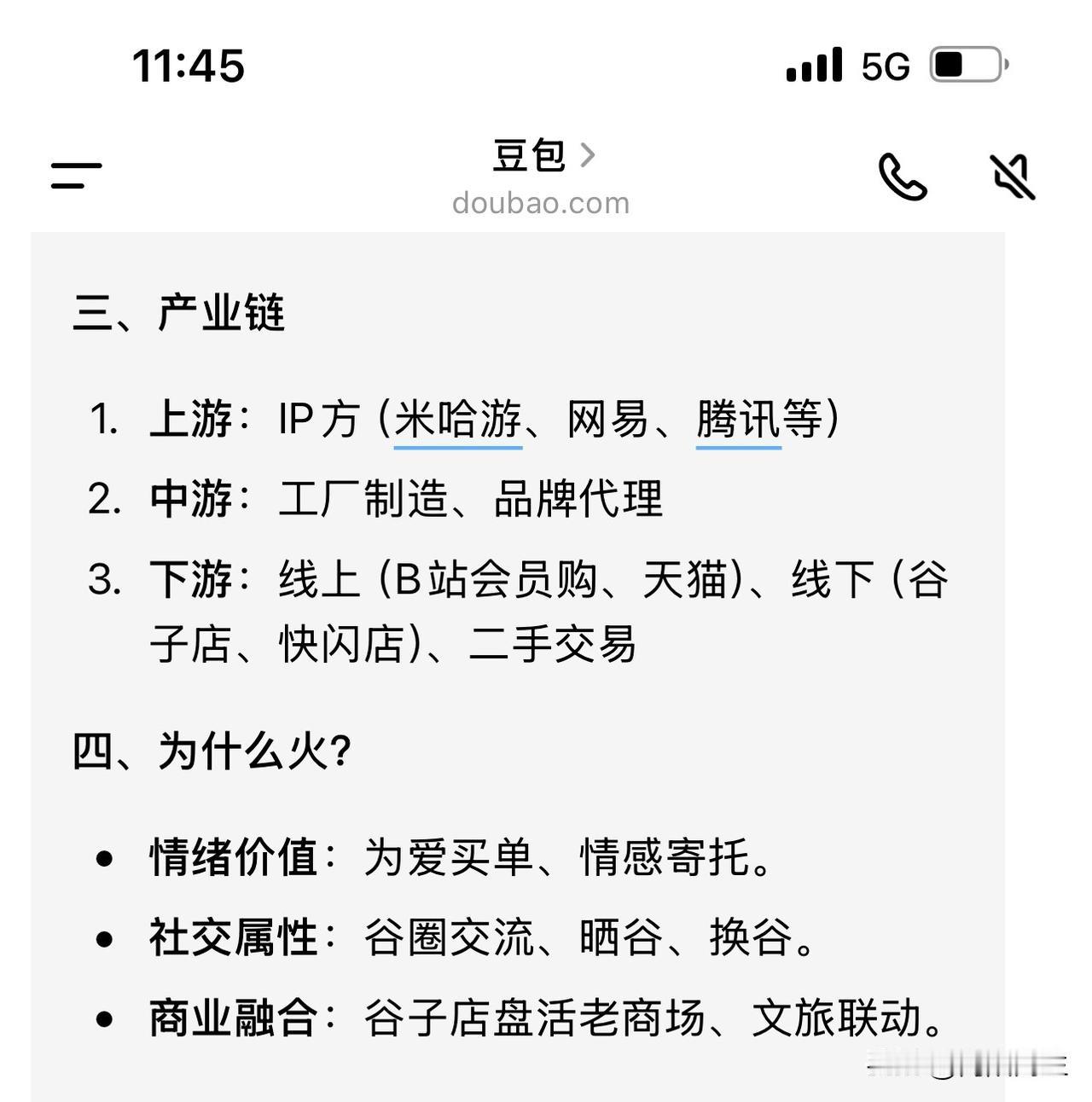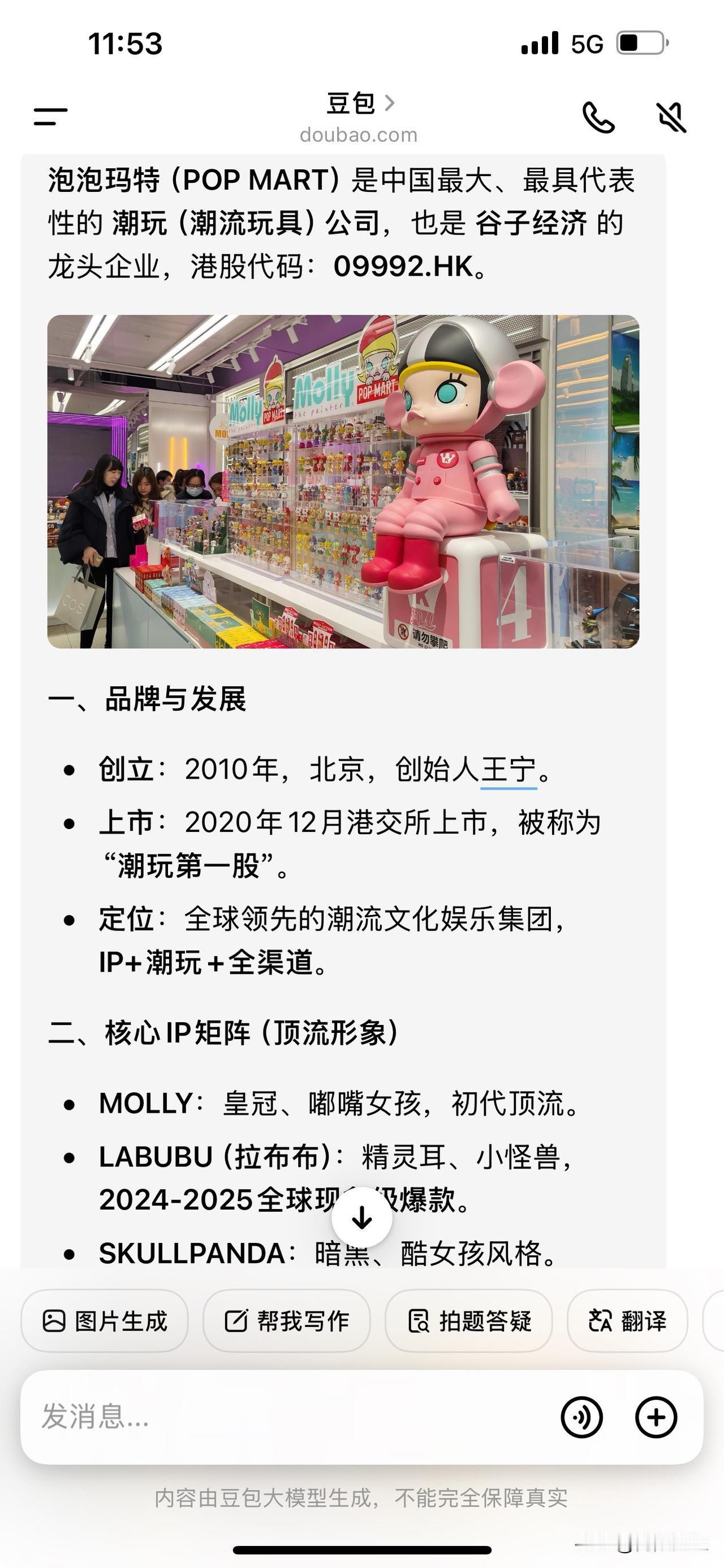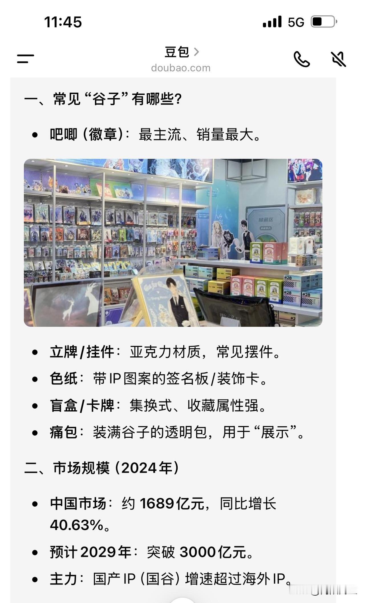 现在的孩子为啥都喜欢这种二次元的东西,说是玩谷子。 大闺女和她的同学去逛谷子店了,老娘我找个咖啡馆喝咖啡等她。 我也上豆包查了一下啥叫谷子。 难怪泡泡玛特市值那么高,看看这市场发展速度,真是想不赚钱都难。